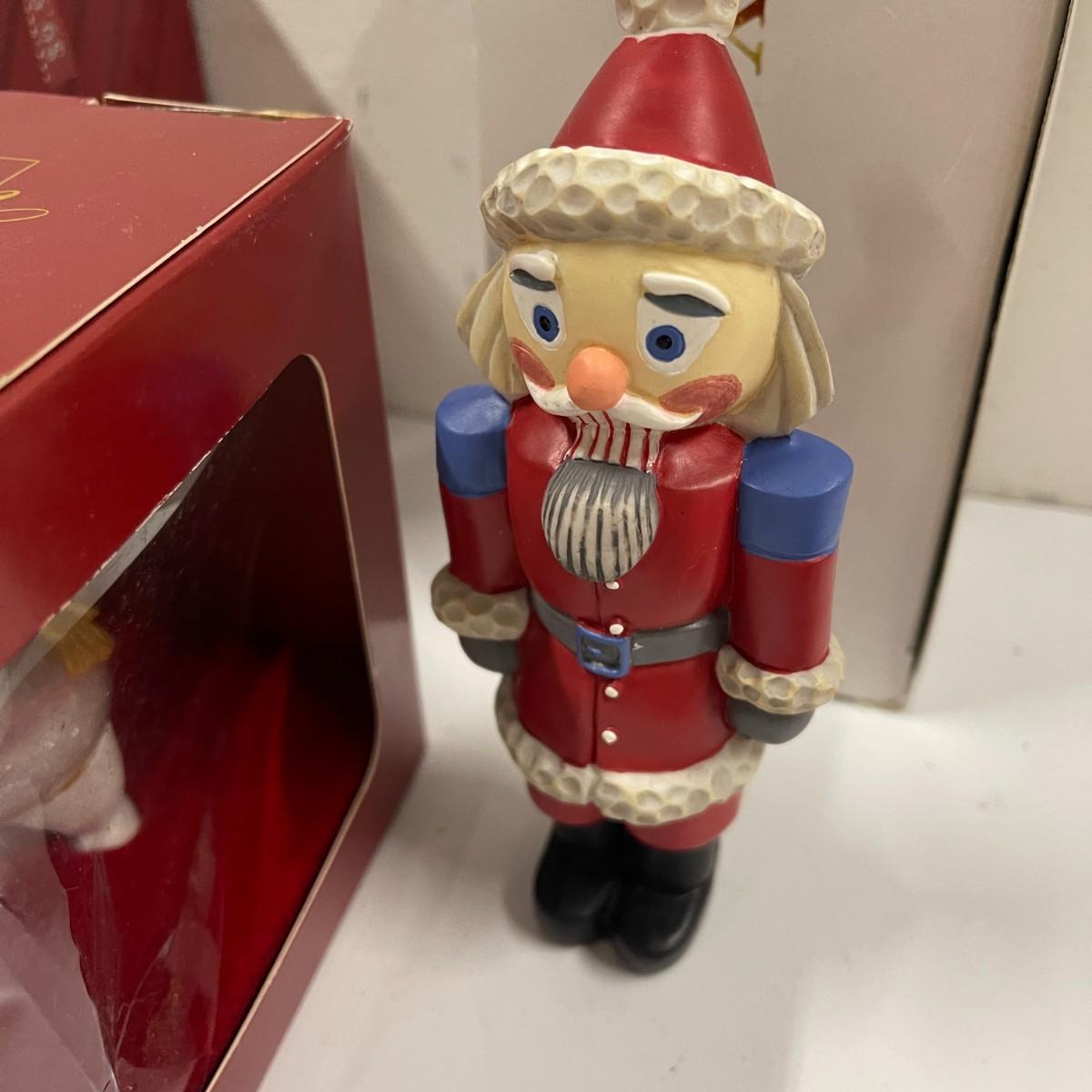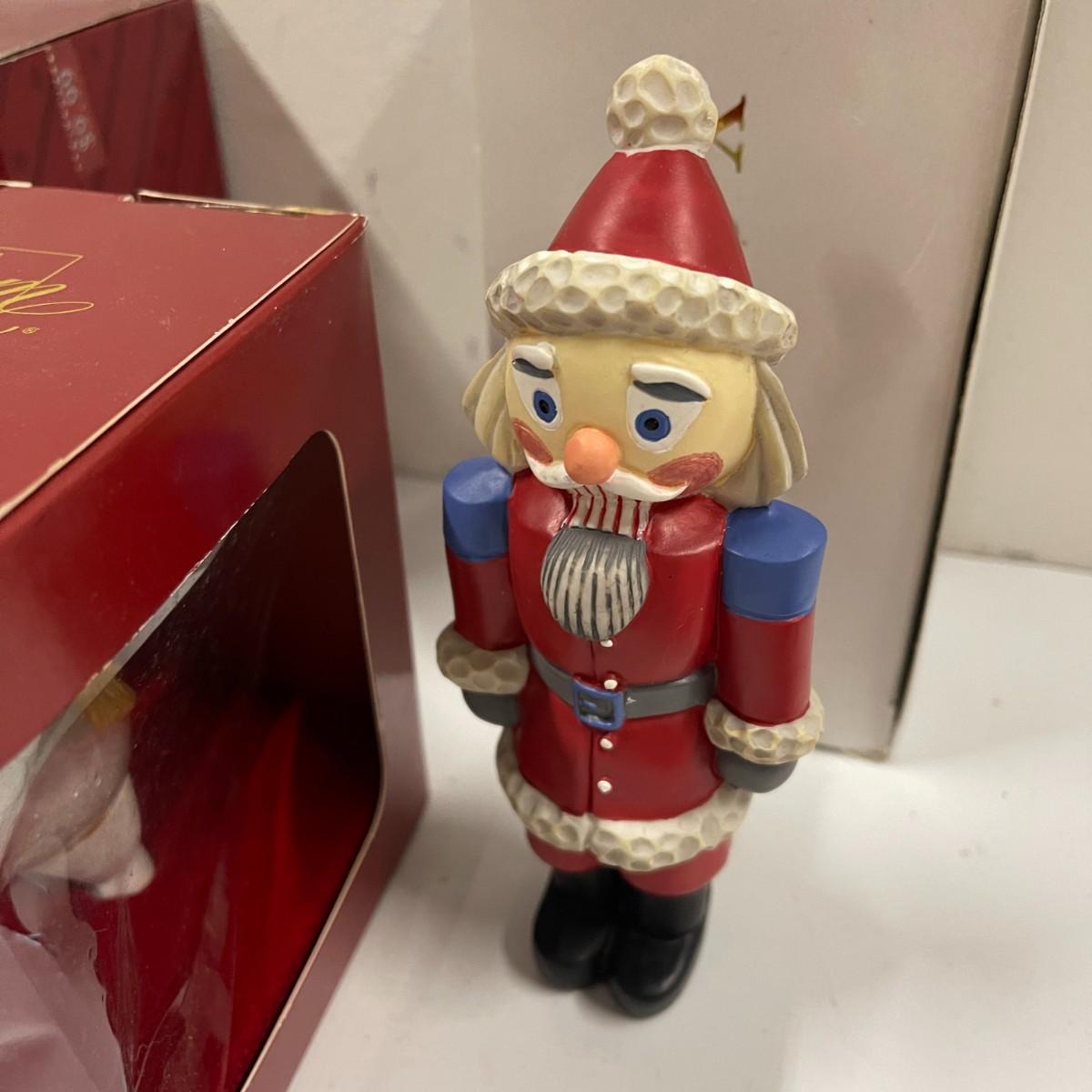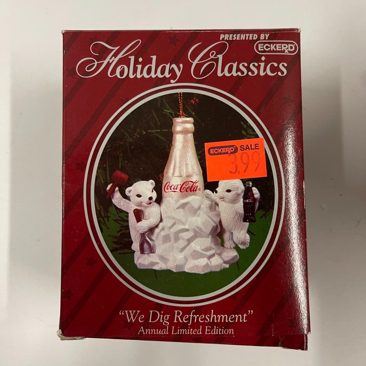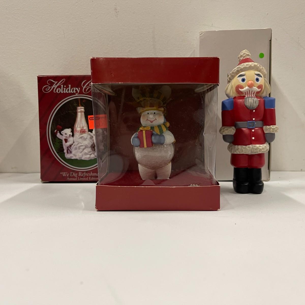 All in original boxes. Gorham: Winter Follies snowman with snow ornament, Lenox: The Collector's Treasury of Santas 1996, Coca Cola: We Dig Refreshments.