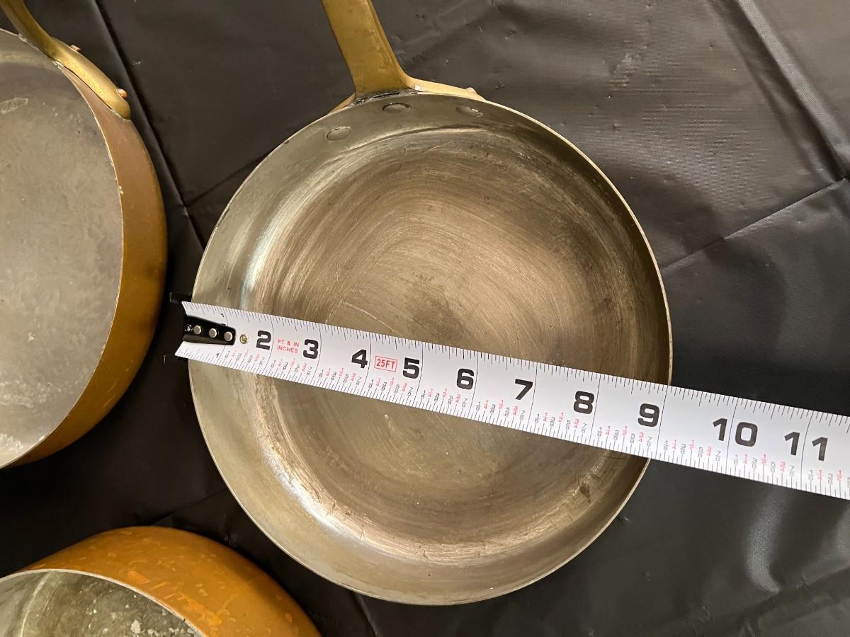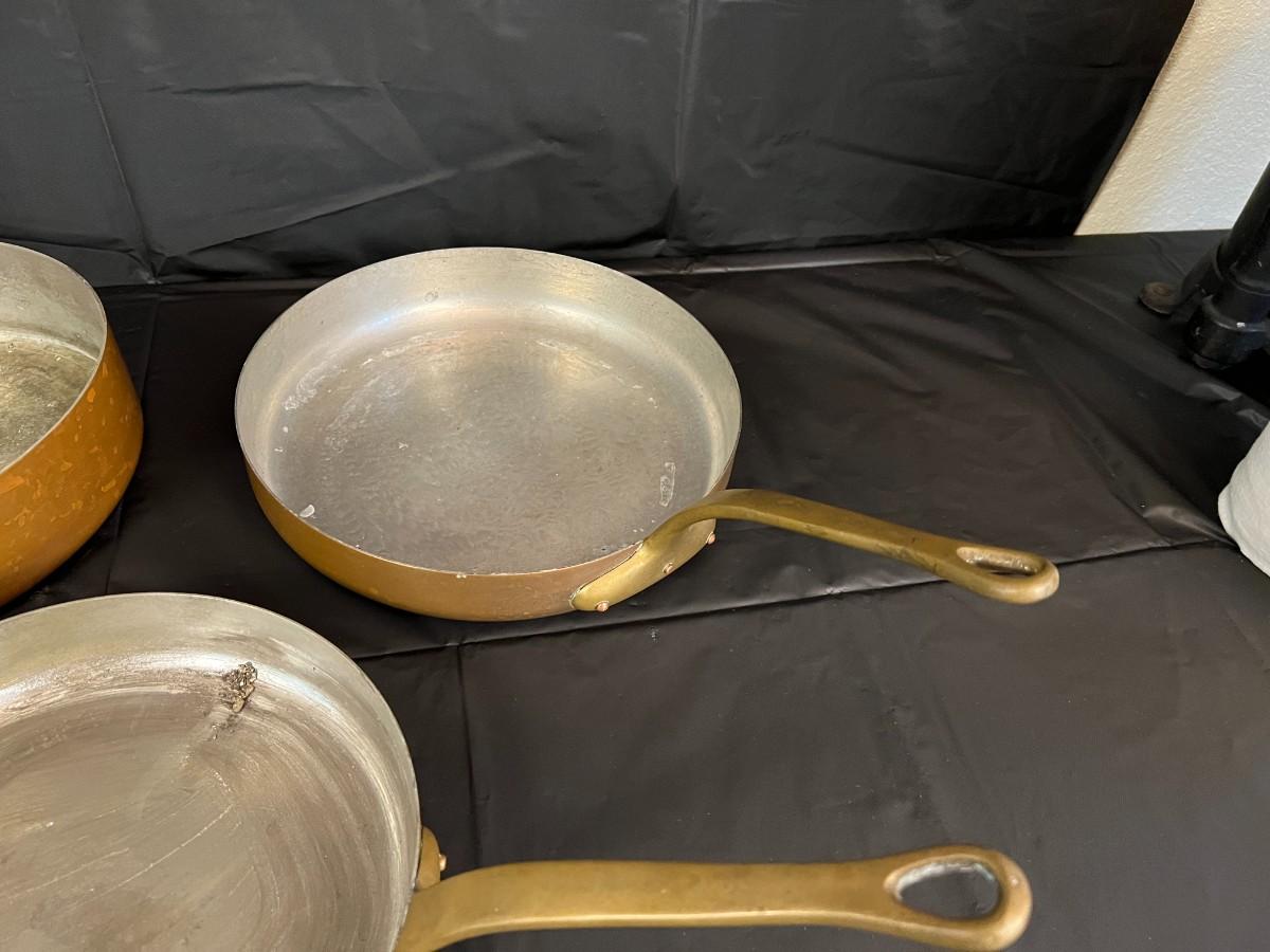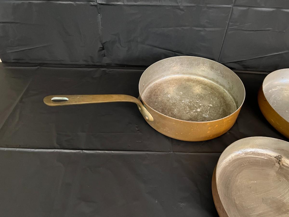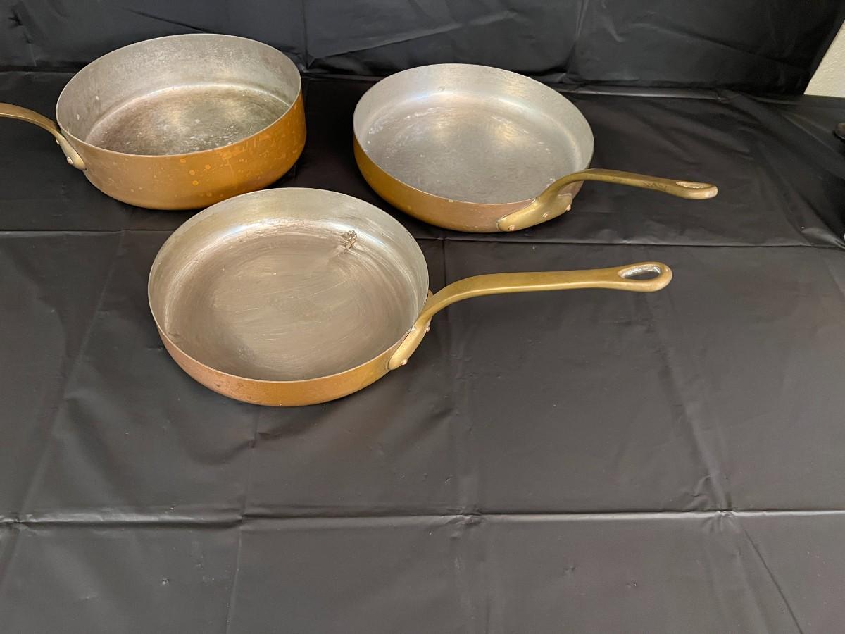 Lot of 3 Copper Pans with Brass Handles, one pan has a stamp that says Made in France. All made in similar style. One has metal unevenly applied inside the pan (shown in images). Condition as shown.