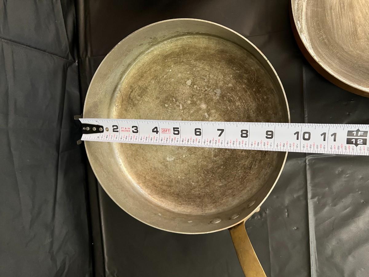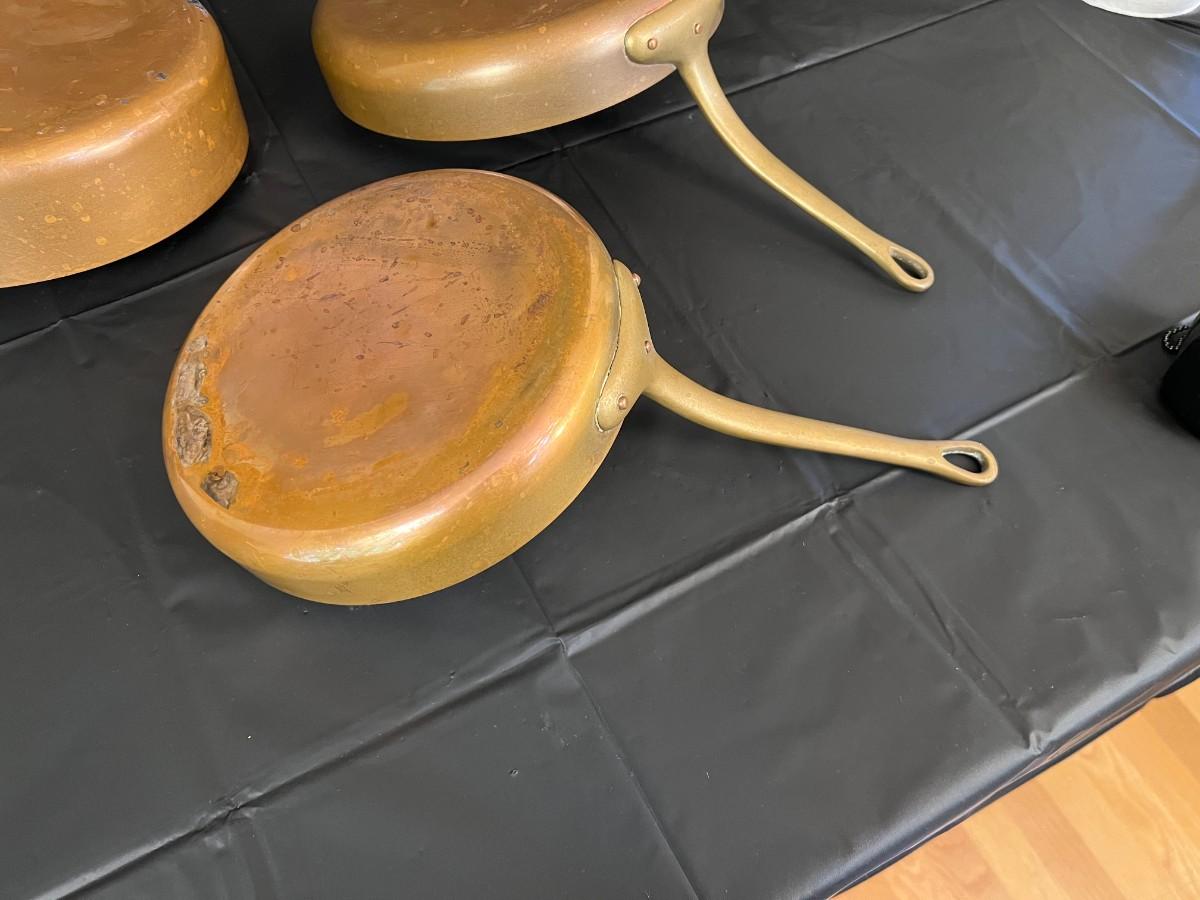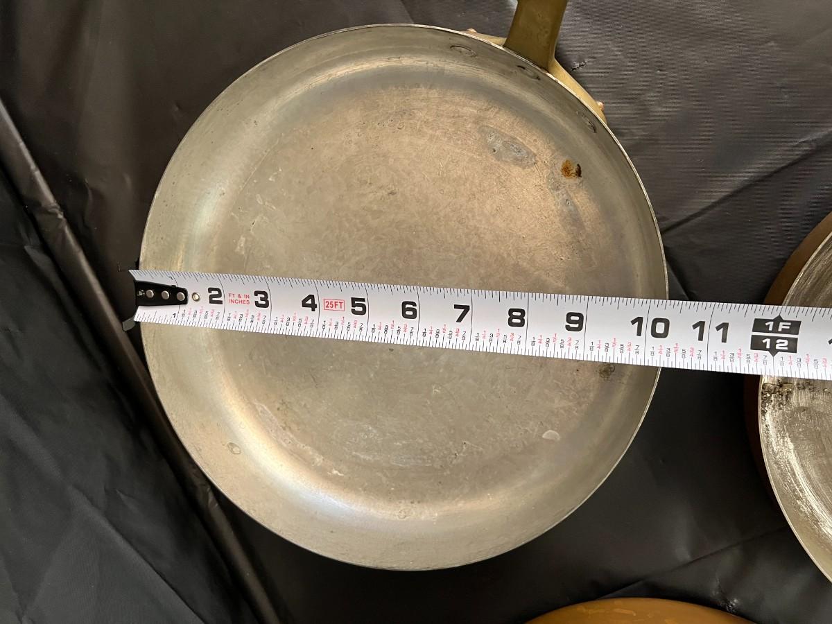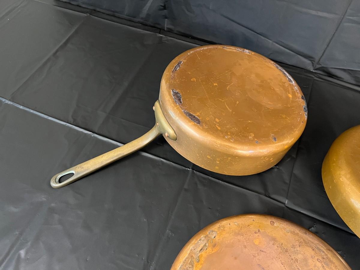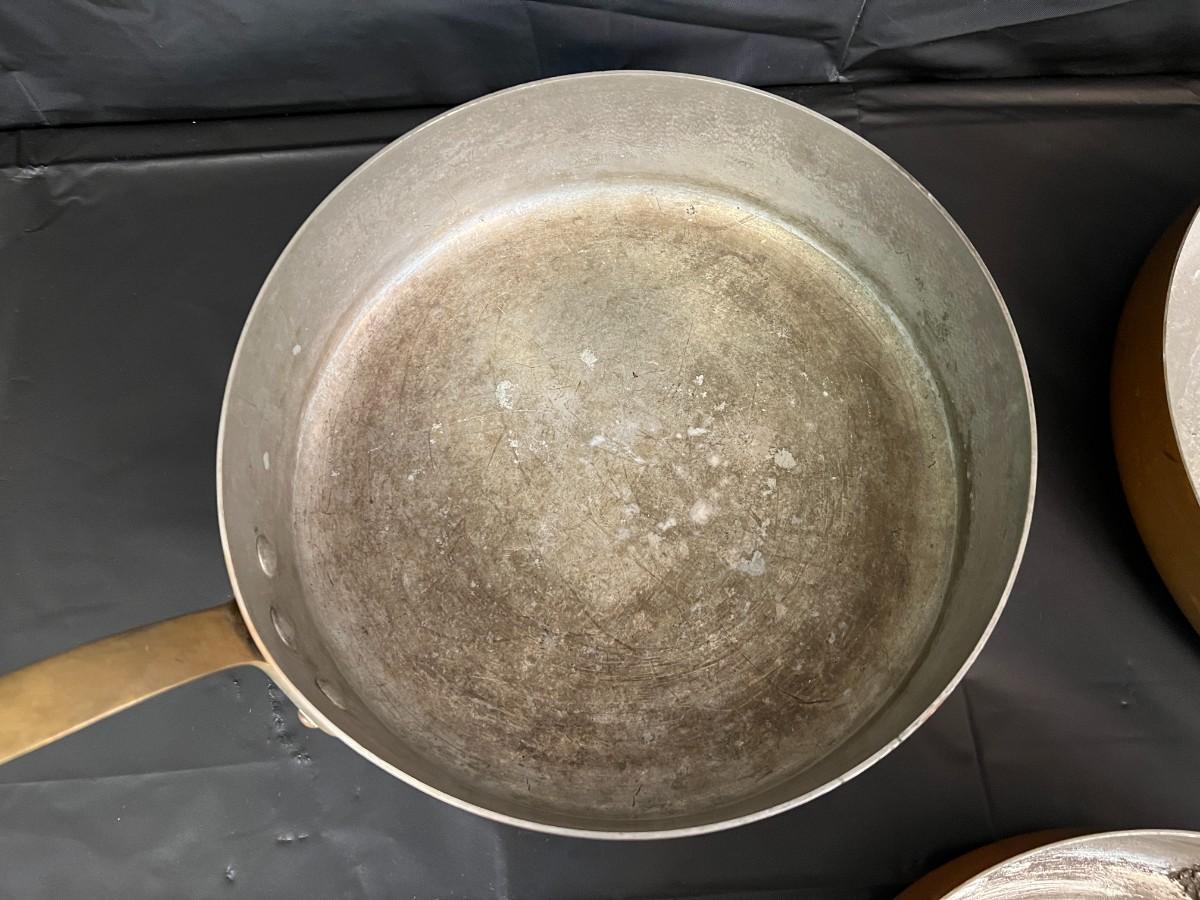 Lot of 3 Copper Pans with Brass Handles, one pan has a stamp that says Made in France. All made in similar style. One has metal unevenly applied inside the pan (shown in images). Condition as shown.