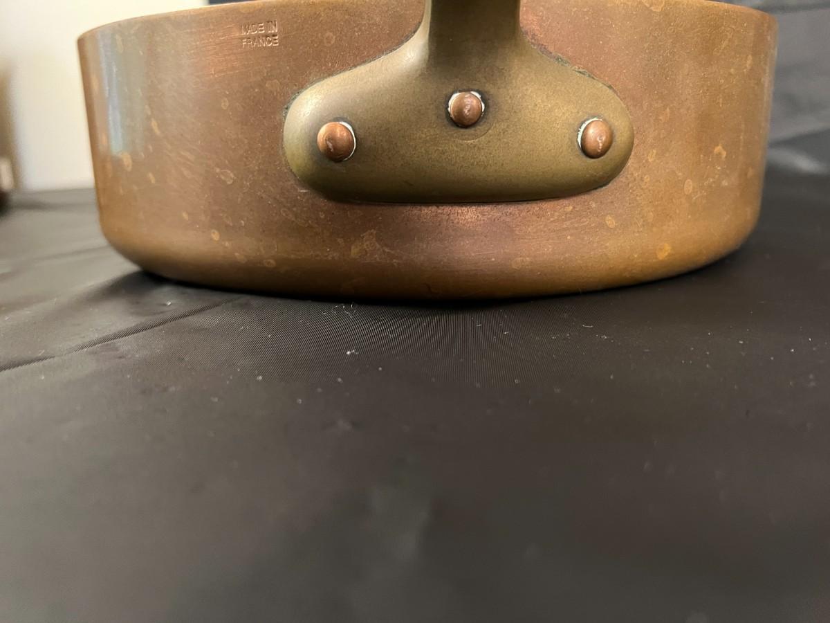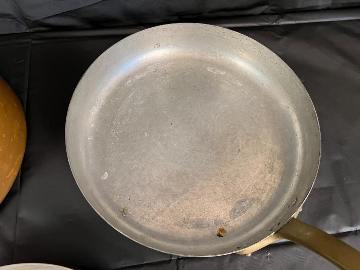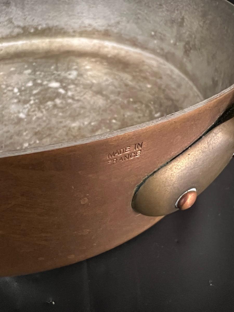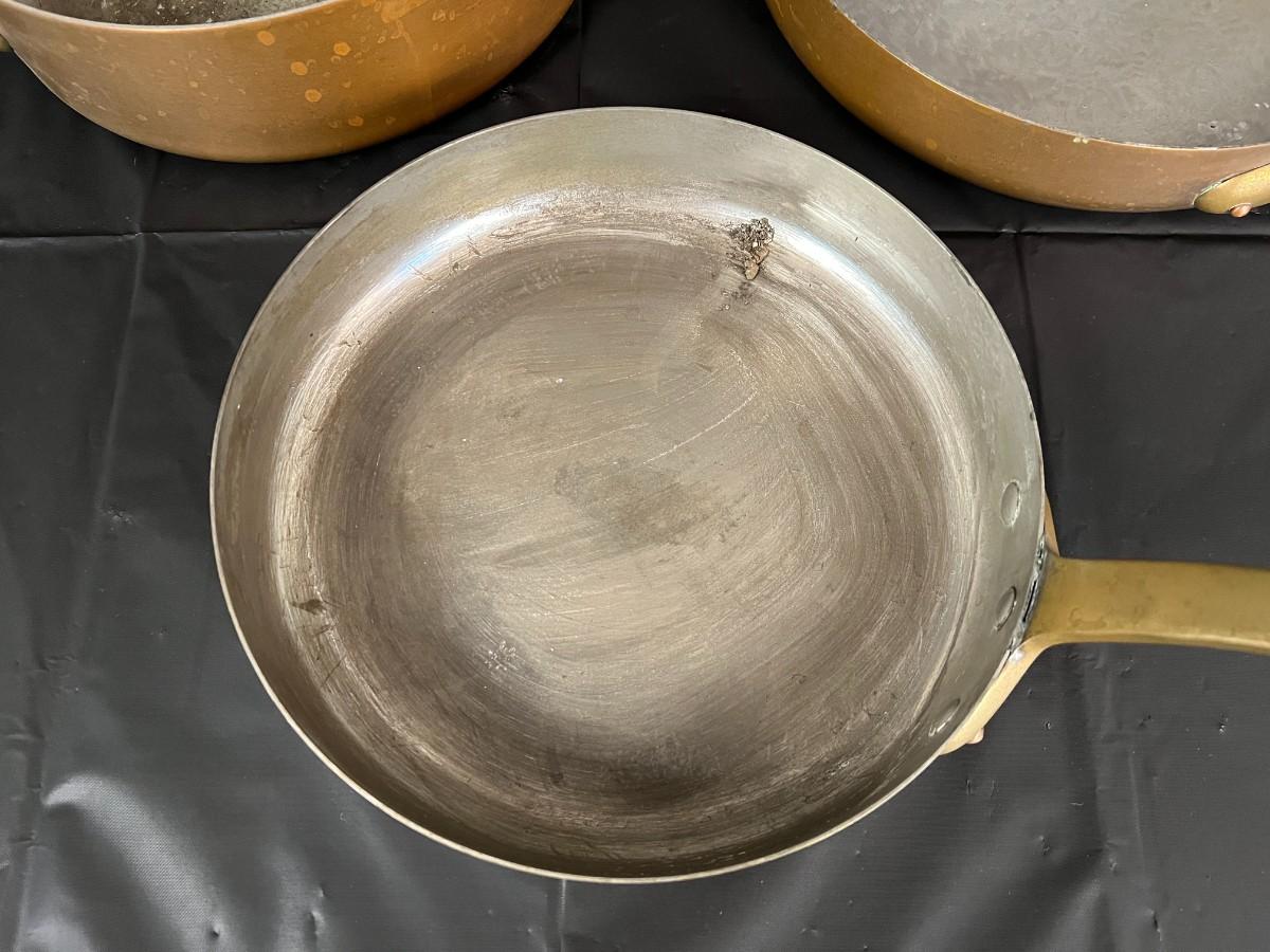 Lot of 3 Copper Pans with Brass Handles, one pan has a stamp that says Made in France. All made in similar style. One has metal unevenly applied inside the pan (shown in images). Condition as shown.