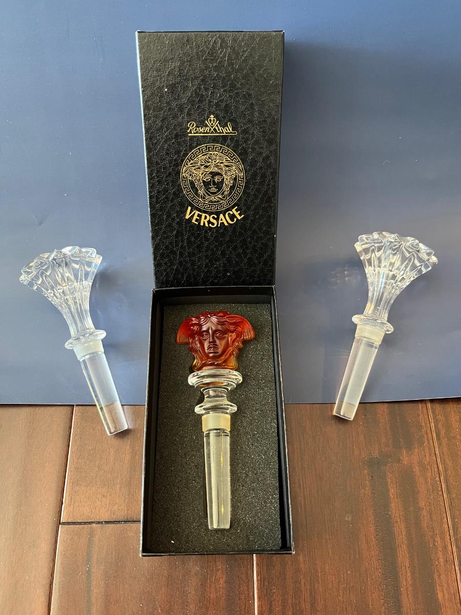 A matching pair of Waterford bottle stoppers and 1 Versace Medusa bottle stopper by Rosenthal with amber top in original presentation box. Priced to resell.