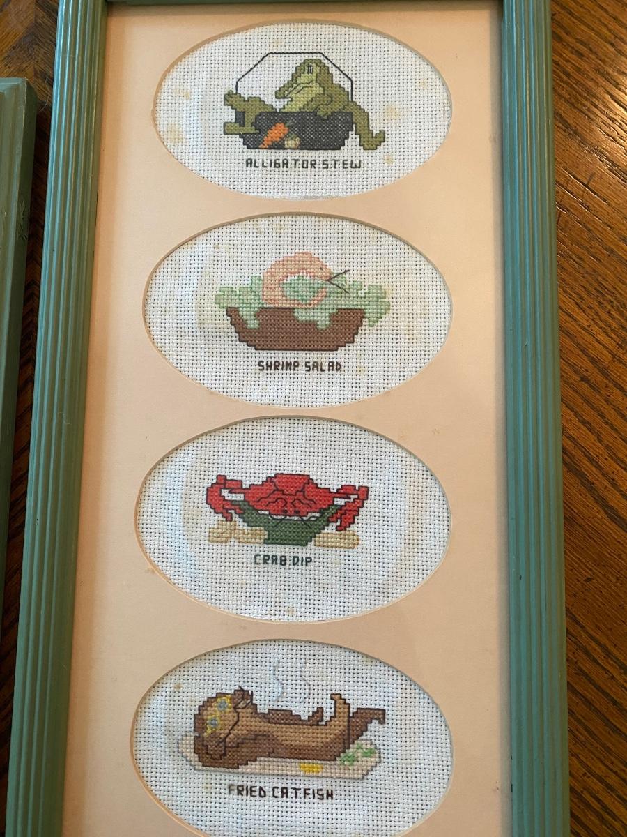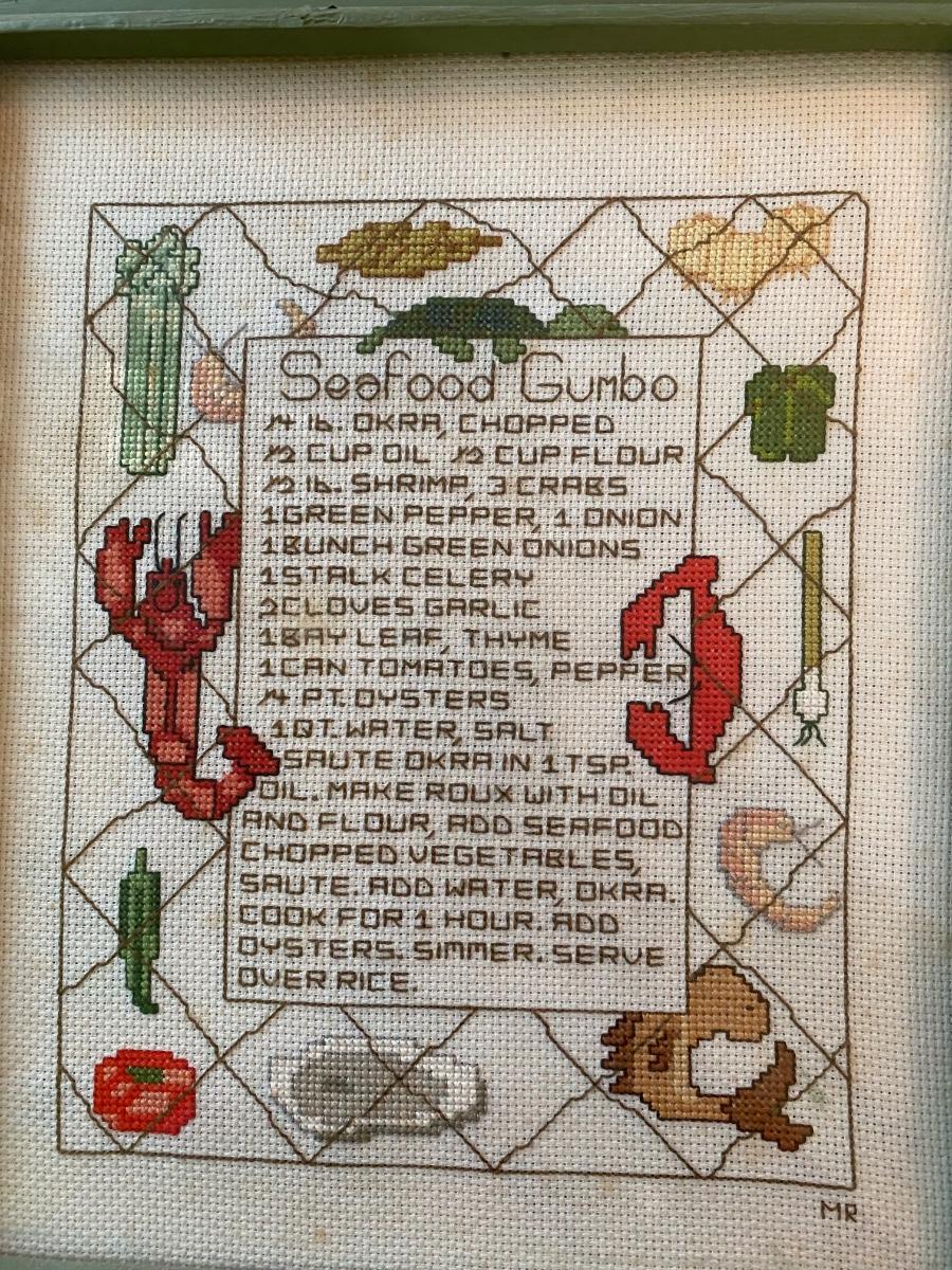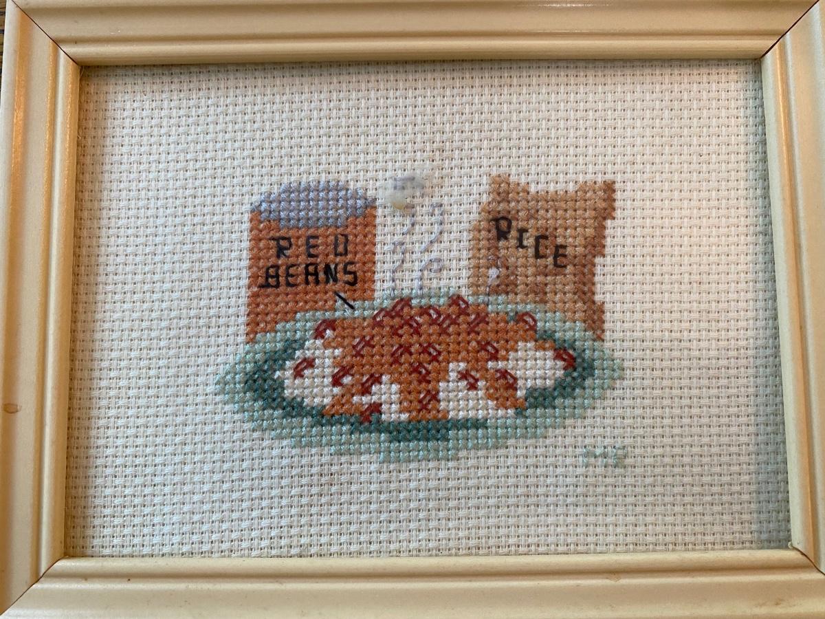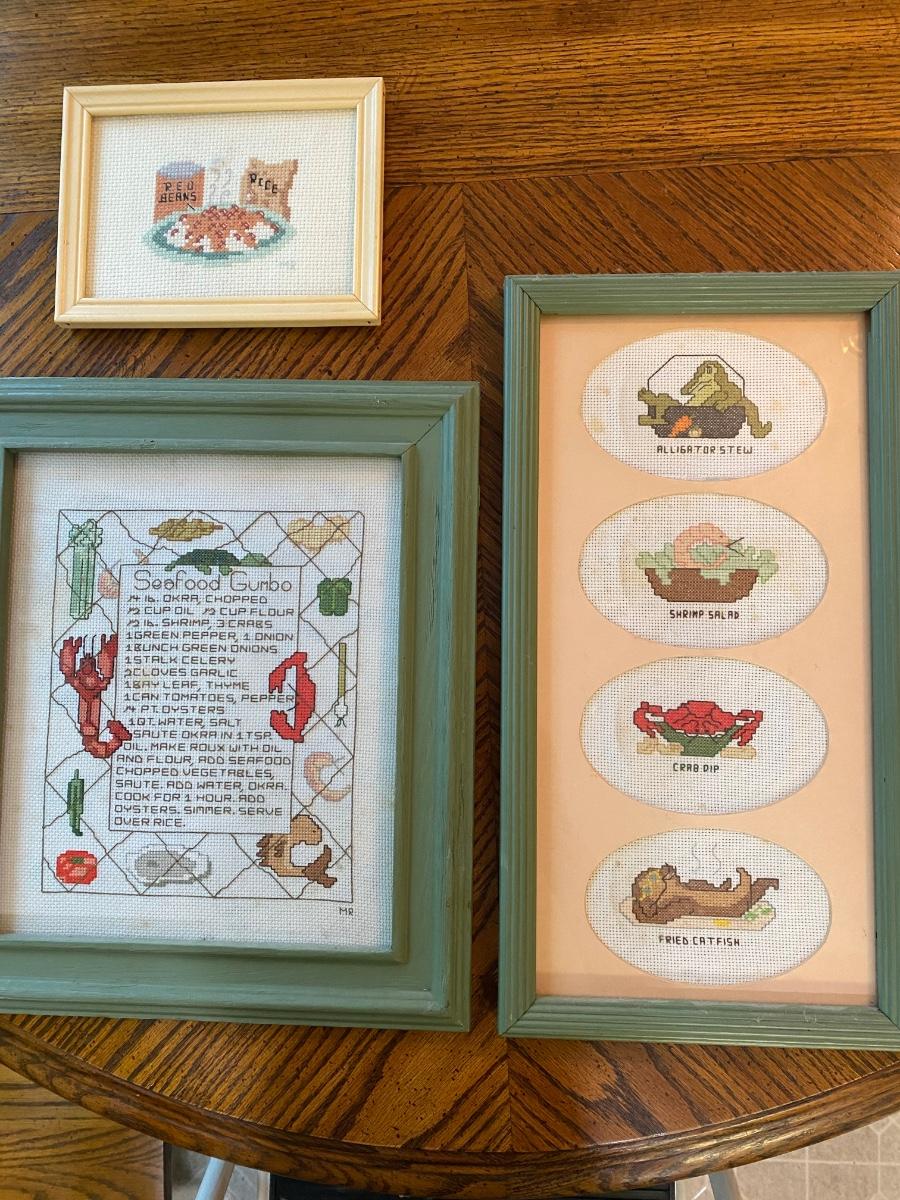 Lot of 3 Framed Crosstitch. “Seafood Gumbo” is 13 x 14-3/4; “Red Beans & Rice” is 8 x 6; “Seafood” is 9 x 17. “Seafood” has a few stains.