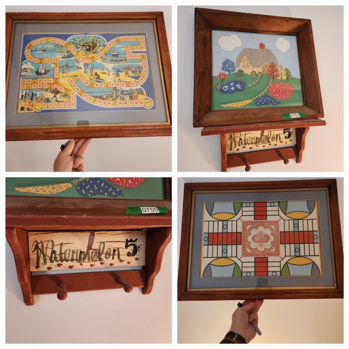 Lot of 3 Framed Art - Vintage Board Games / Stitch work and Coat Holder
