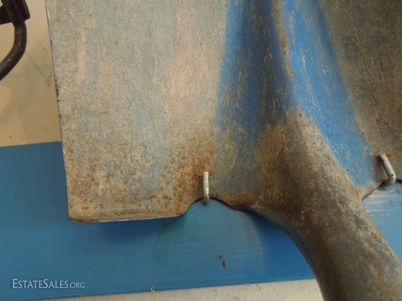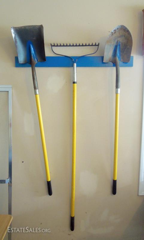 Long hard plastic yellow handles. No brand noted. Square shovel, Spade Shovel and Rake. Rack not included. Little rust other than noted in close up on spade shovel.