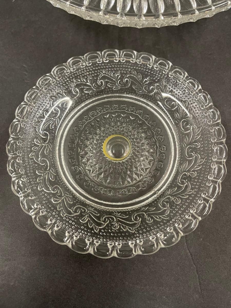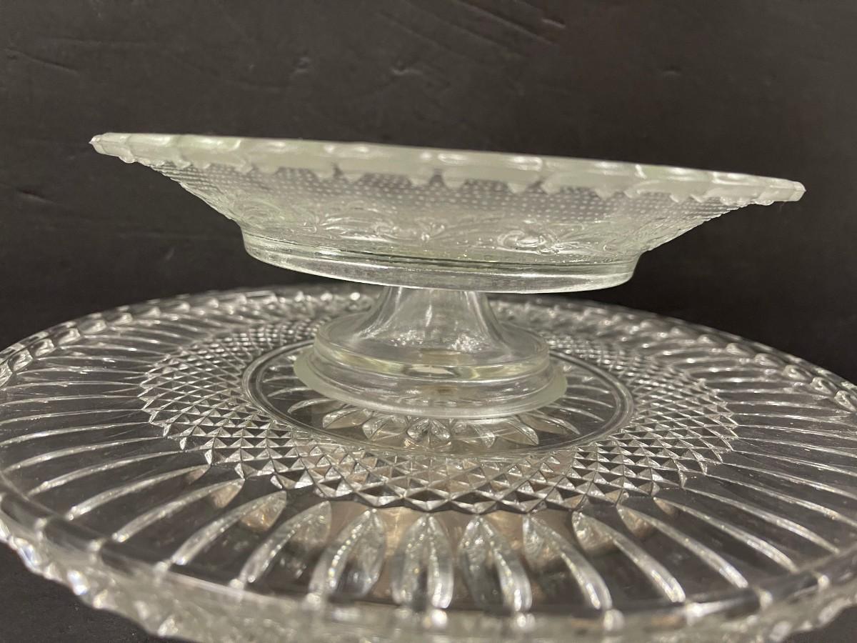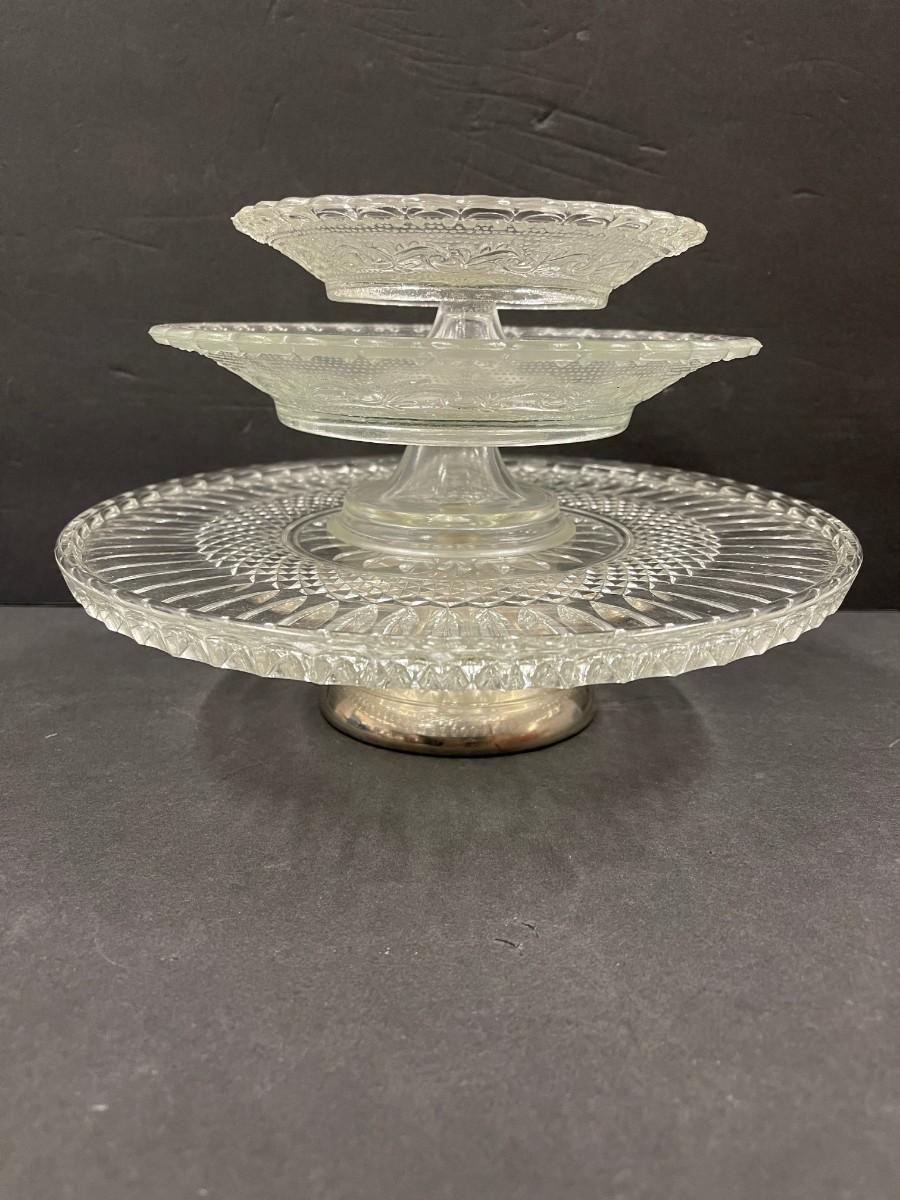 Lot of 3 glass cake plates. Includes two matching pressed glass footed cake plates (6" & 8"). Also includes one crystal cake plate with silverplate pedestal (11"). All in very good condition. No chips or cracks.