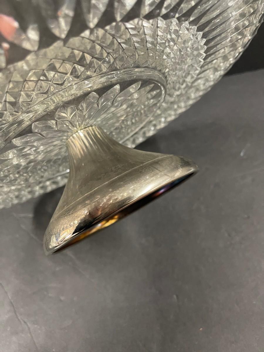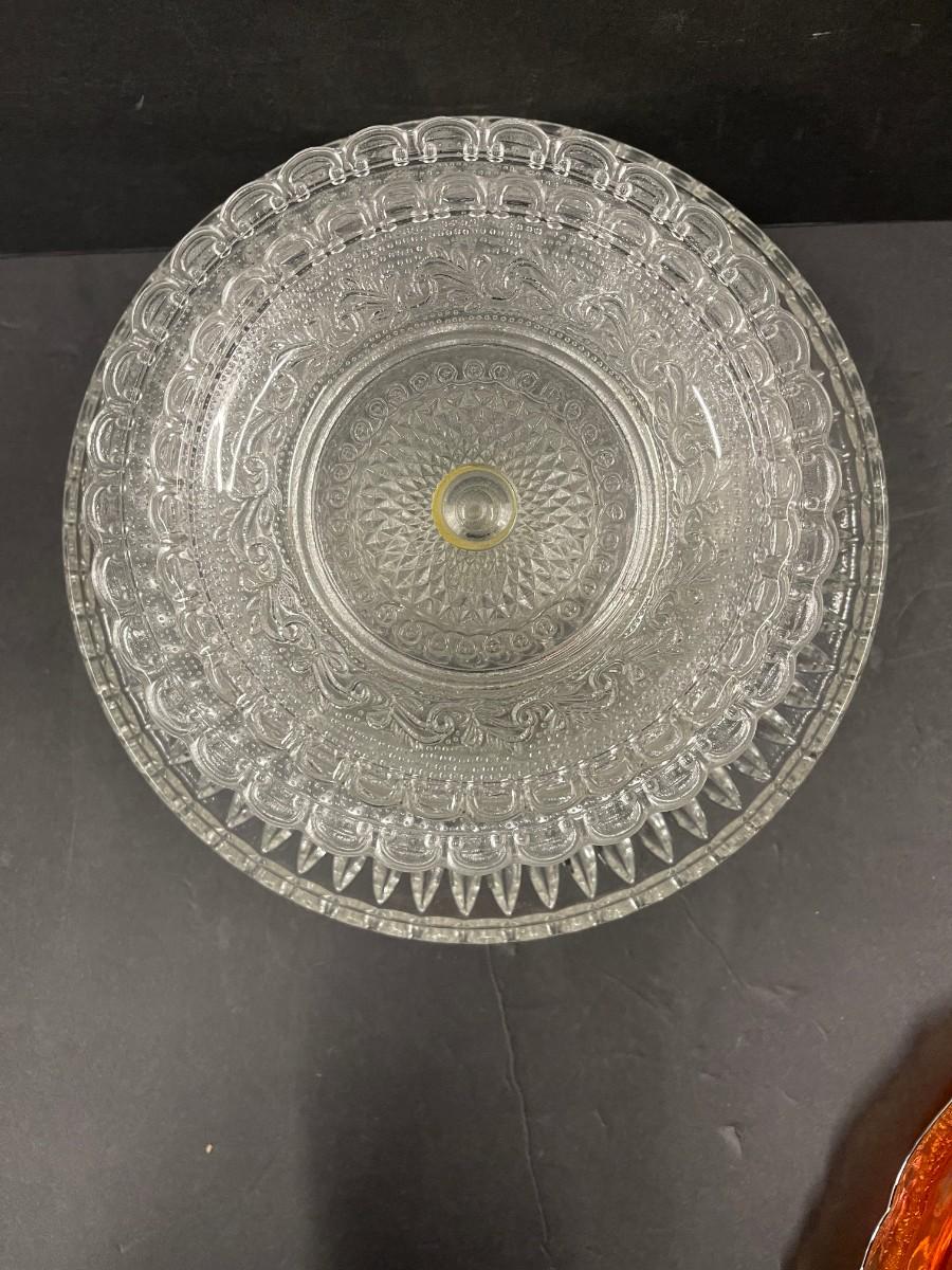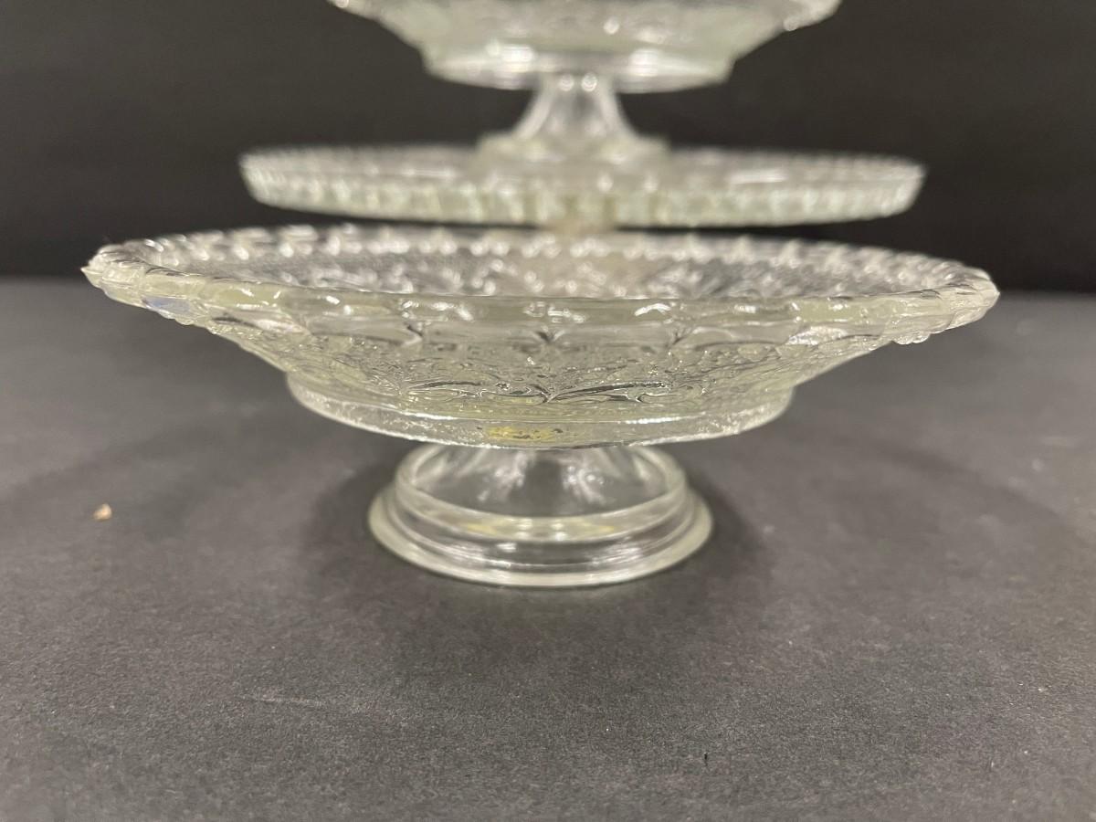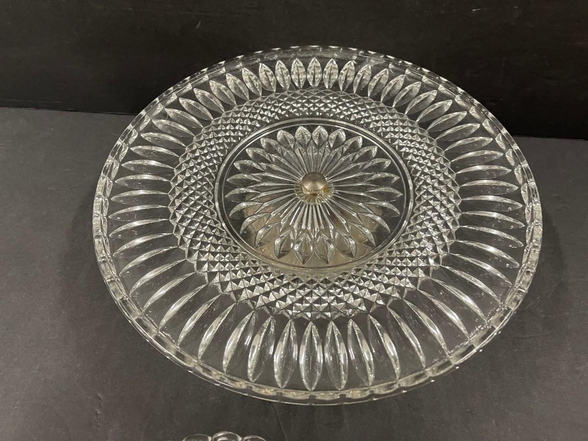 Lot of 3 glass cake plates. Includes two matching pressed glass footed cake plates (6" & 8"). Also includes one crystal cake plate with silverplate pedestal (11"). All in very good condition. No chips or cracks.