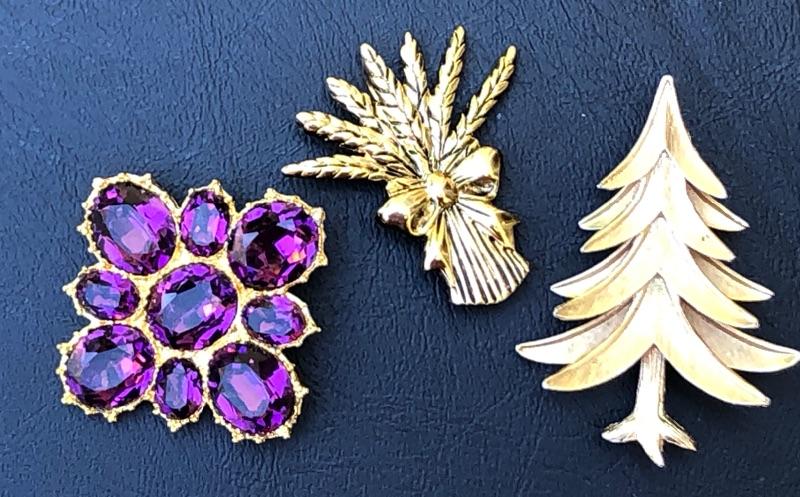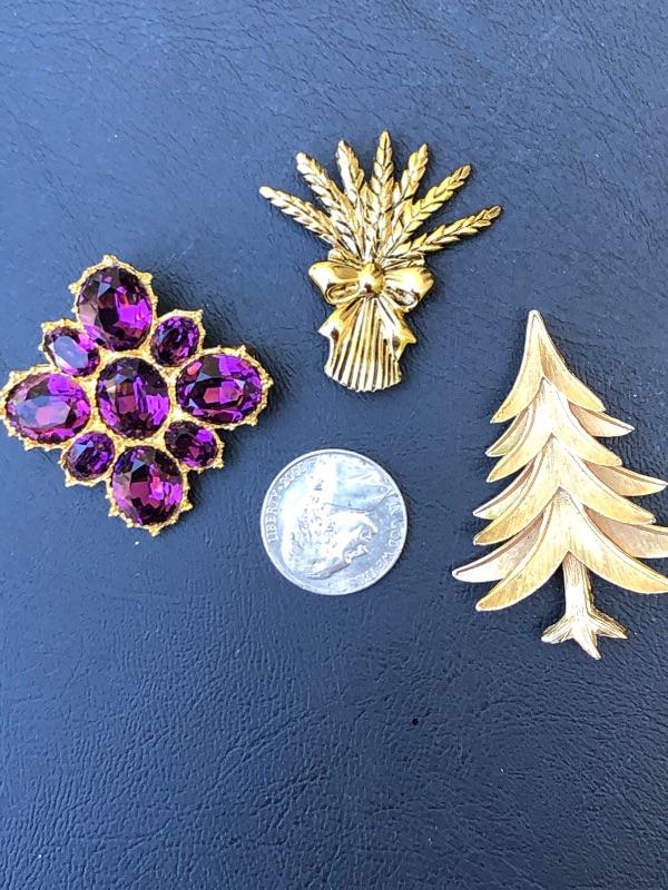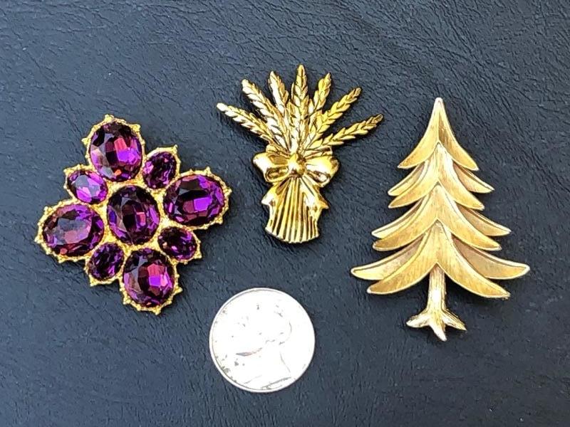 Pretty Purple Glass Snowflake Brooch, 2D Pine Tree and Holiday Bushel Make up this 3 Gold Tone Jewelry Lot of Brooches.