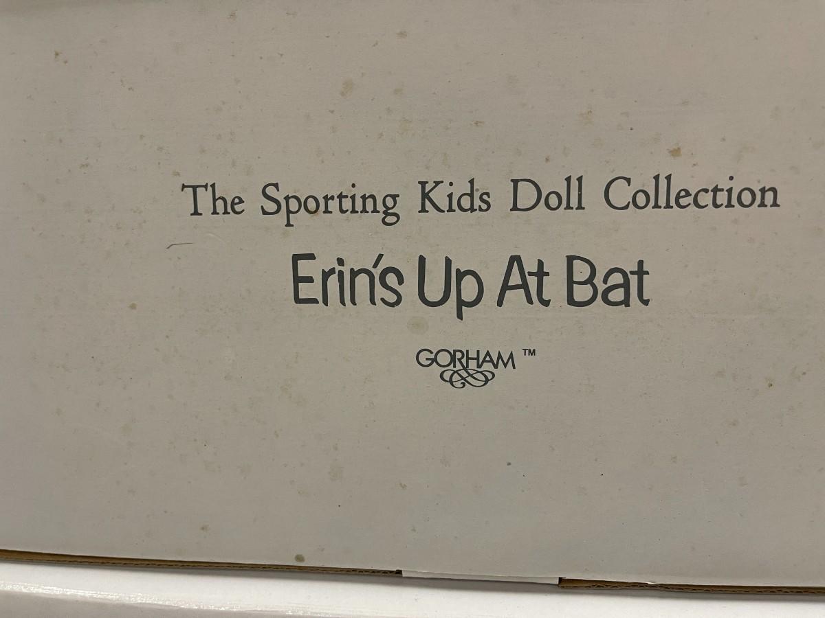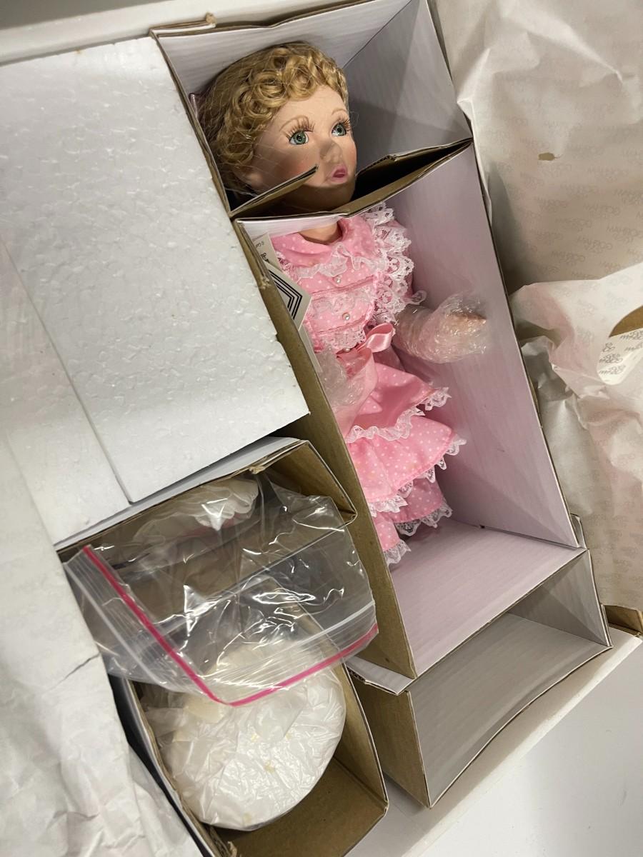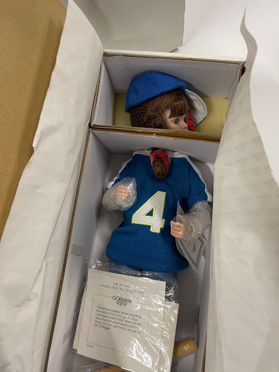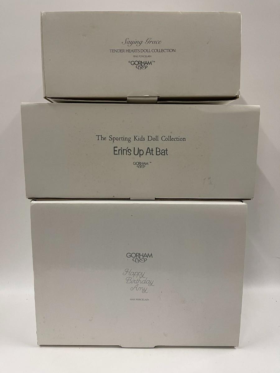 Lot of 3 Gorham porcelain dolls, new in boxes. Includes: Saving Grace from the Tender Hearts Doll Collection, Erin's Up at Bat from the Sporting Kids Doll Collection and Happy Birthday Amy, complete with cake.