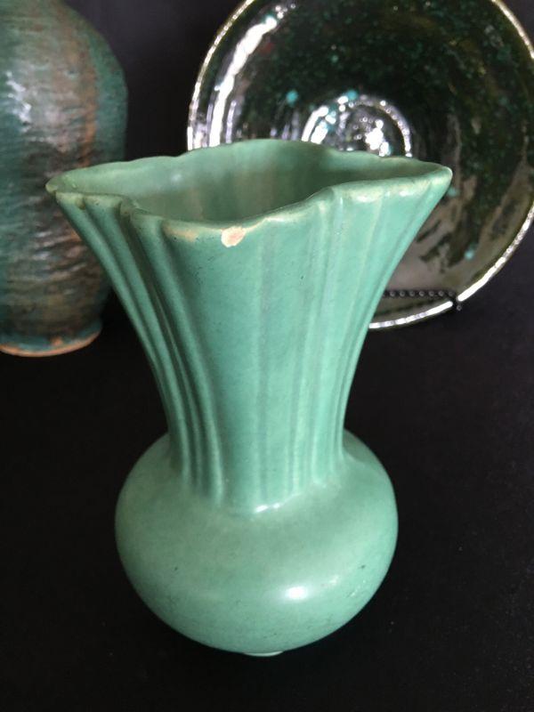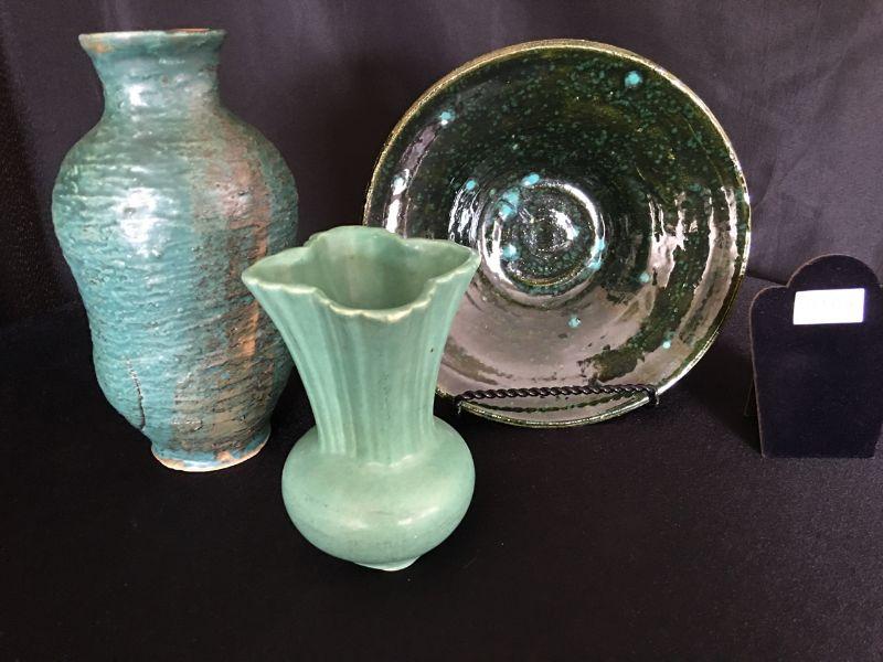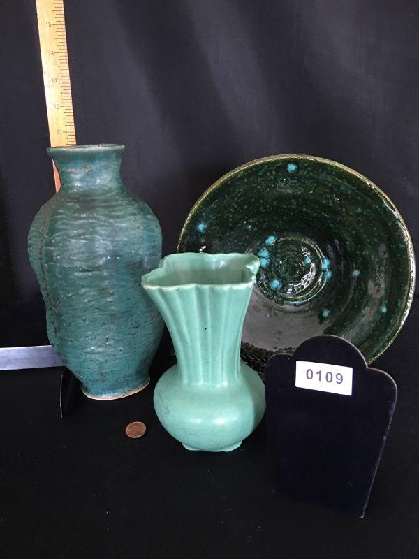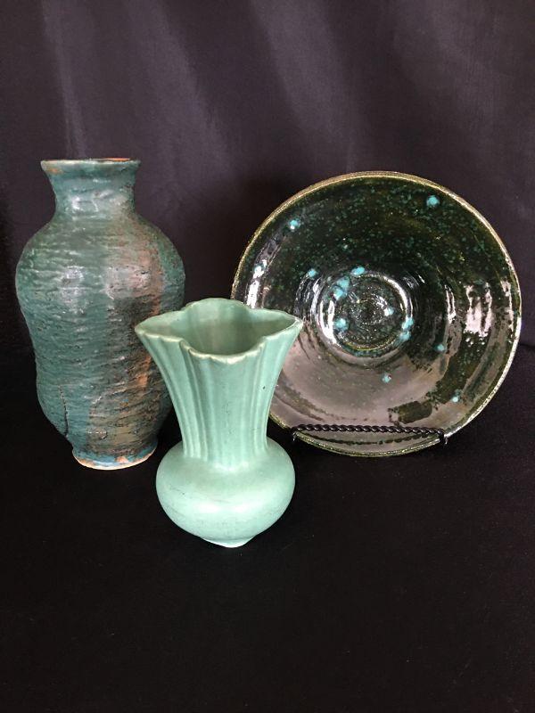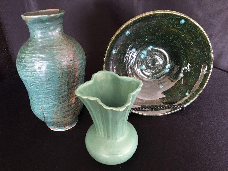 Lot of 3 Green Studio Art Pottery Pcs and Vintage Vase Lot # 109