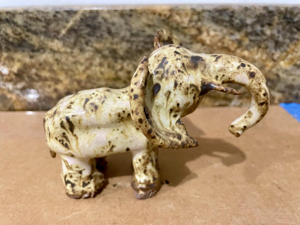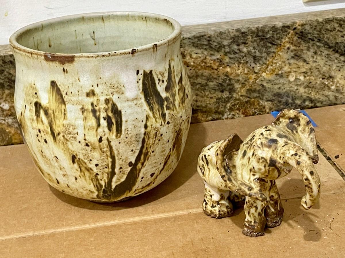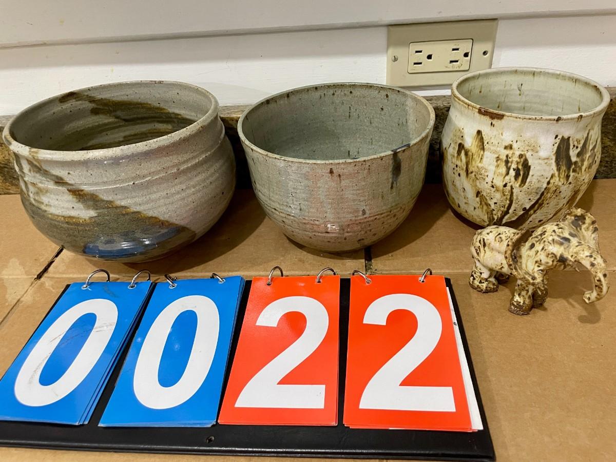 Lot of 3 hand-thrown pottery bowls + a cheeky pottery elephant figurine