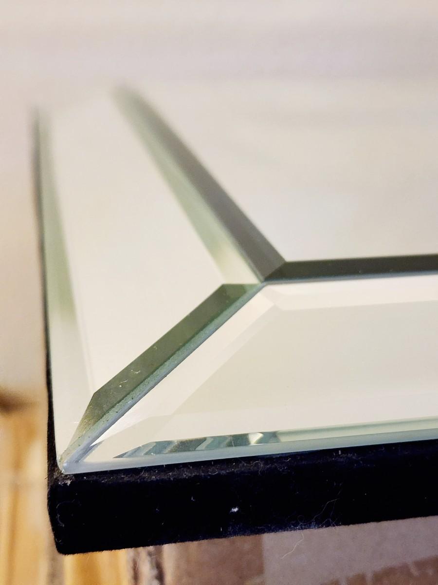 Beautiful heavy trays, still packed in original plastic and styrofoam, in original boxes. 1" thick mirrored trays with black felt bottoms. Mirrors are pristine, with beveled edges to add brilliance.