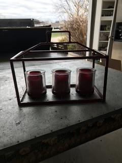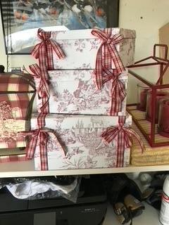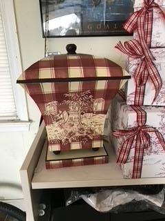 Red Plaid tin box, set of 3 red and white toile boxes, metal lantern 3 candle holder