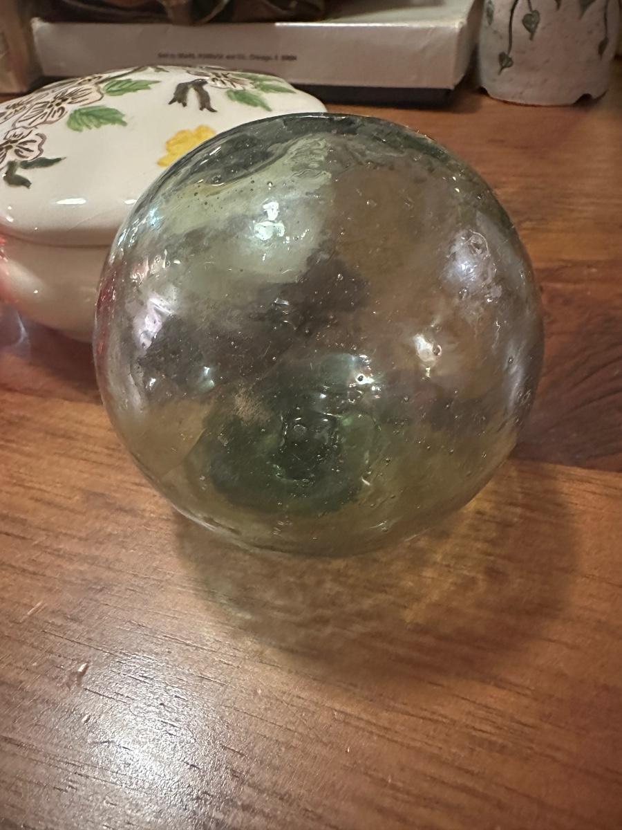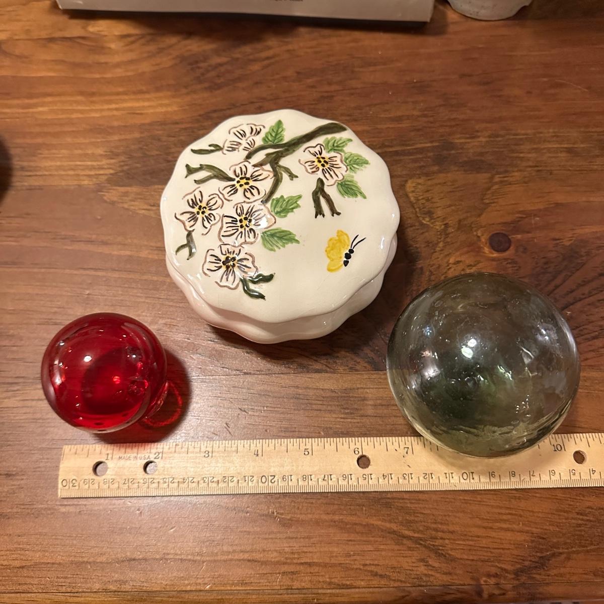 Lot of 3 Items- 2 Glass Spheres and Lidded Trinket Dish