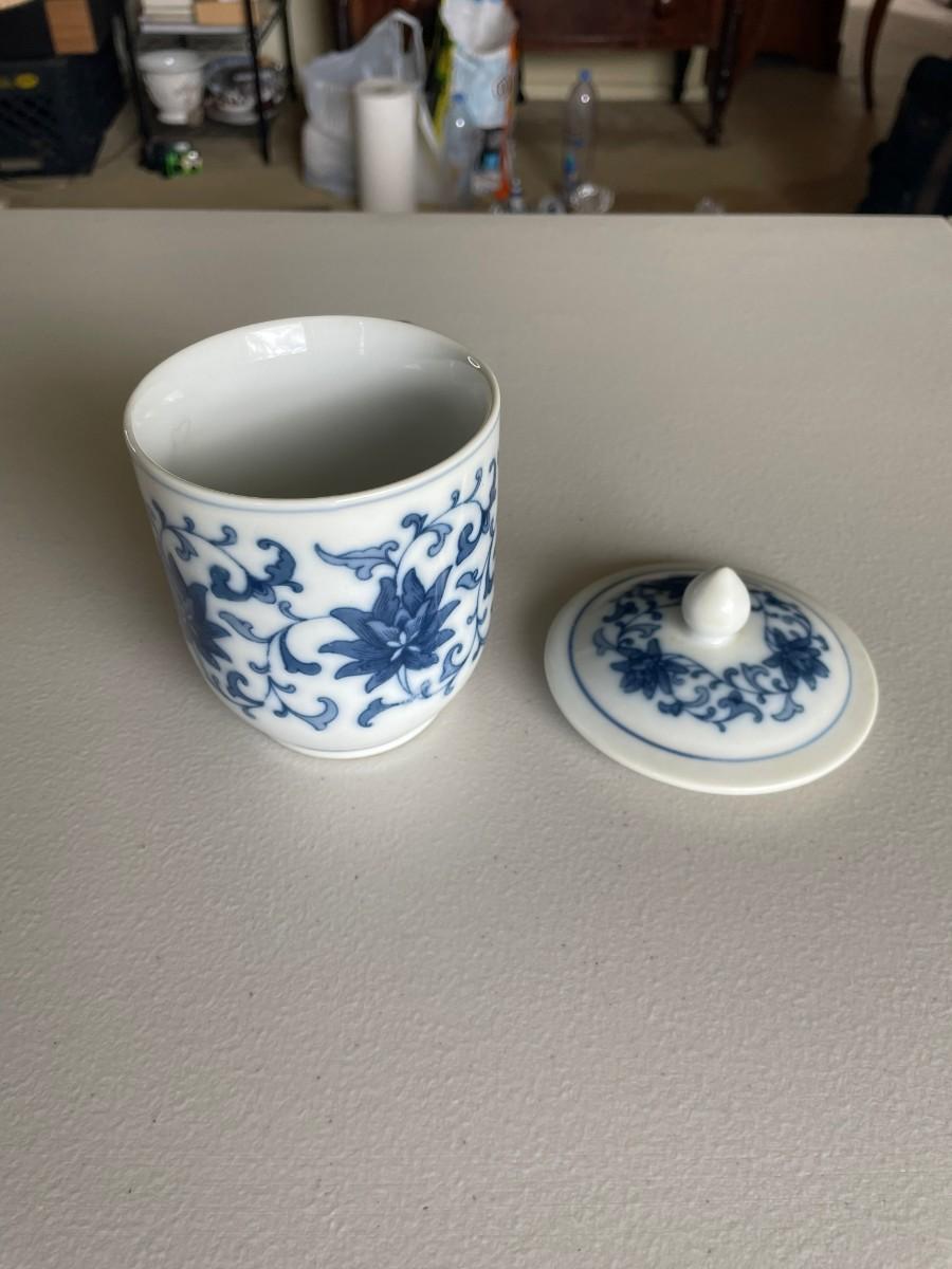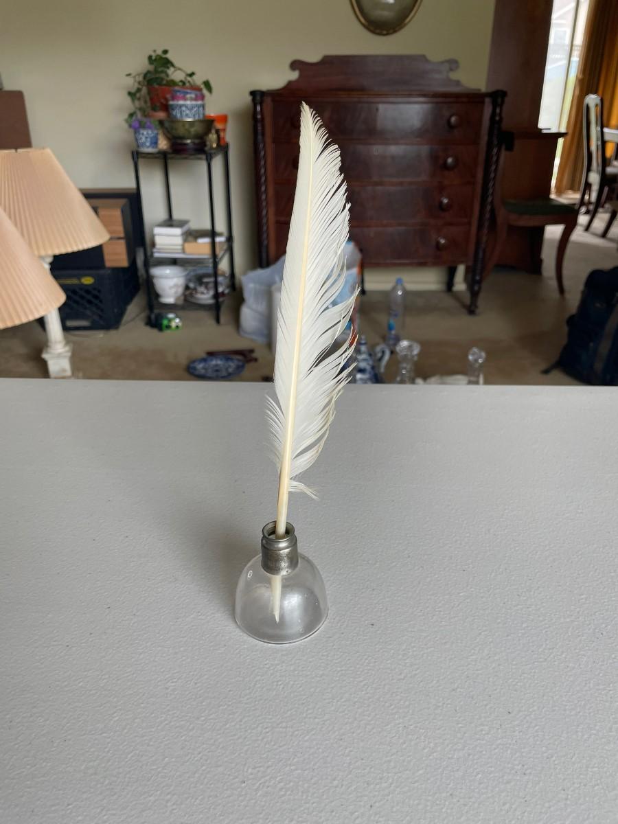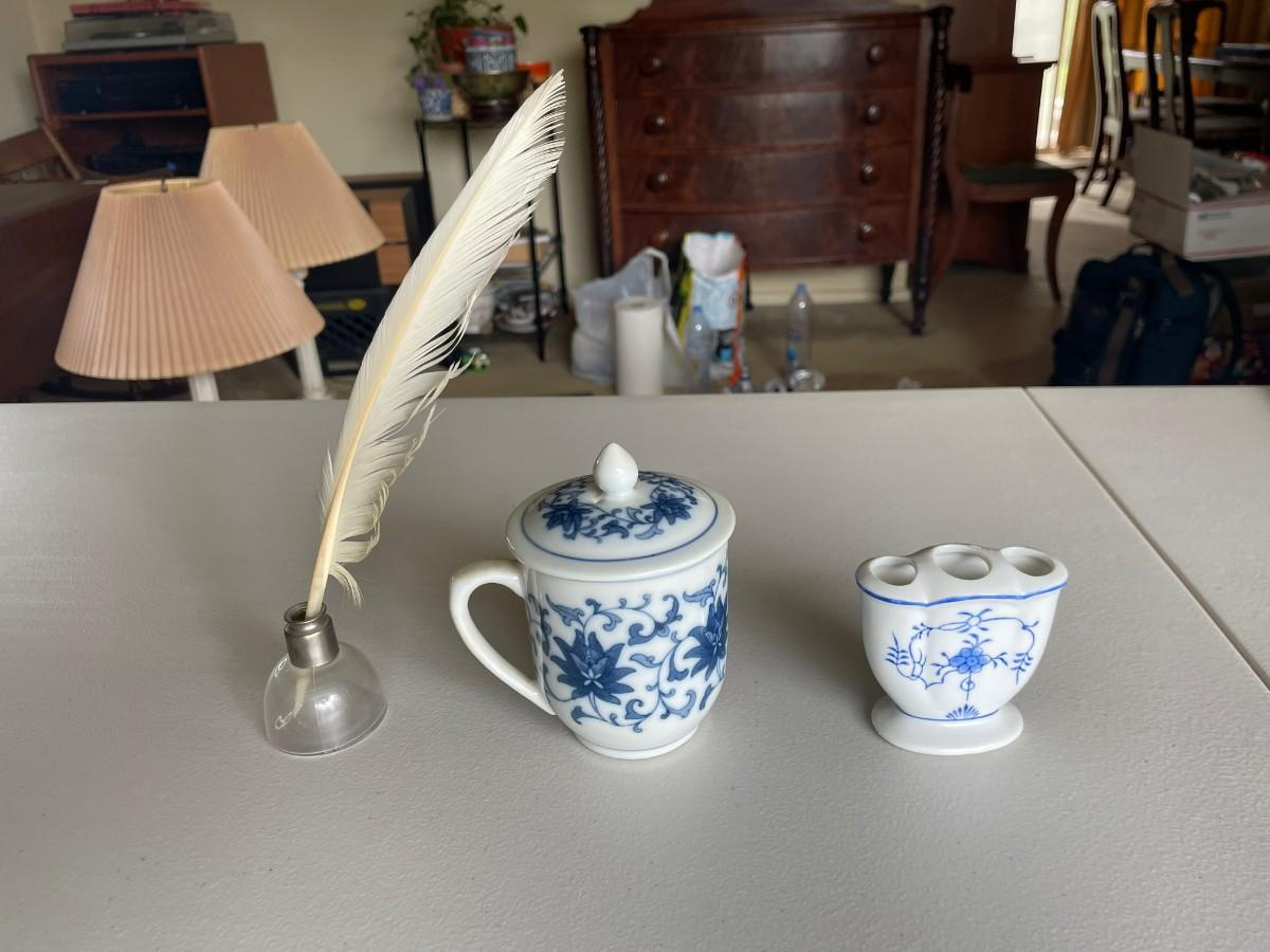 Feather pen and Ink Well, Cup with lid, etc.