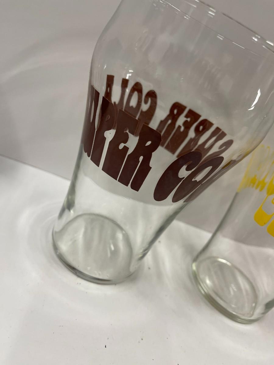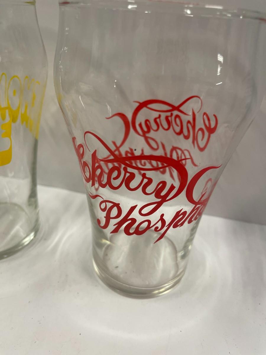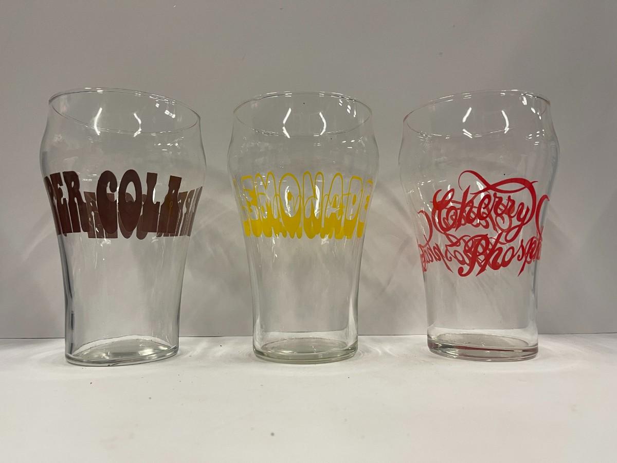 Lot of 3 vintage jumbo drinking glasses, Lemonade, Cherry Phosphate & Super Cola. Each is 7" high x 4" wide. Each in excellent condition.
