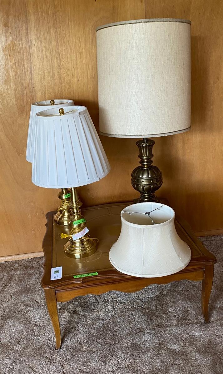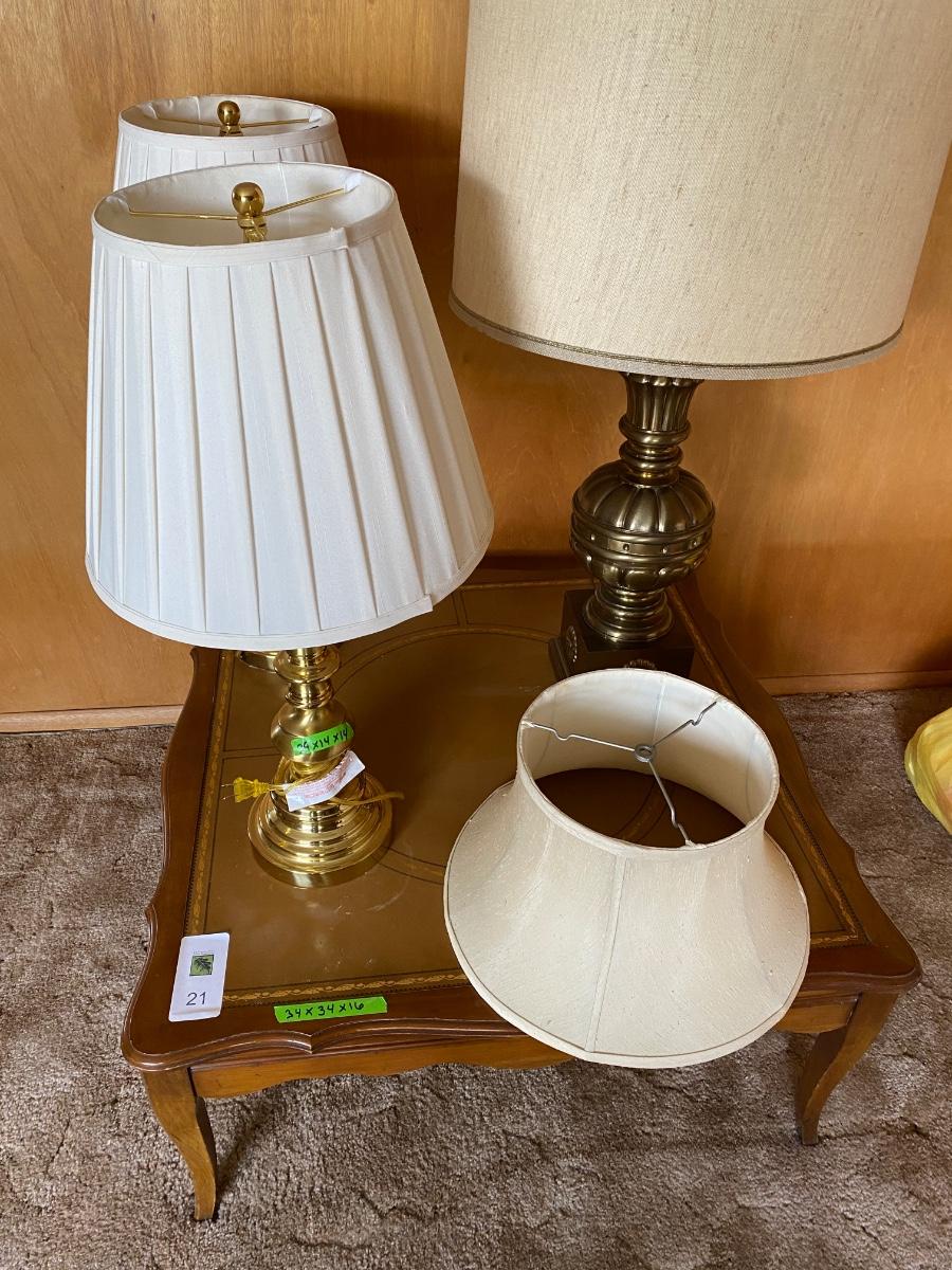 Lamps are brass colored. The larger lamp is a bronze color. Low table has faux leather top. The shade is in undamaged condition