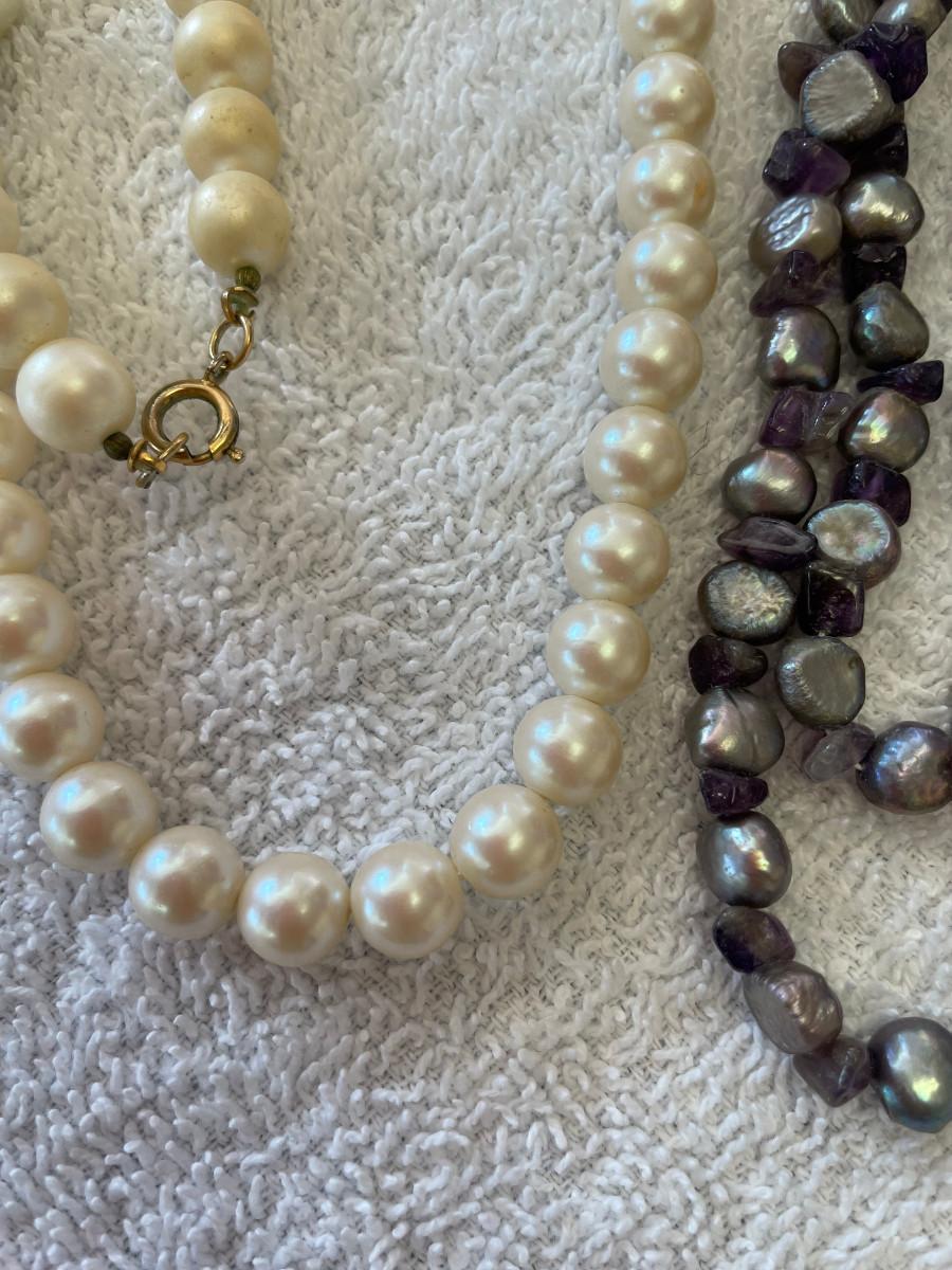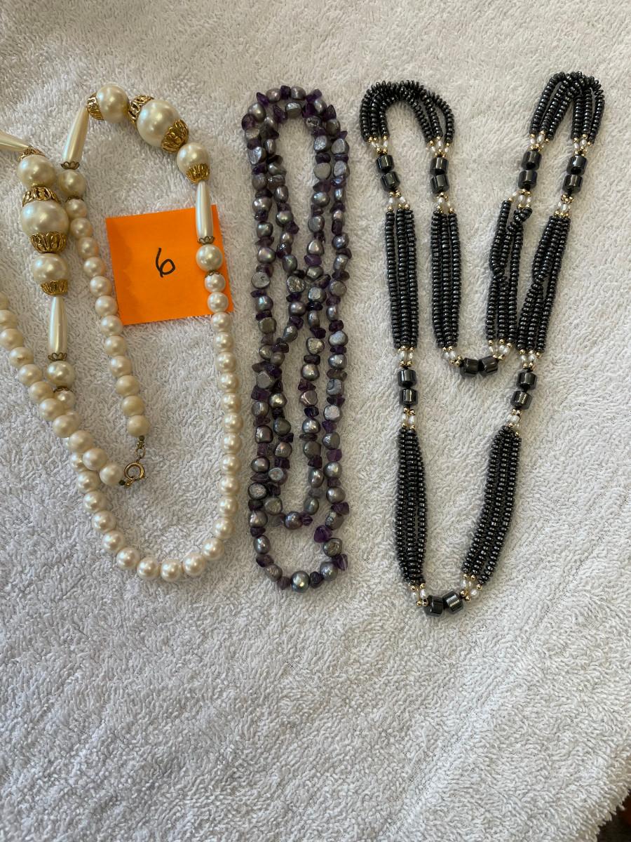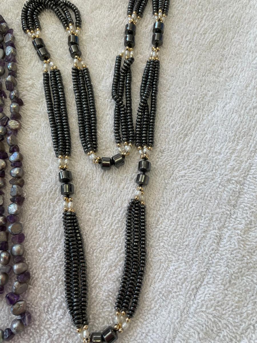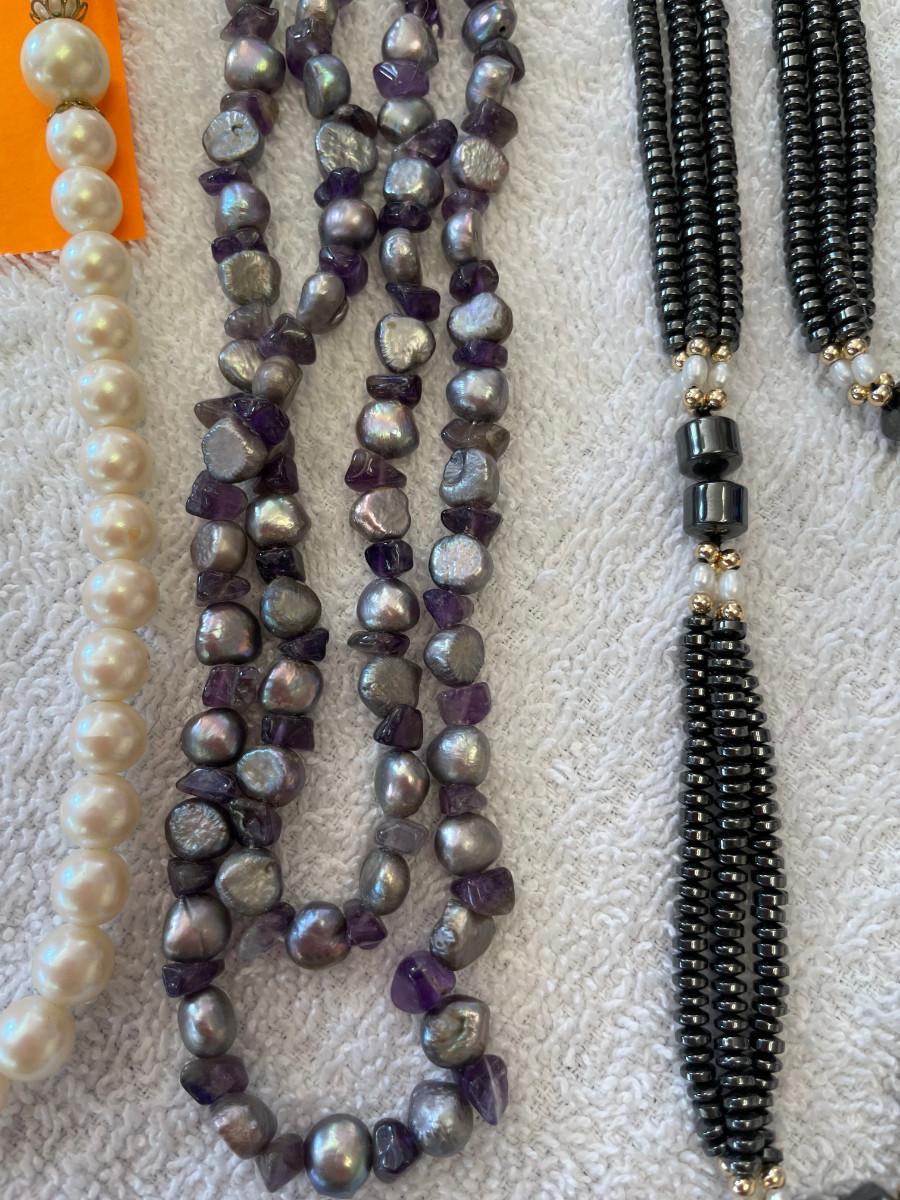 Faux pearls, Dyed pearls & hematite. All 20"+ in length. Display as new! Clean.