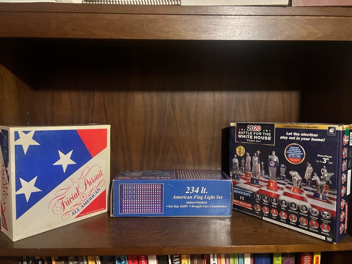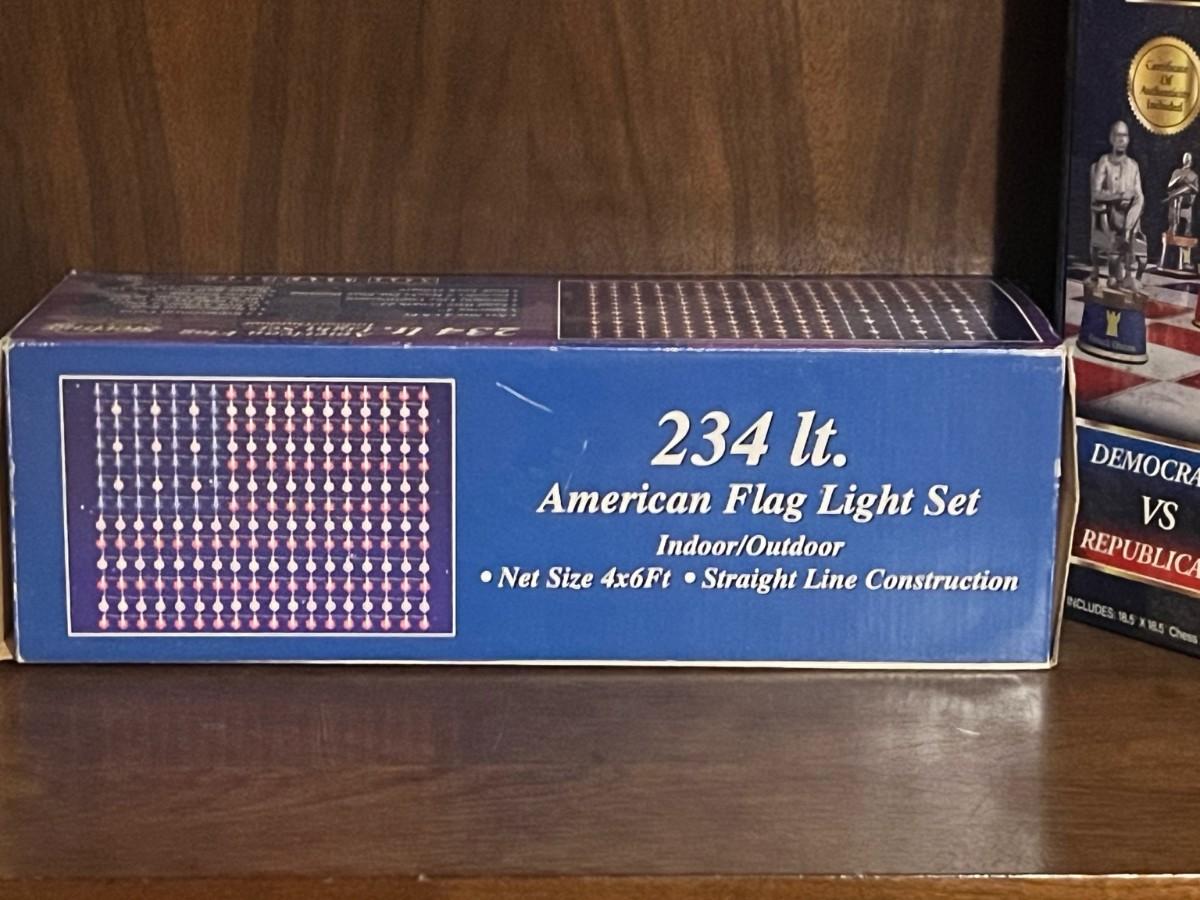 Lot of 3 Patriotic Americana Items – Trivial Pursuit, American Flag Light Set & 2020 Battle for the White House Chess Set