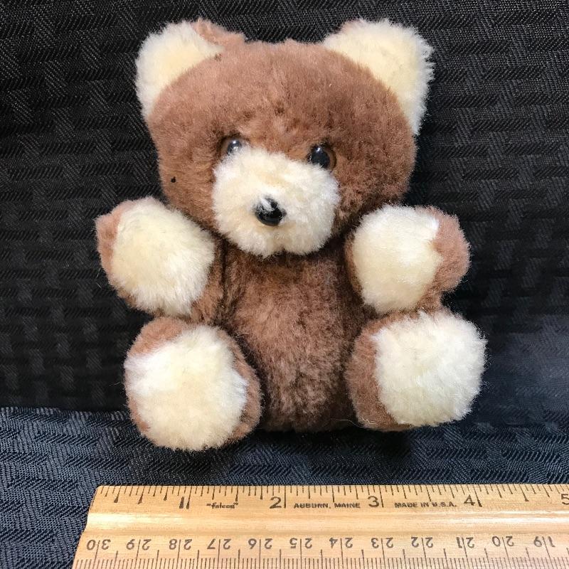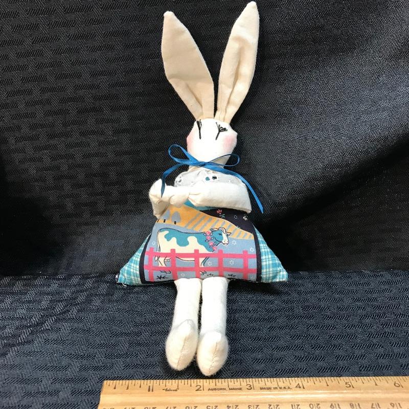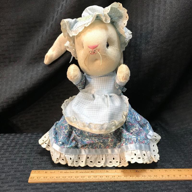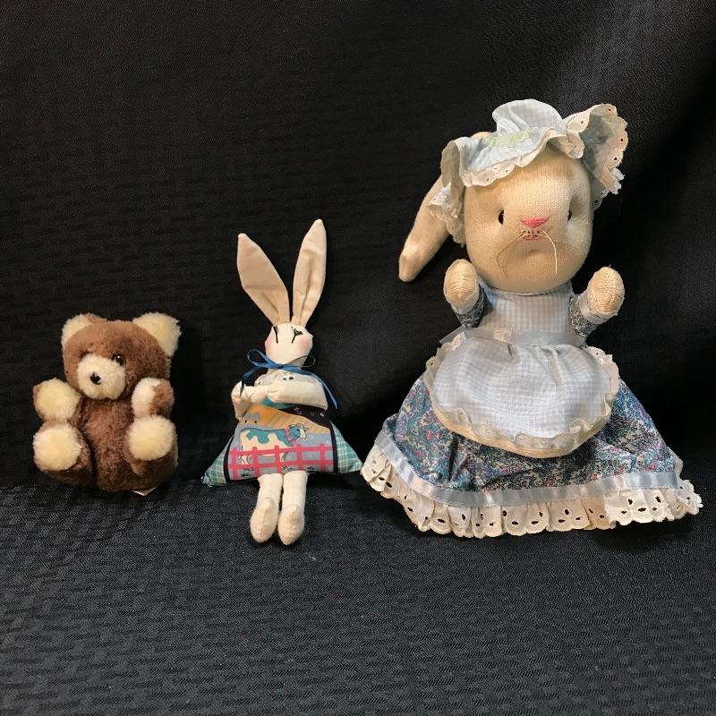 Up for auction is a lot of three plushies. One miniature brown teddy bear, one triangular female rabbit that appears to be homemade, and one rabbit with prairie dress and bonnet. See pictures.