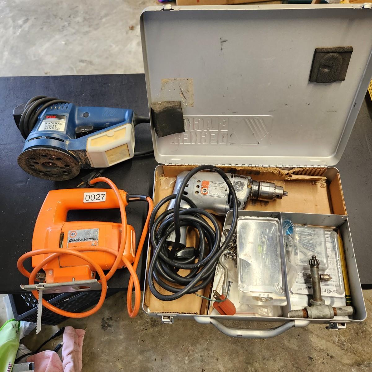 lot of 3 Power tools Black & Decker Drill ,Saber Saw Ryobi Orbit Sander