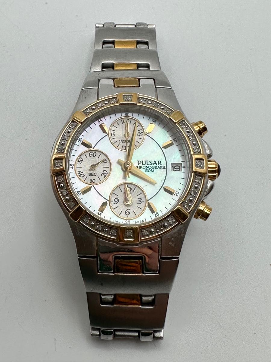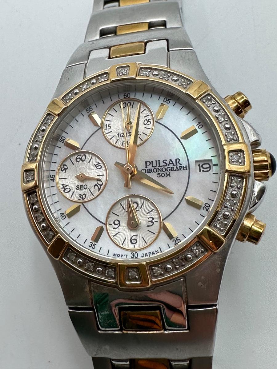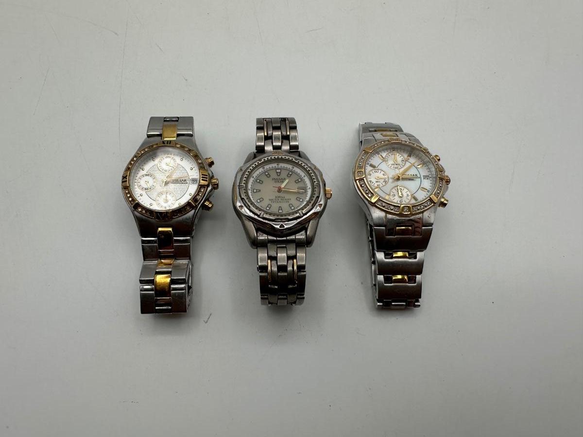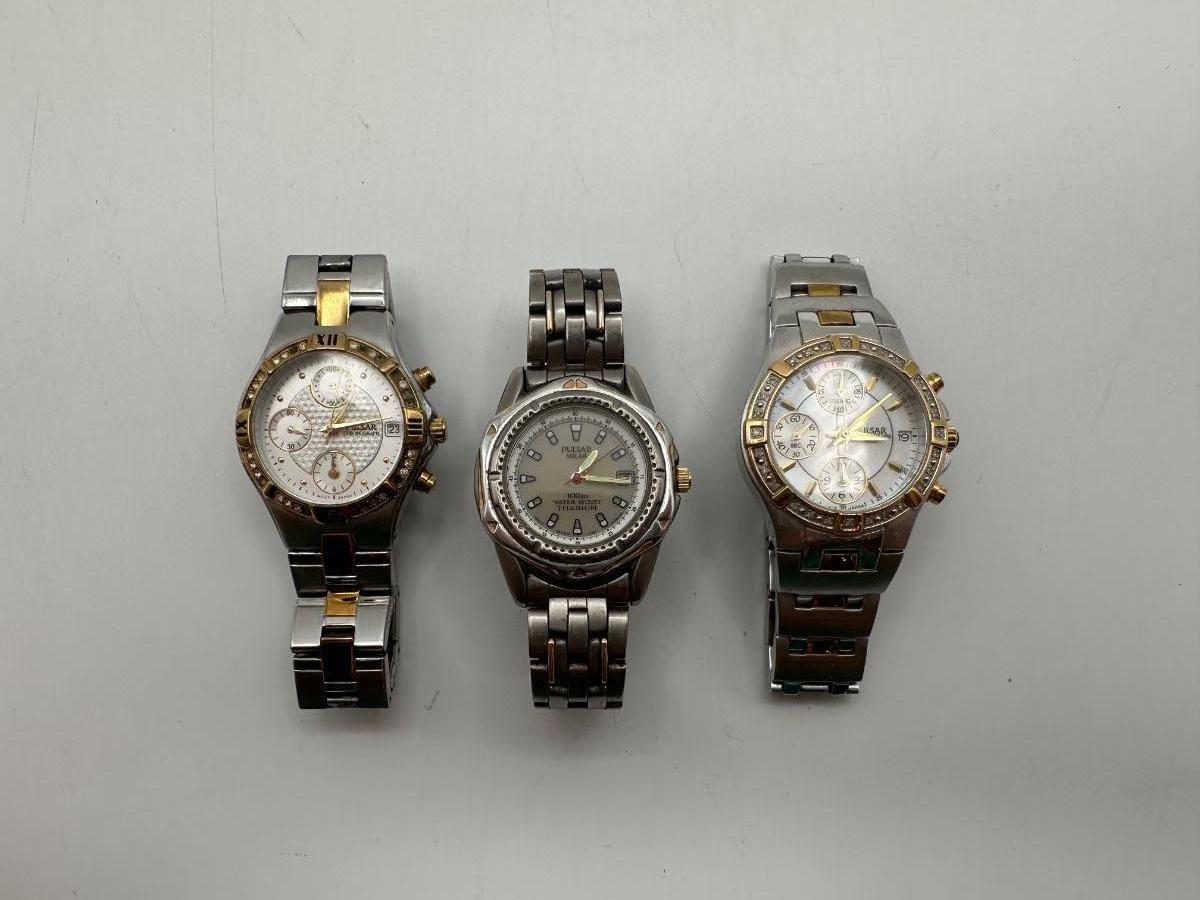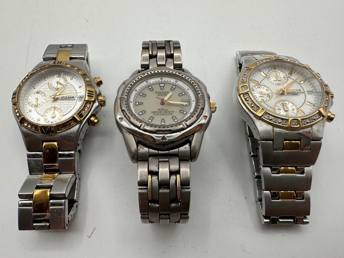 Two Pulsar chronograph watches – both two-tone stainless steel with decorative stone bezels, subdials, and date windows. One Pulsar Solar titanium watch – silver/gray dial, 100m water resistant, date window.