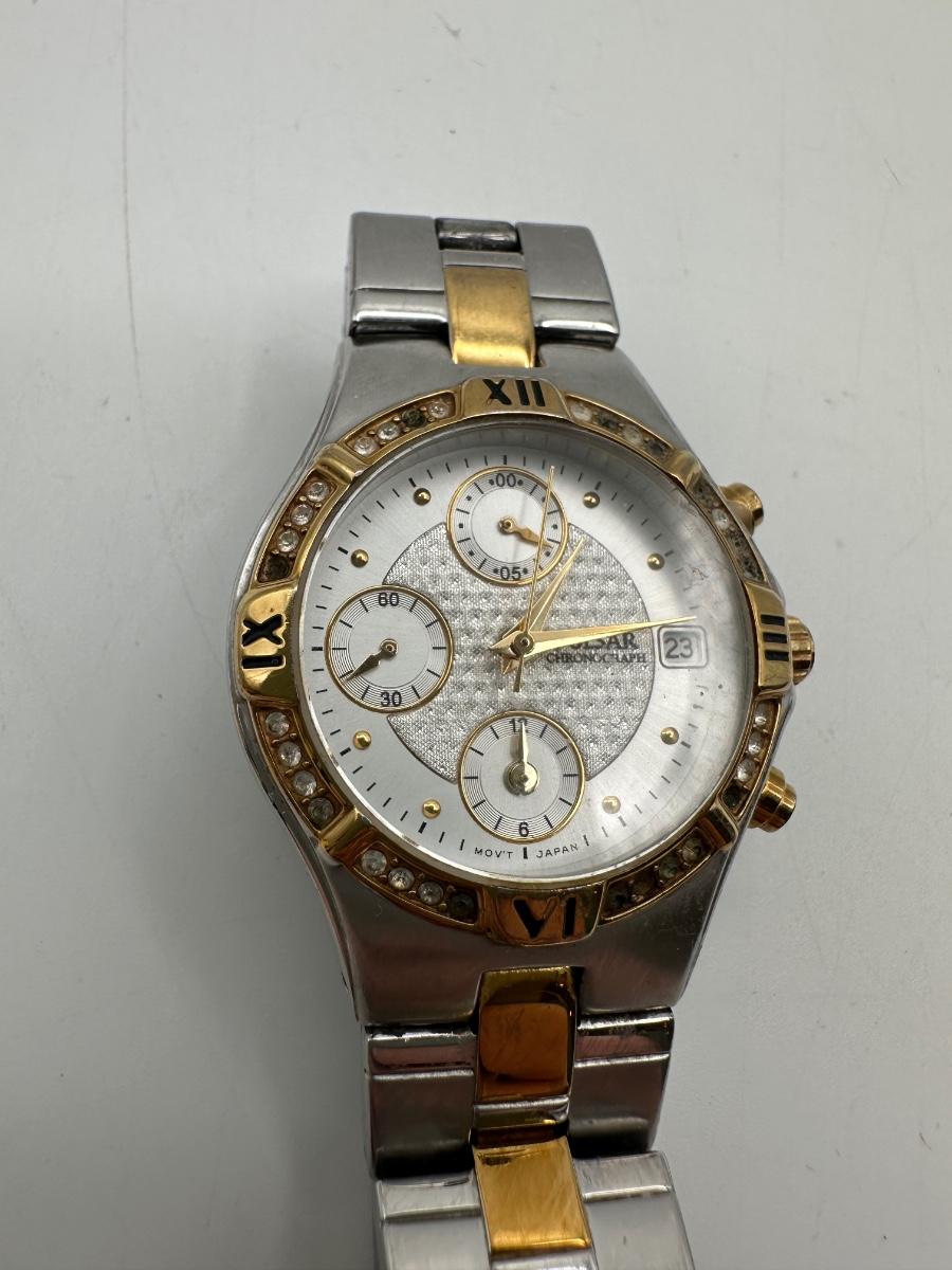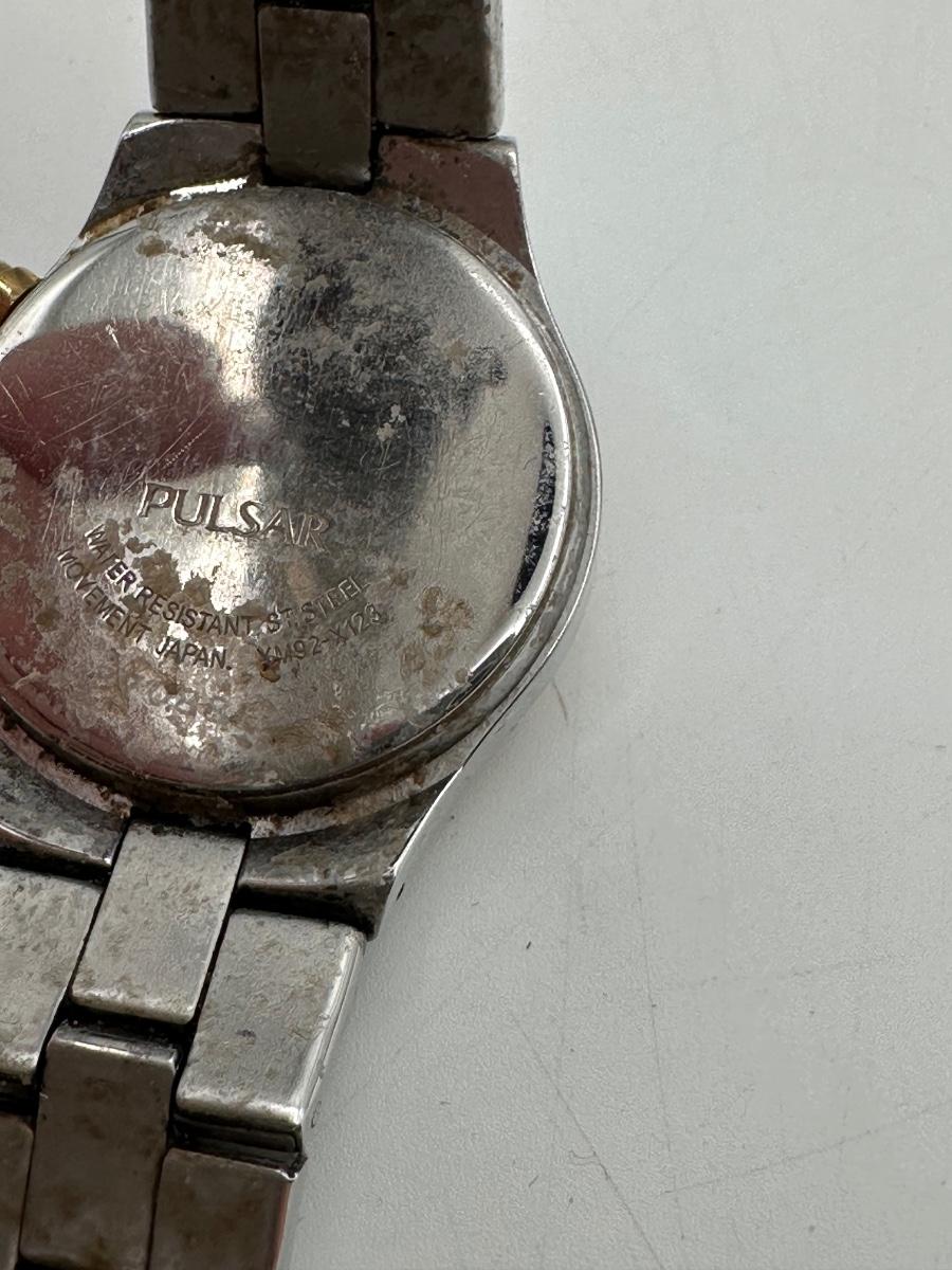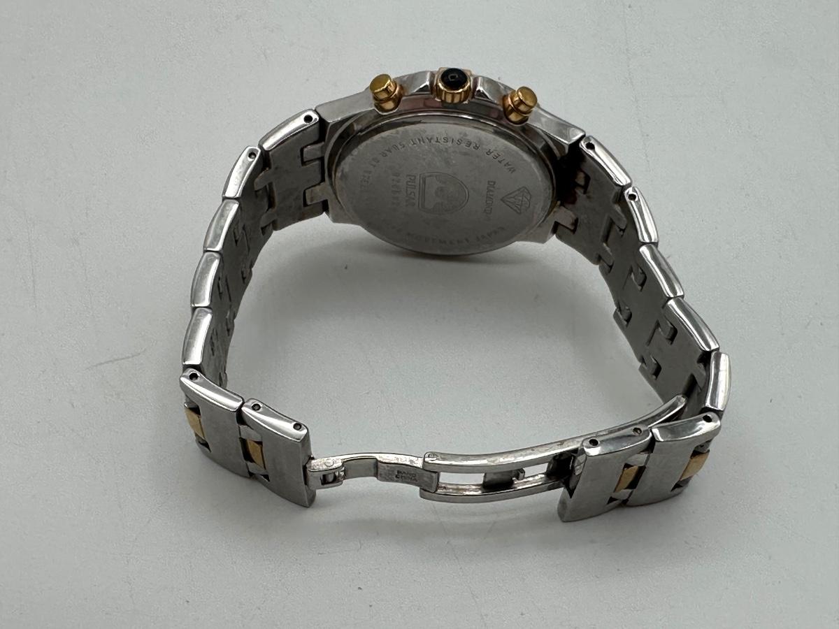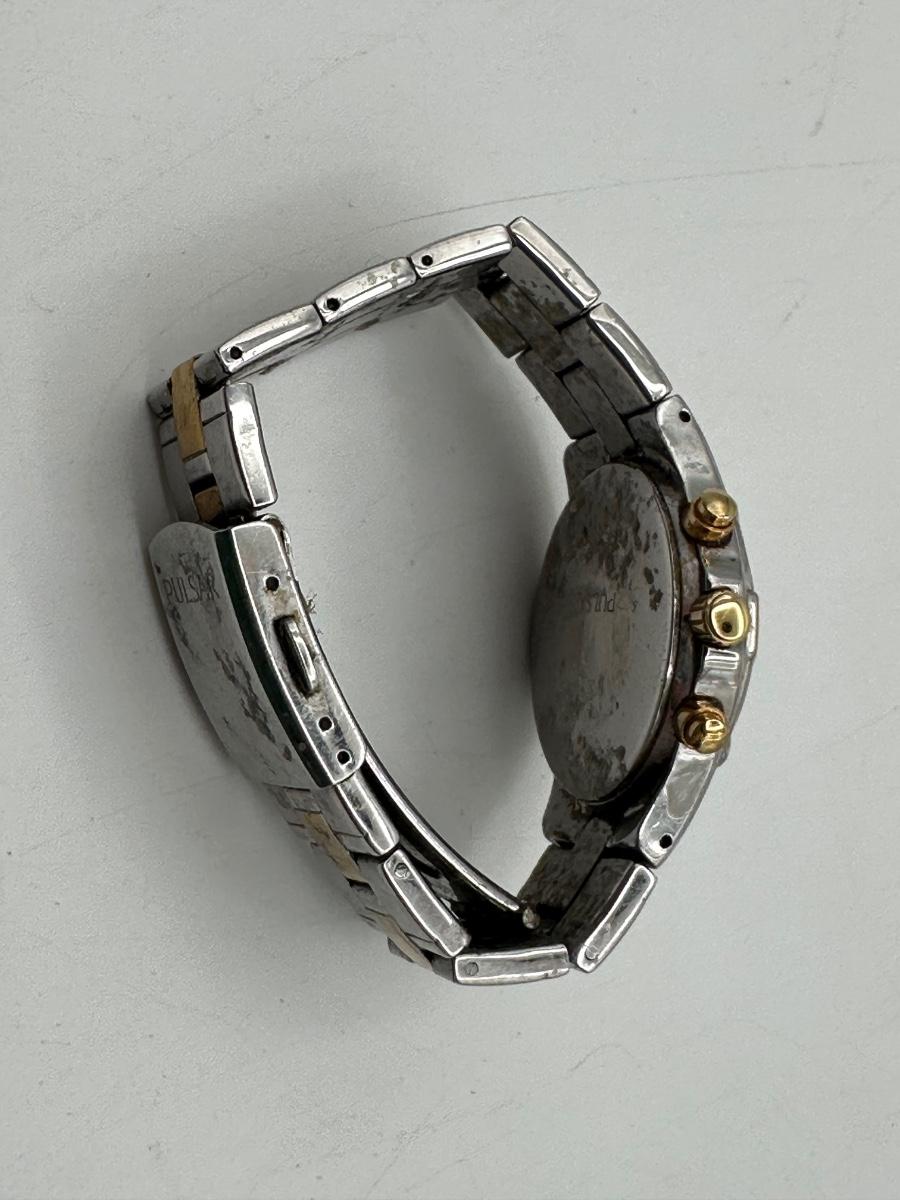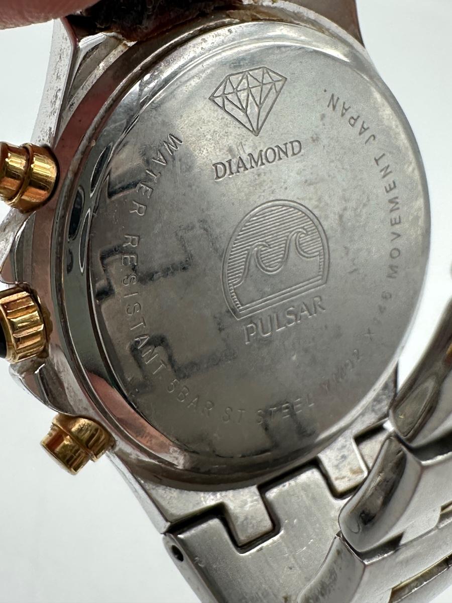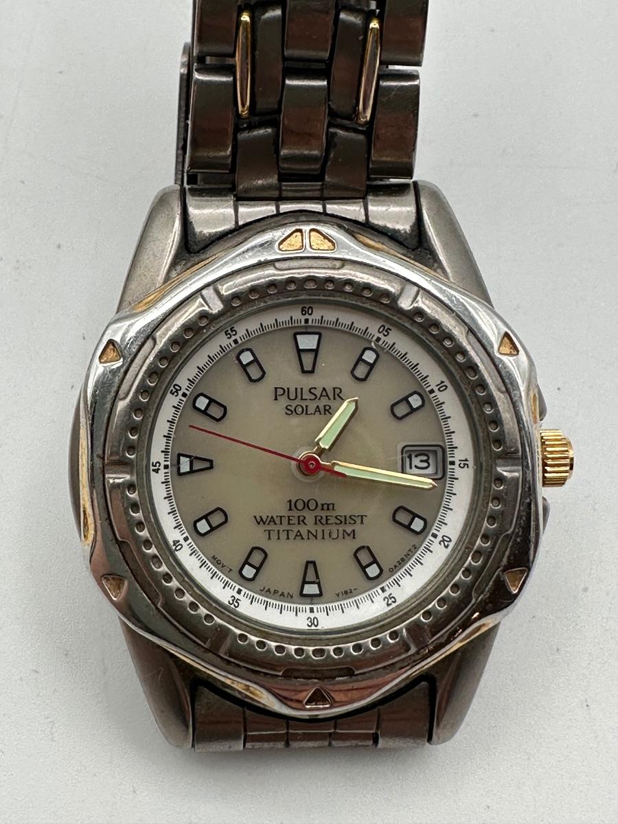 Two Pulsar chronograph watches – both two-tone stainless steel with decorative stone bezels, subdials, and date windows. One Pulsar Solar titanium watch – silver/gray dial, 100m water resistant, date window.