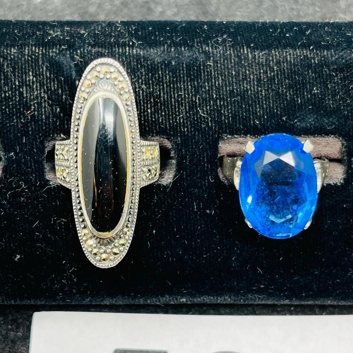 Markasite & Onyx Ring 1 3/8" tall. 3 markasites missing. Marked 925 Size 6.25