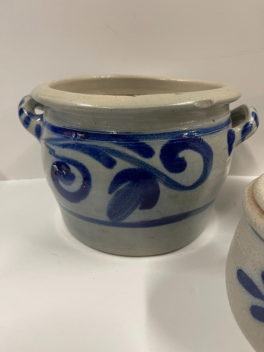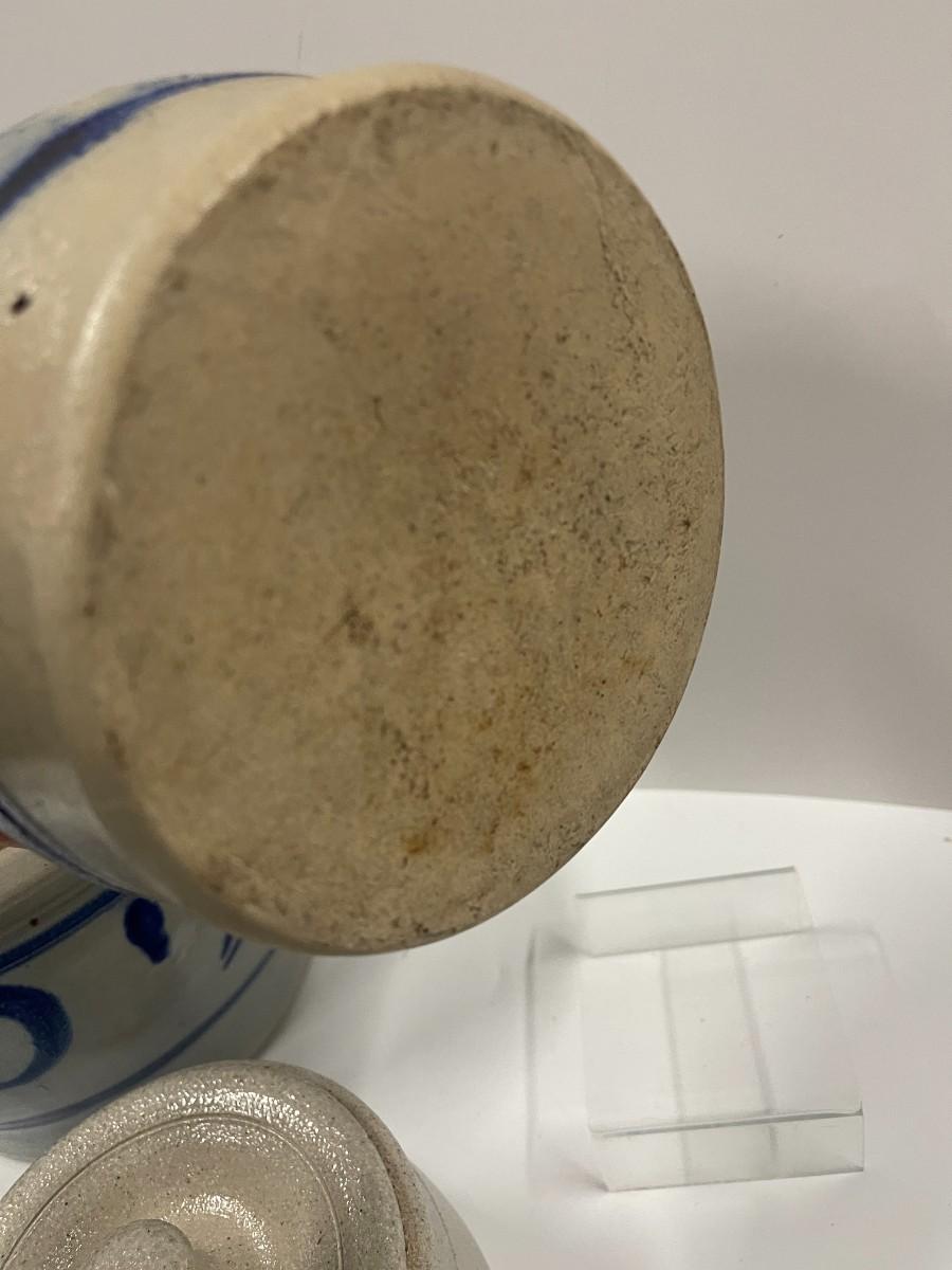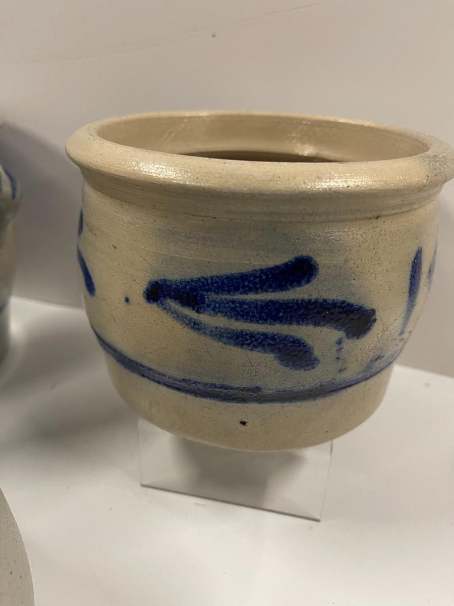 Lot of 3 salt glazed pottery pieces. The largest of the 3 has a chip. 8", 6" and 5"