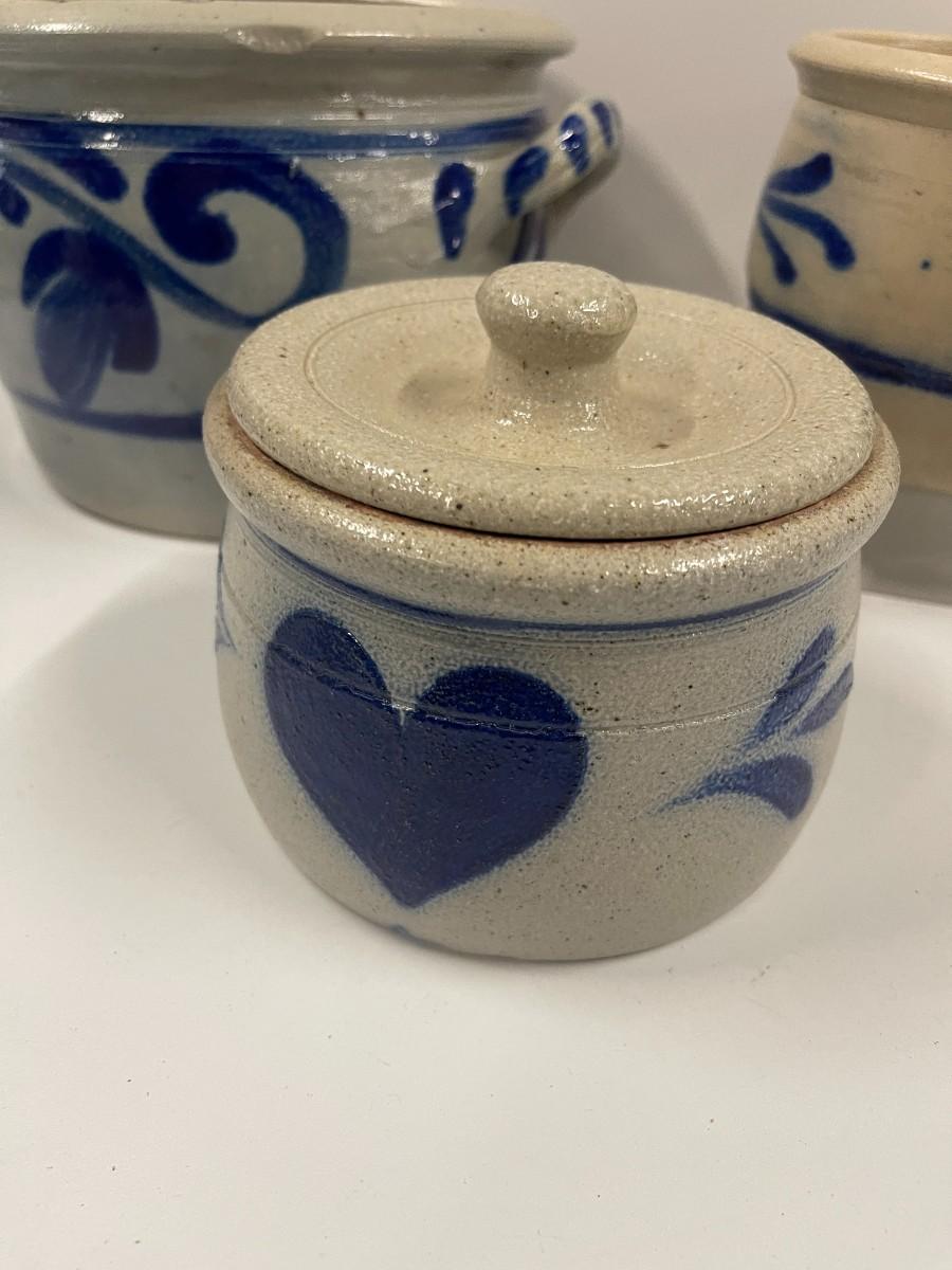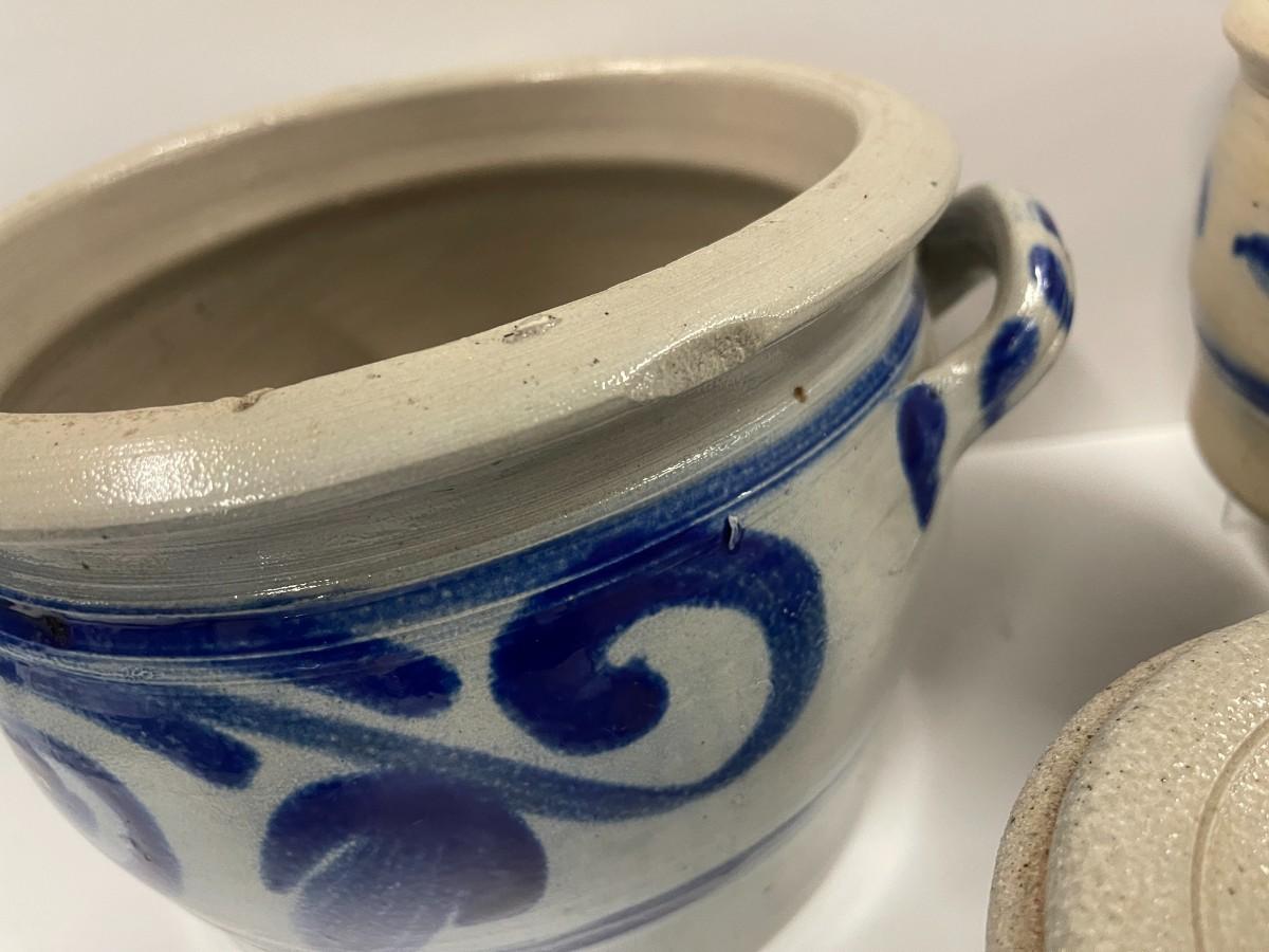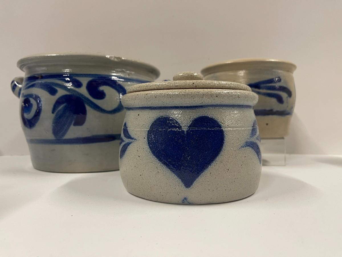 Lot of 3 salt glazed pottery pieces. The largest of the 3 has a chip. 8", 6" and 5"
