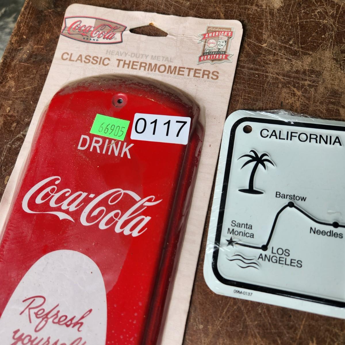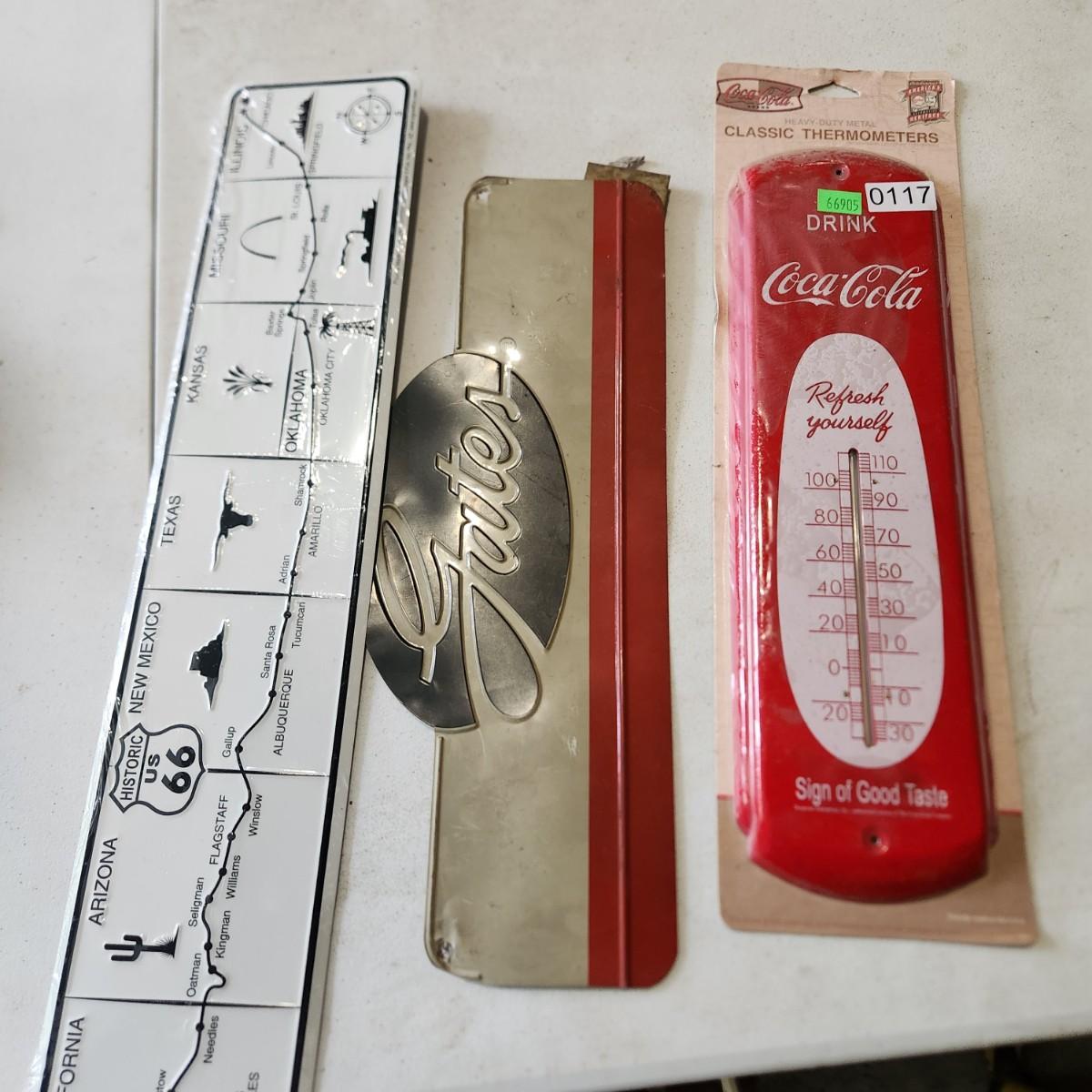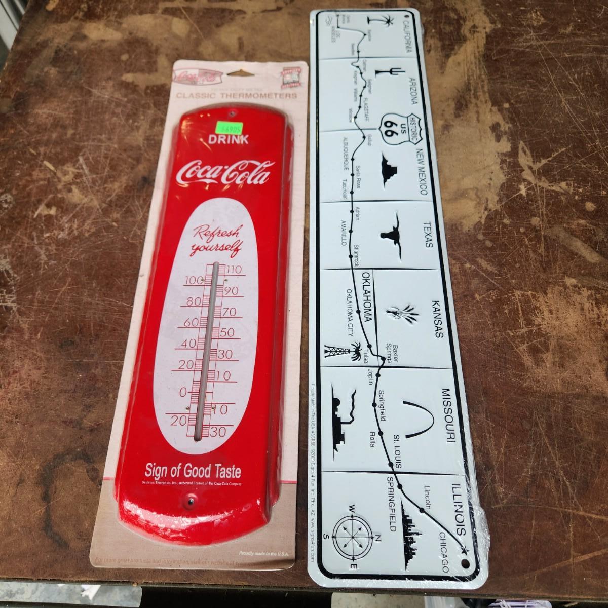Lot of 3 Signs Gates, Coca-Cola Thermometer, Route 66