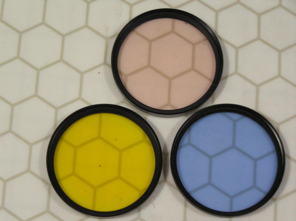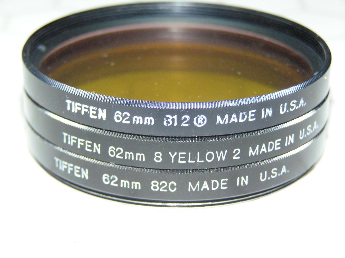 Lot of 3 Tiffen 62mm Photographers correction filters, 1 #812 florescent, 1 #8 Yellow(2), 1 #82C (blue). Clean scratch free glass in excellent condition.