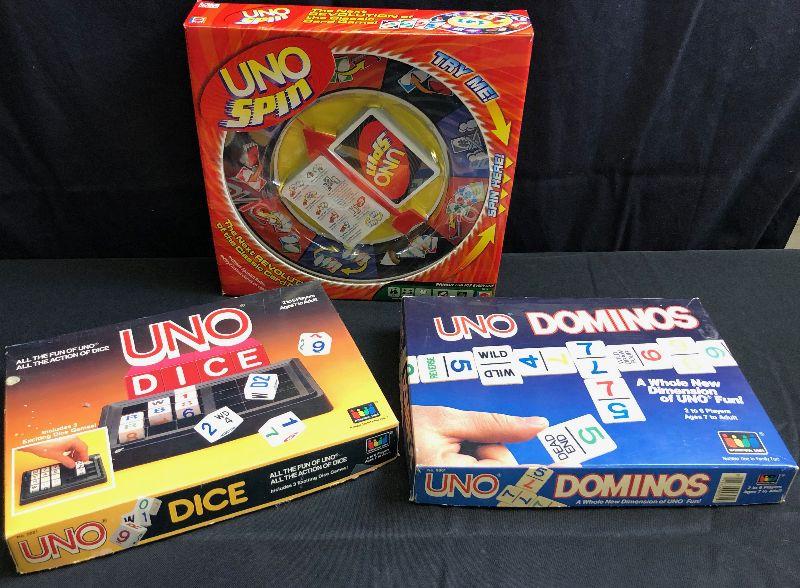 lot of 3 UNO games - UNO Dice UNO Dominos and UNO Spin