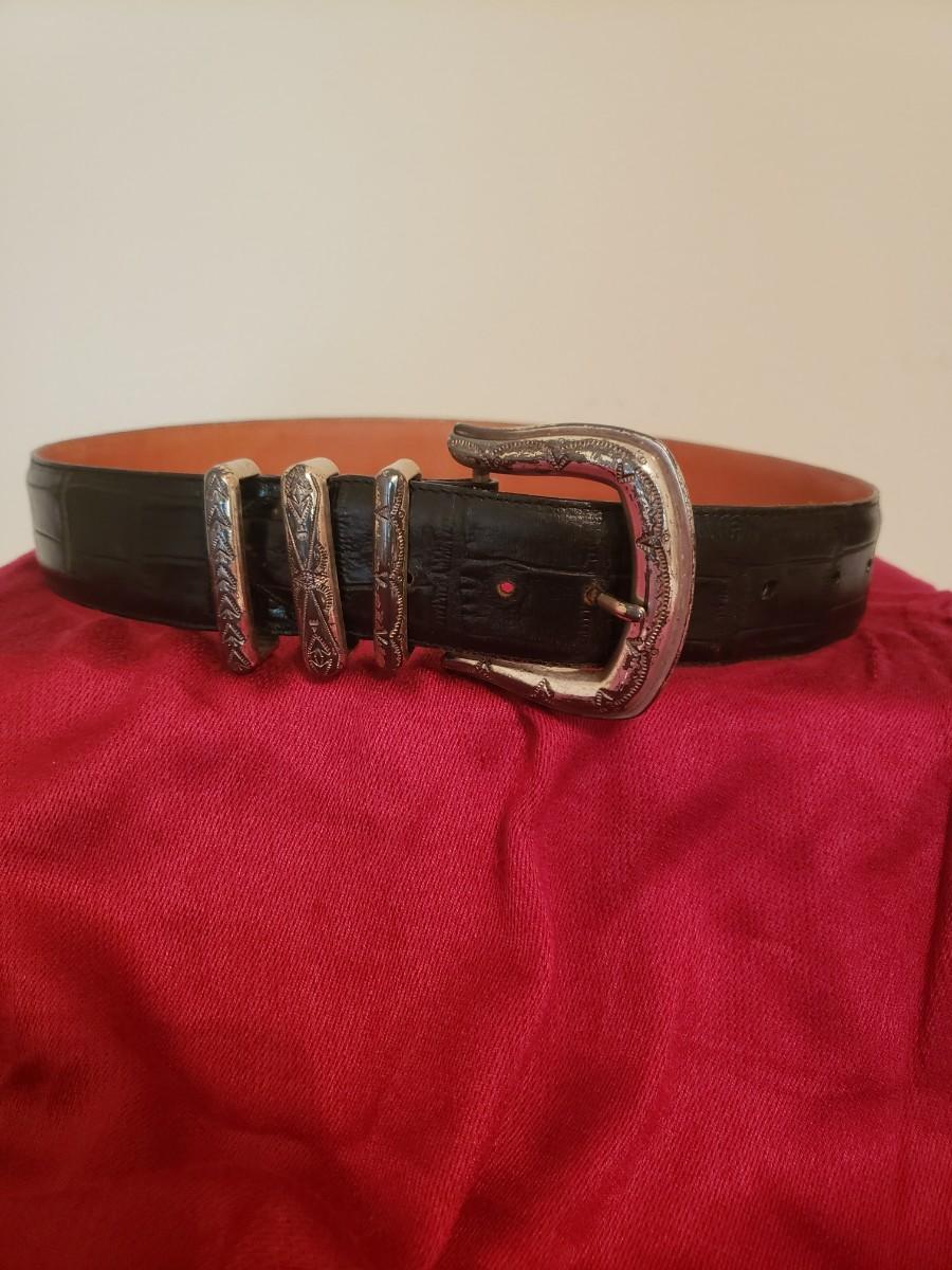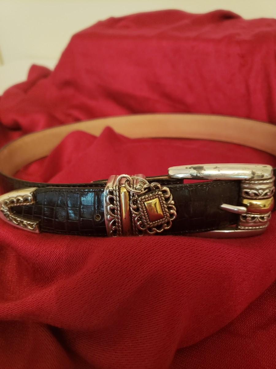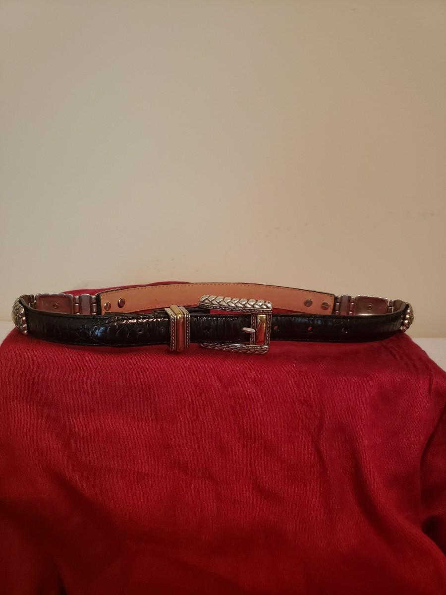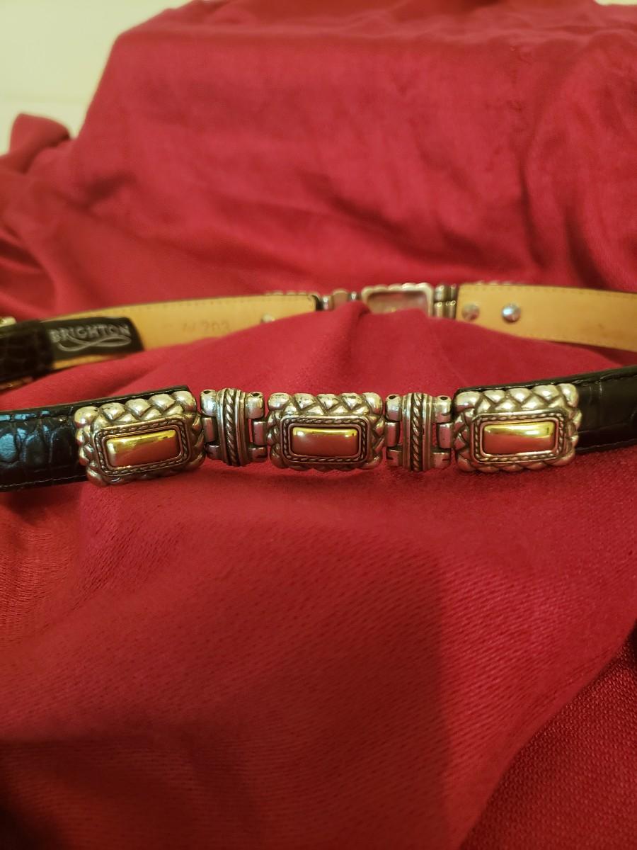 Lot of 3 Vintage Brighton Leather Belts. One is a black leather faux croc belt #49103 Size Small 31"long. Second is a Vintage Brighton black leather belt with silver & gold tone buckle with a charm. #40393 Size small 28. Buckle shows some wear. Third is a Vintage Brighton Black leather belt. Black & gold tone buckle and links. #44203 Very good condition. Size Small.