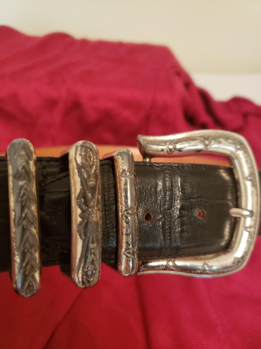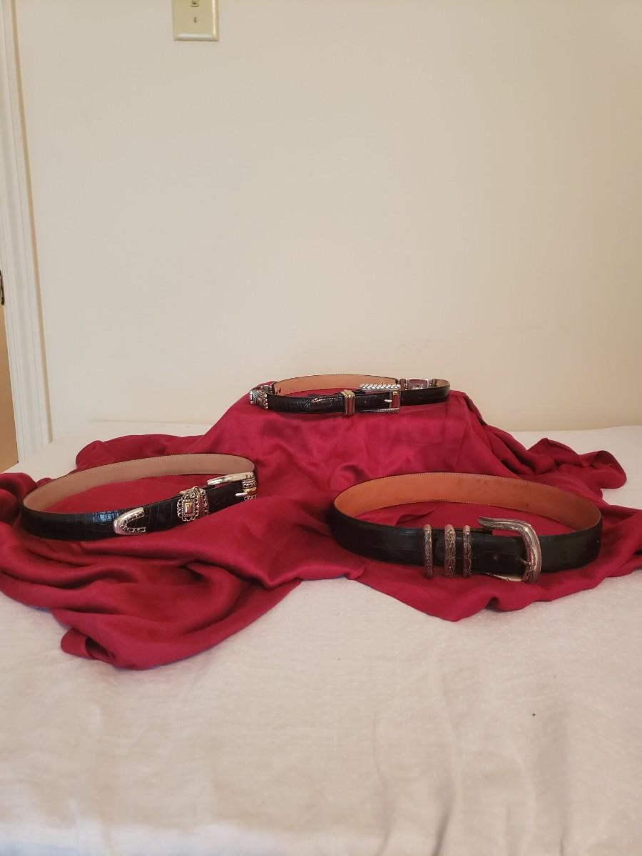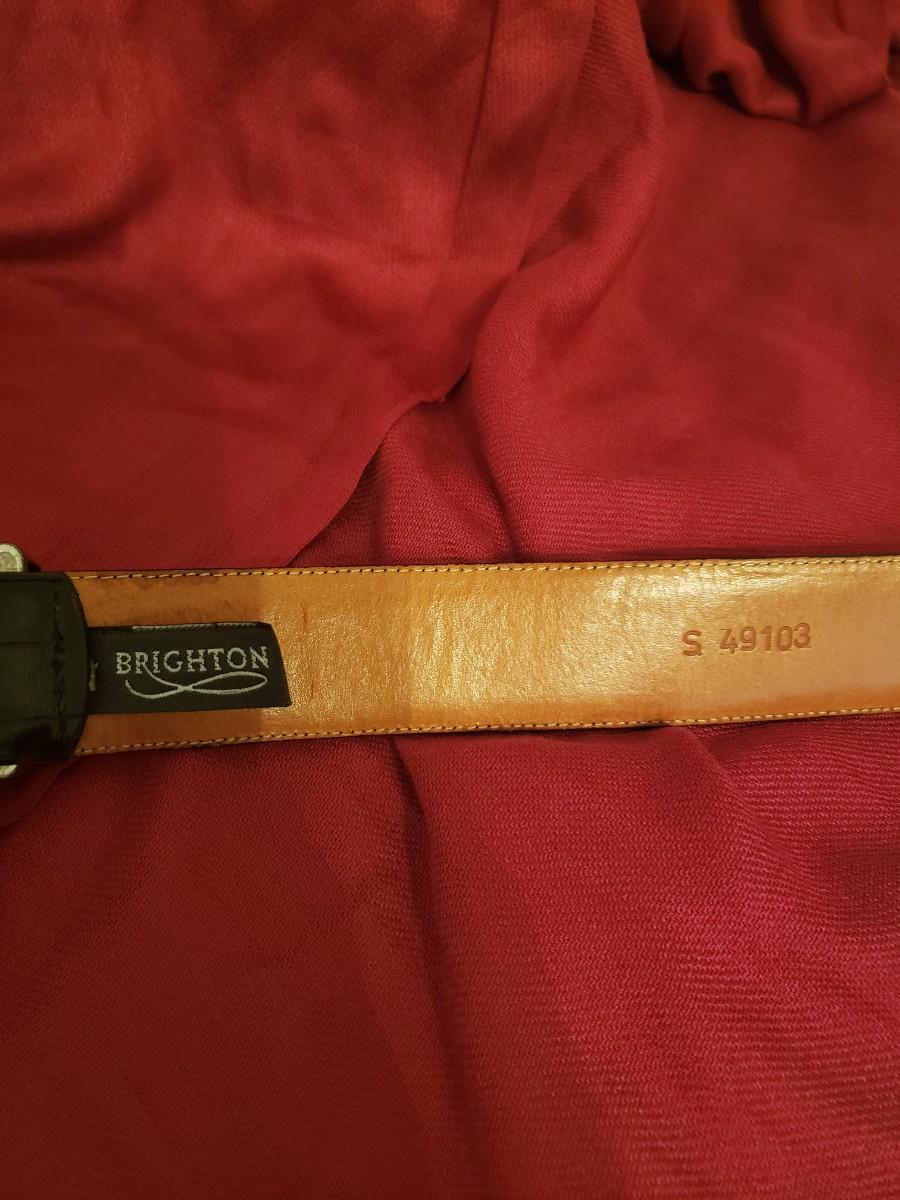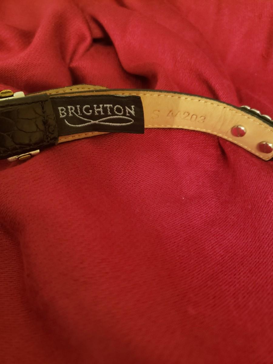 Lot of 3 Vintage Brighton Leather Belts. One is a black leather faux croc belt #49103 Size Small 31"long. Second is a Vintage Brighton black leather belt with silver & gold tone buckle with a charm. #40393 Size small 28. Buckle shows some wear. Third is a Vintage Brighton Black leather belt. Black & gold tone buckle and links. #44203 Very good condition. Size Small.