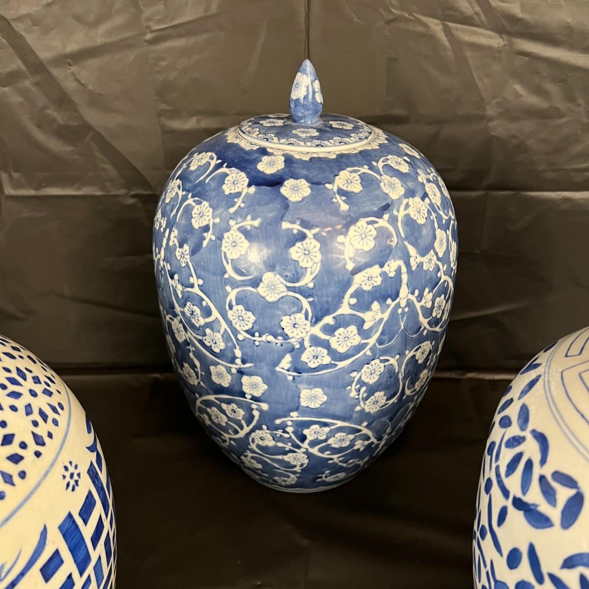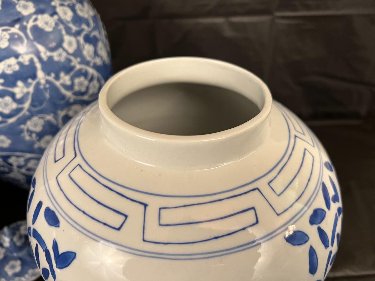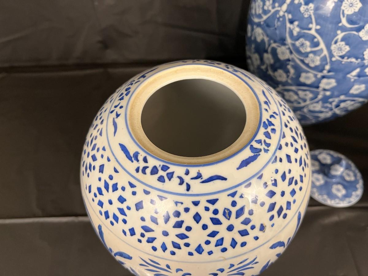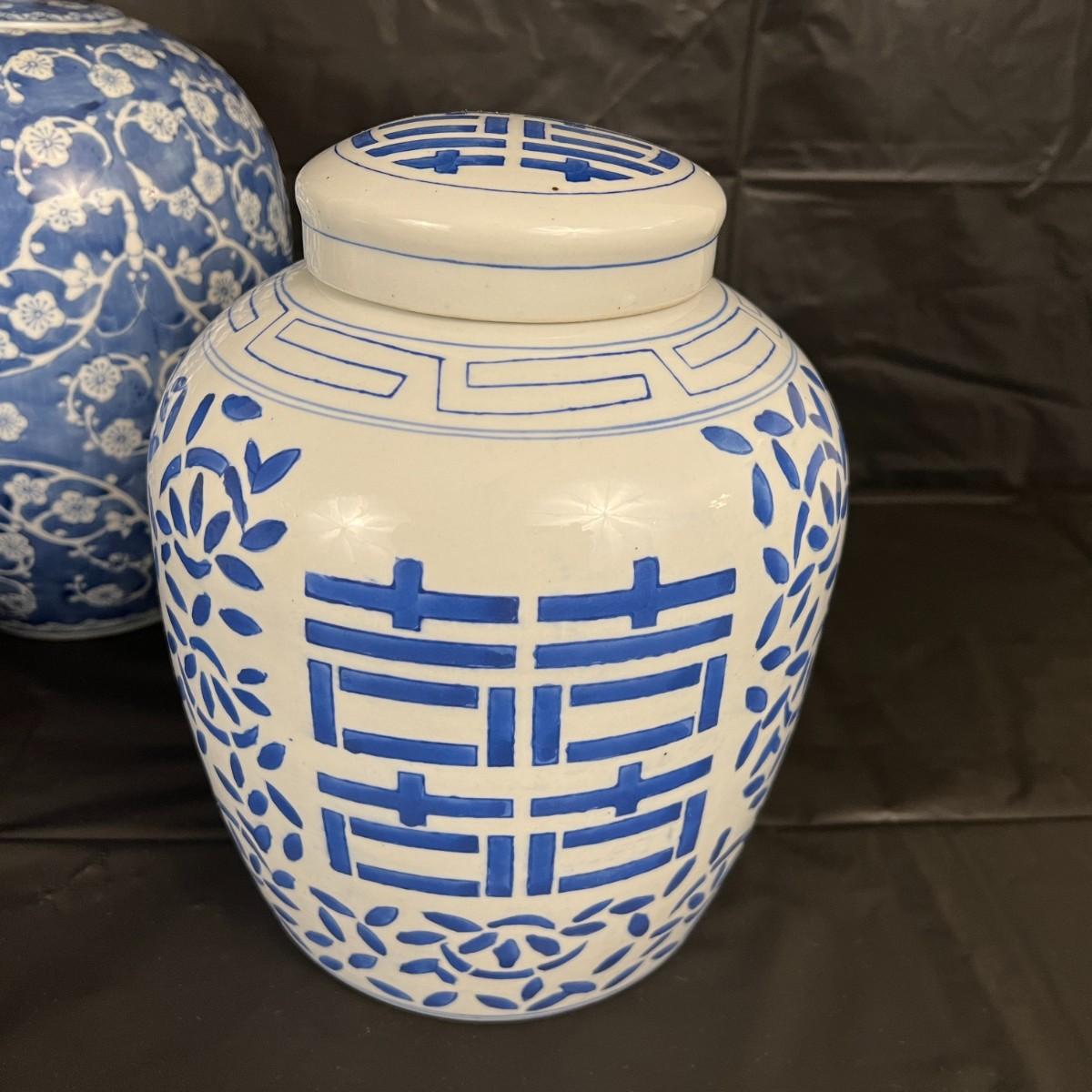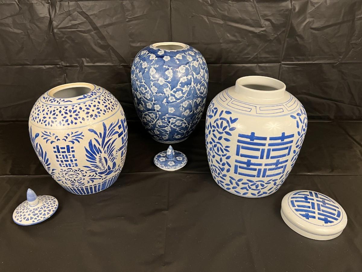 Lot of 3 Vintage Chinese Blue and White Glazed Lidded Vessels or storage jars. Beautiful designs, including floral and leaf patterns, and a chicken or rooster. In very good condition, as shown in images.