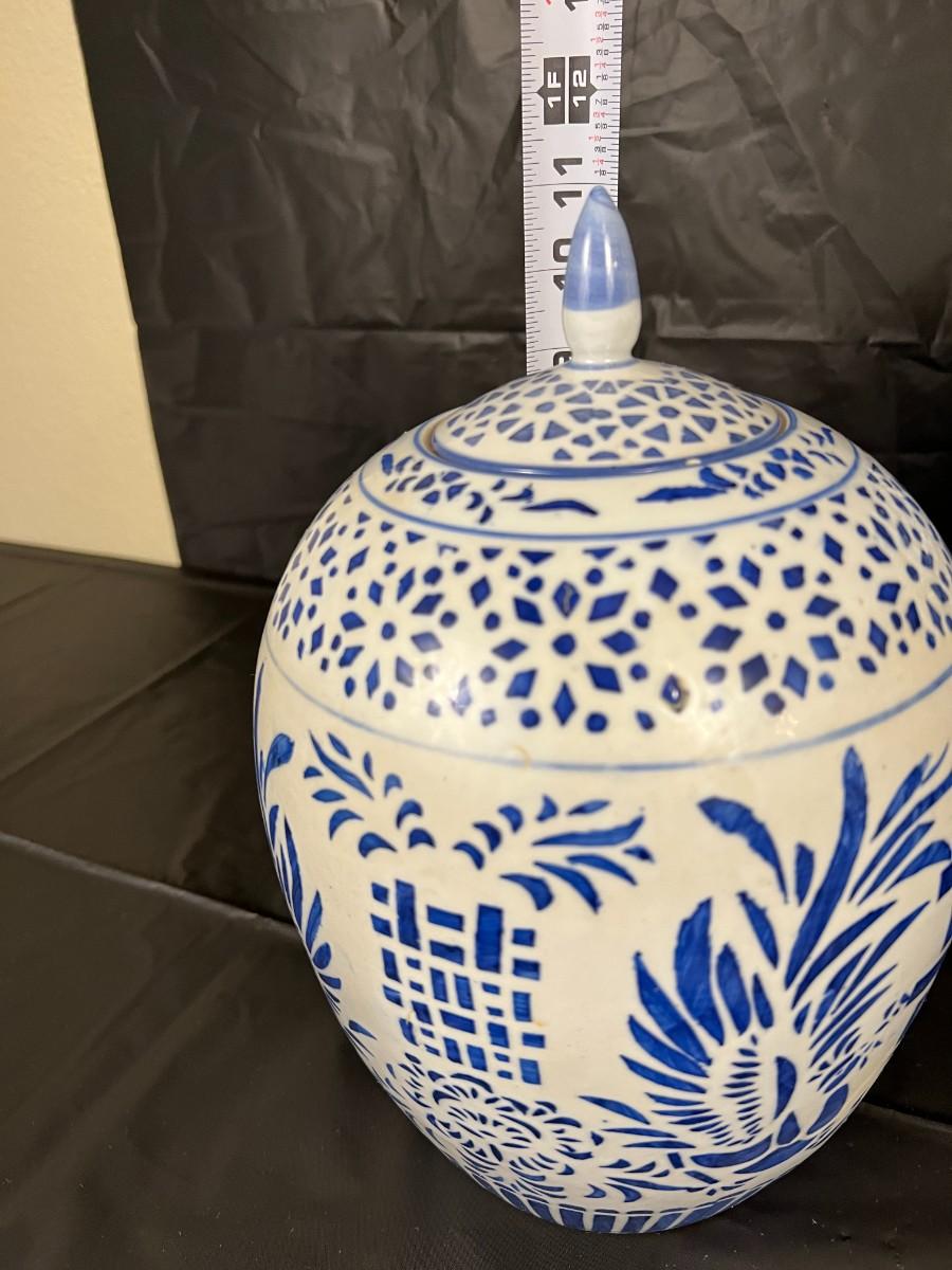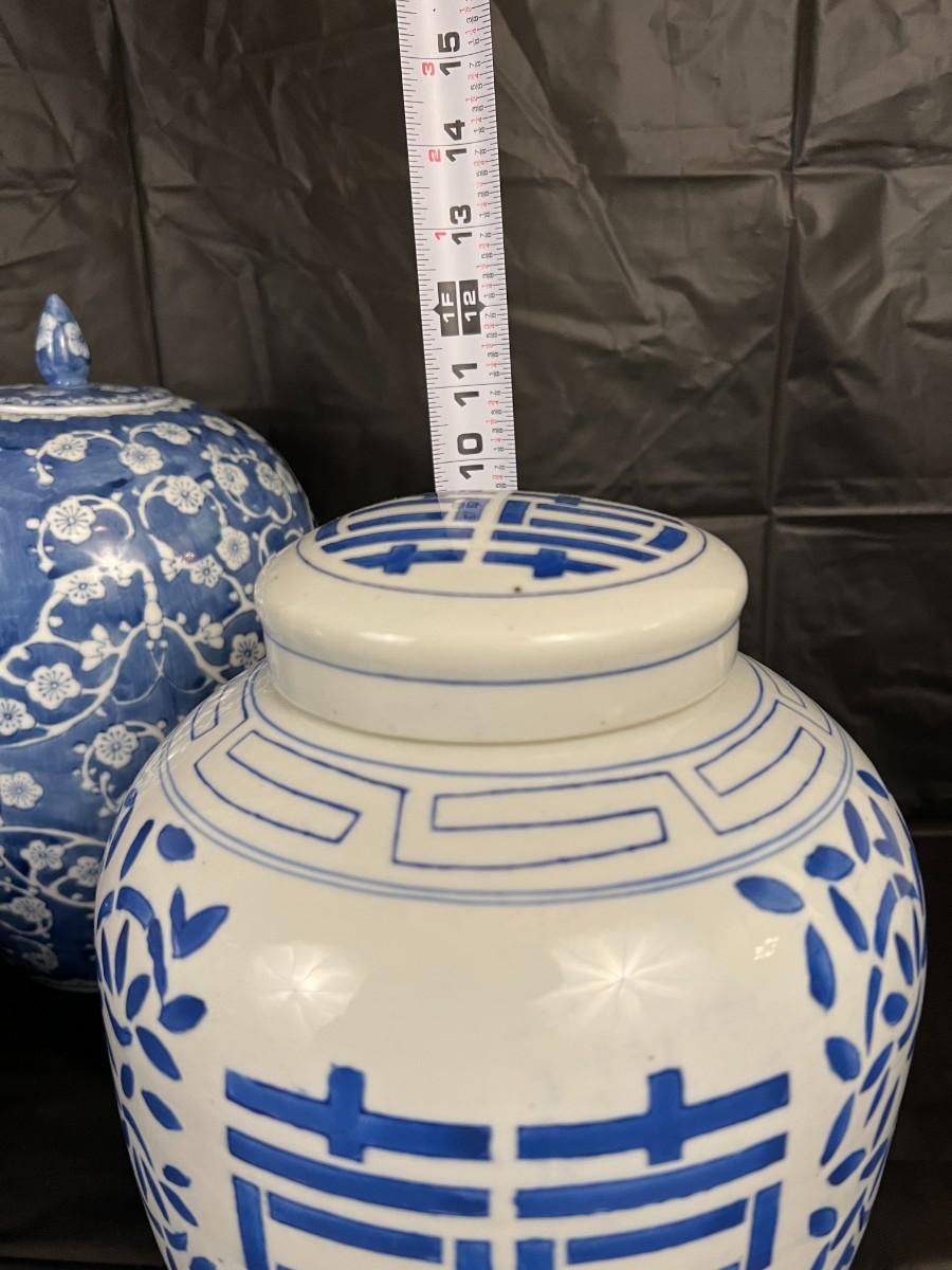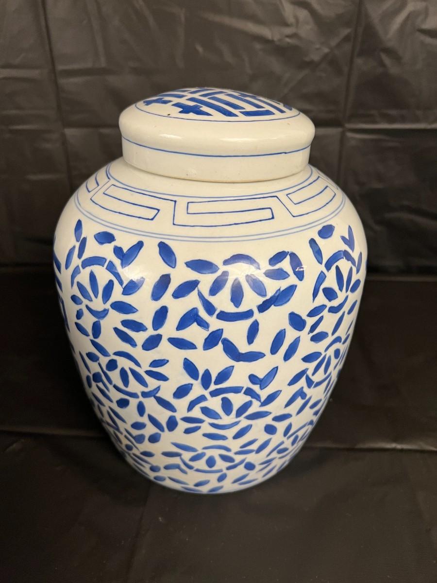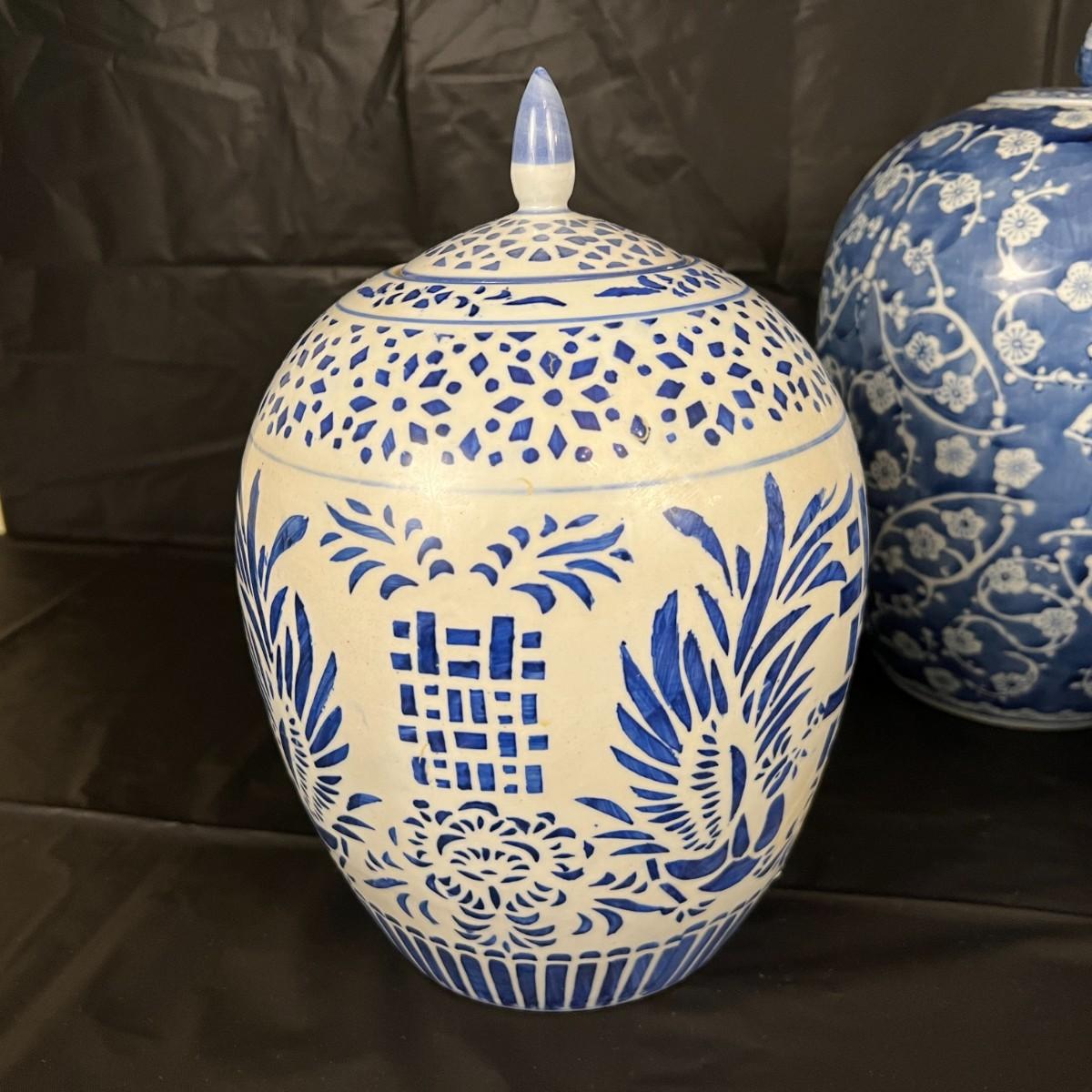 Lot of 3 Vintage Chinese Blue and White Glazed Lidded Vessels or storage jars. Beautiful designs, including floral and leaf patterns, and a chicken or rooster. In very good condition, as shown in images.