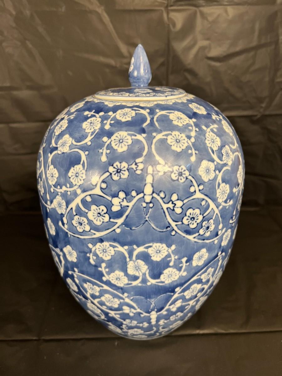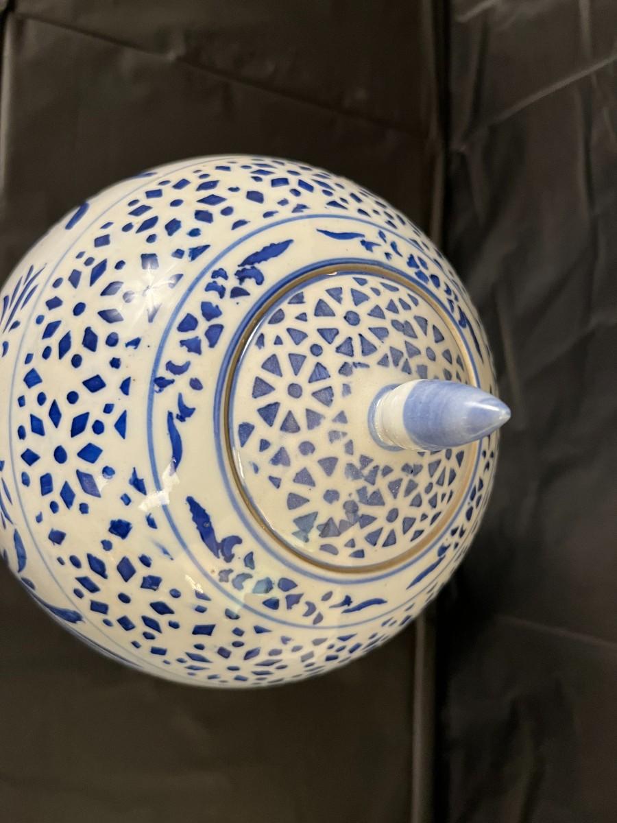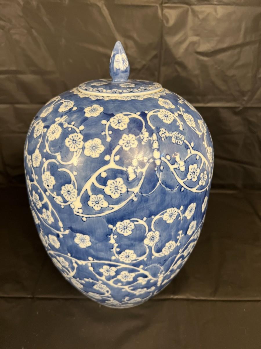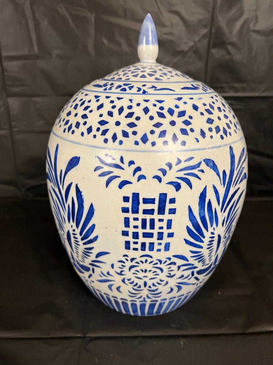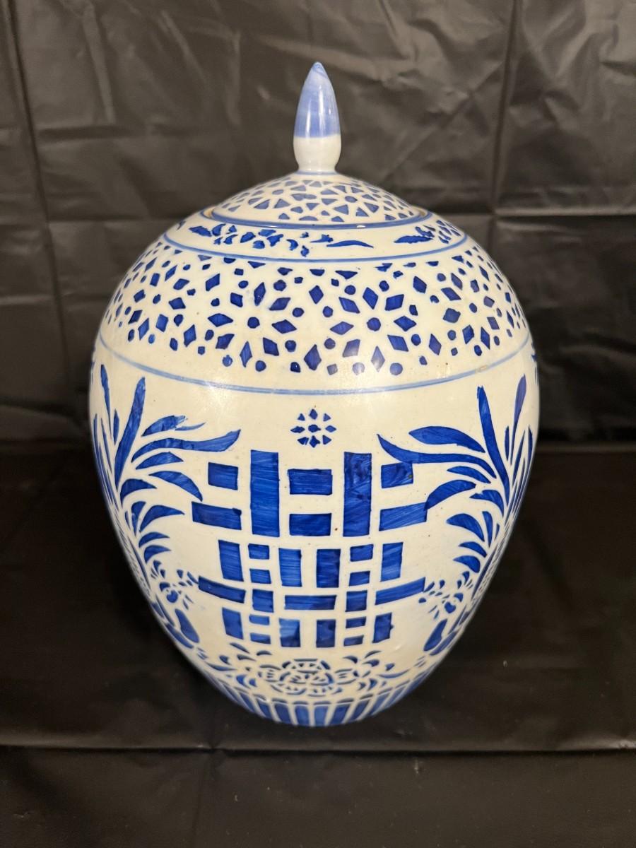 Lot of 3 Vintage Chinese Blue and White Glazed Lidded Vessels or storage jars. Beautiful designs, including floral and leaf patterns, and a chicken or rooster. In very good condition, as shown in images.