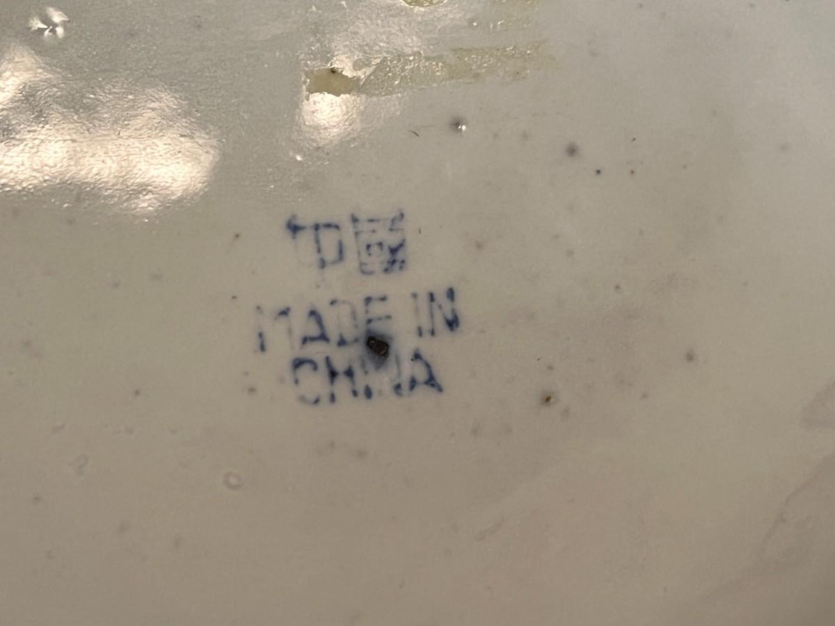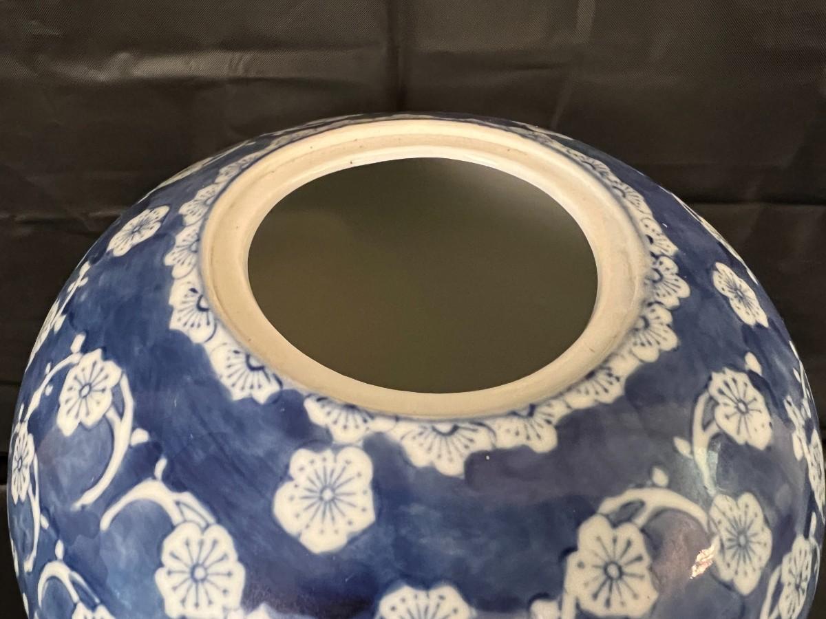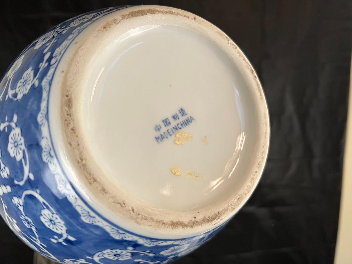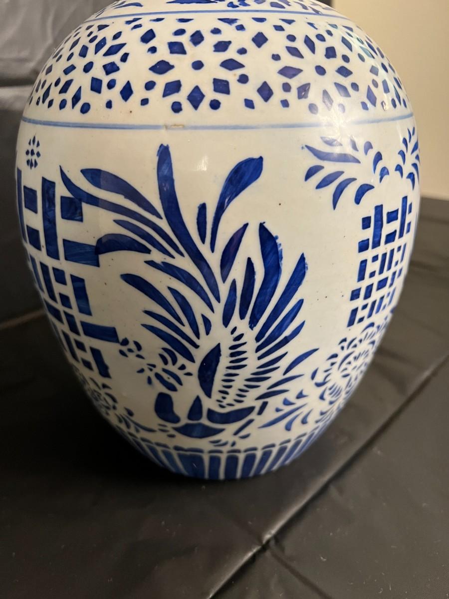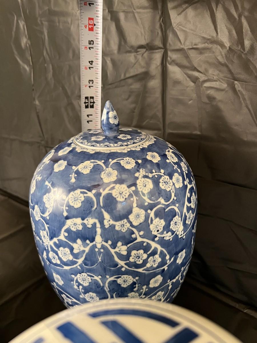 Lot of 3 Vintage Chinese Blue and White Glazed Lidded Vessels or storage jars. Beautiful designs, including floral and leaf patterns, and a chicken or rooster. In very good condition, as shown in images.