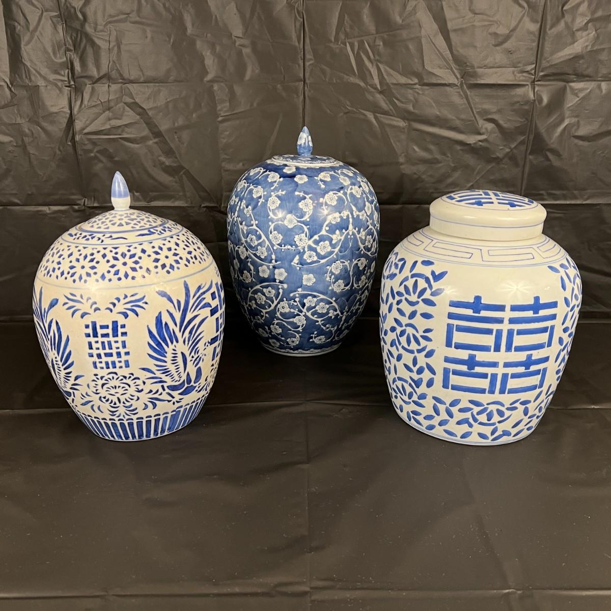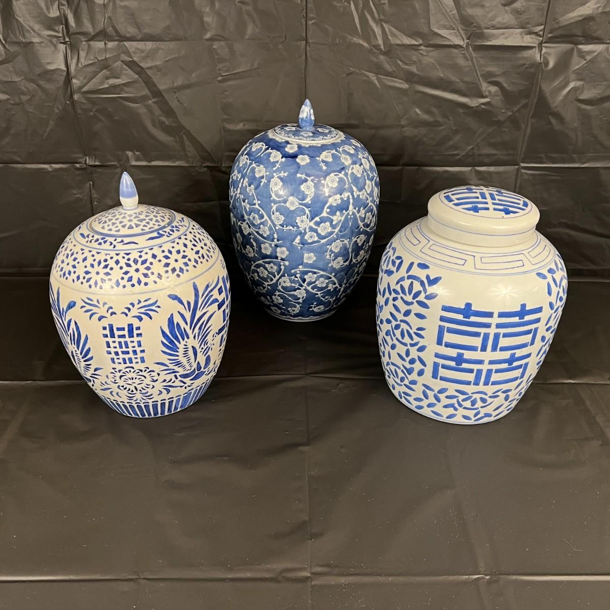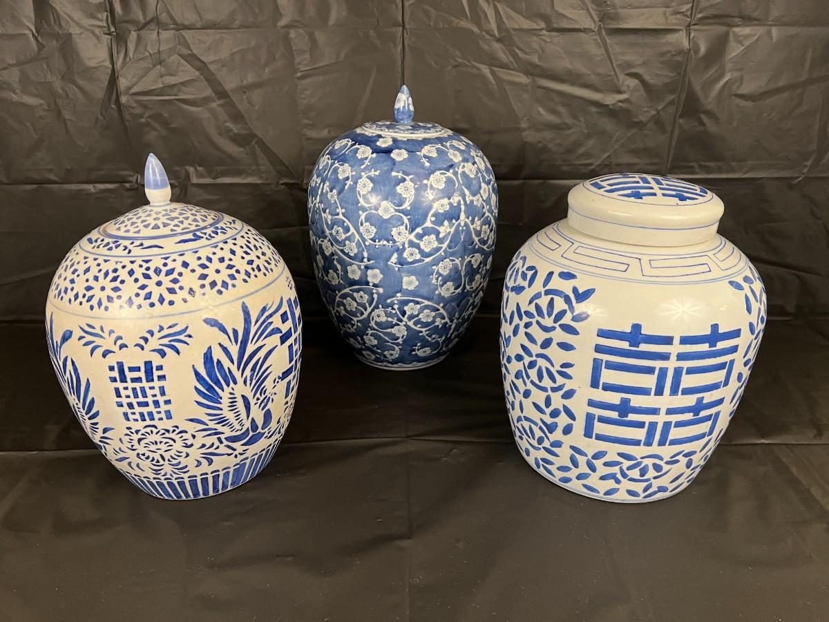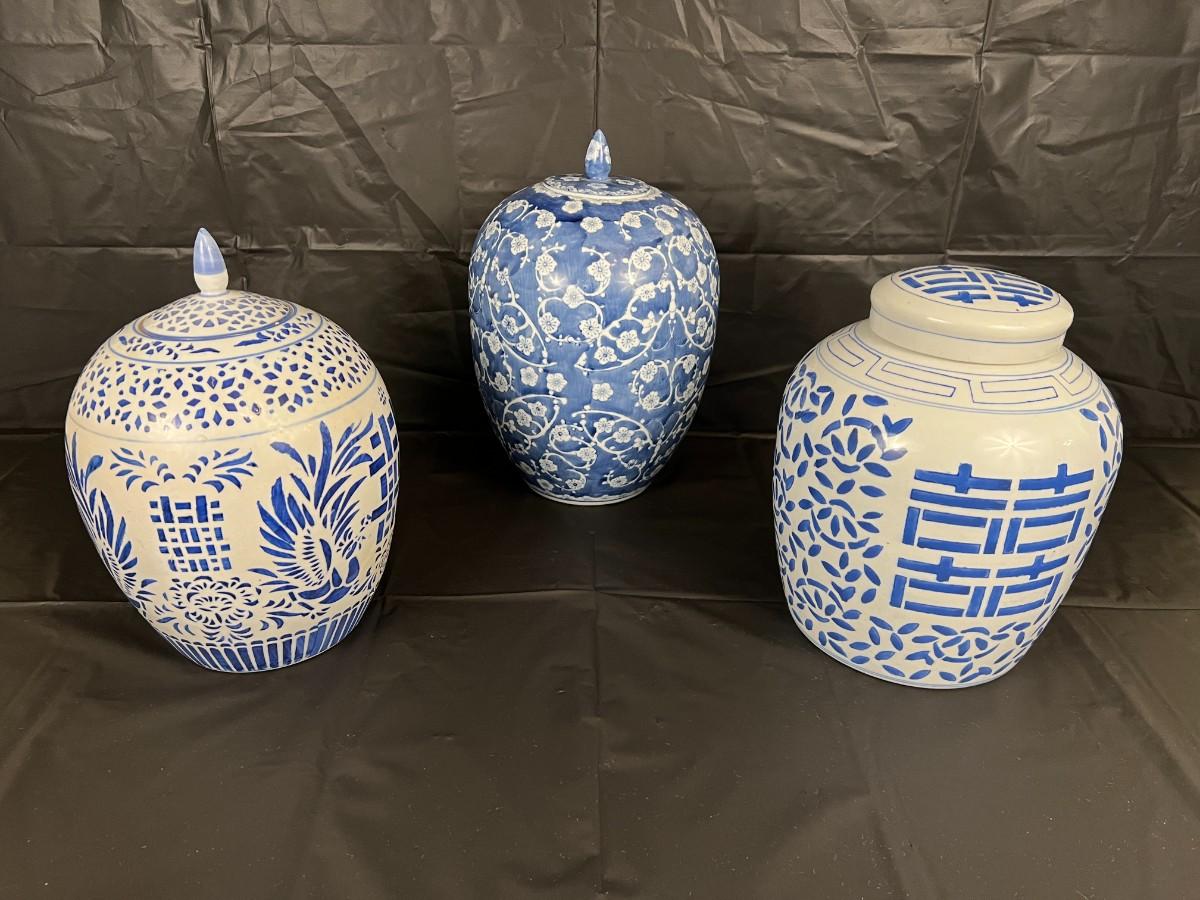 Lot of 3 Vintage Chinese Blue and White Glazed Lidded Vessels