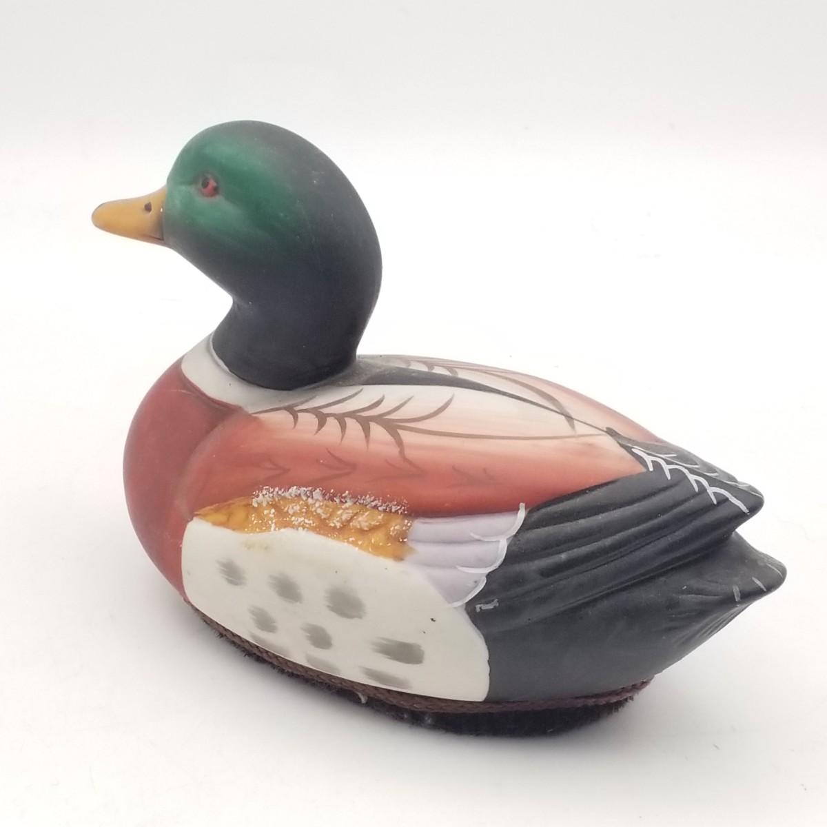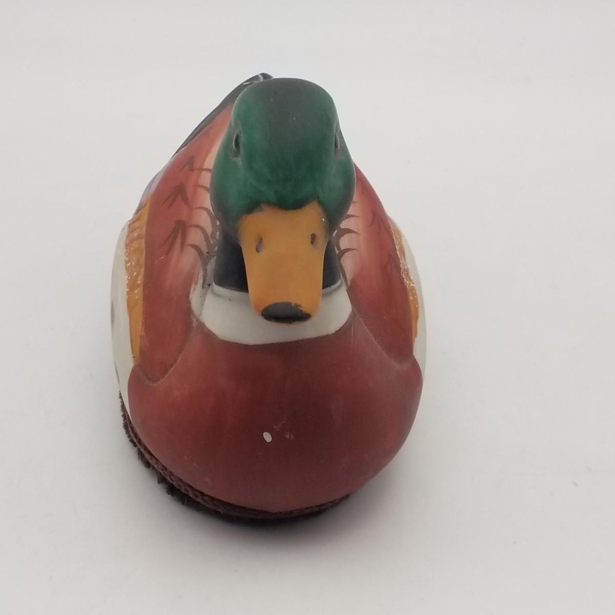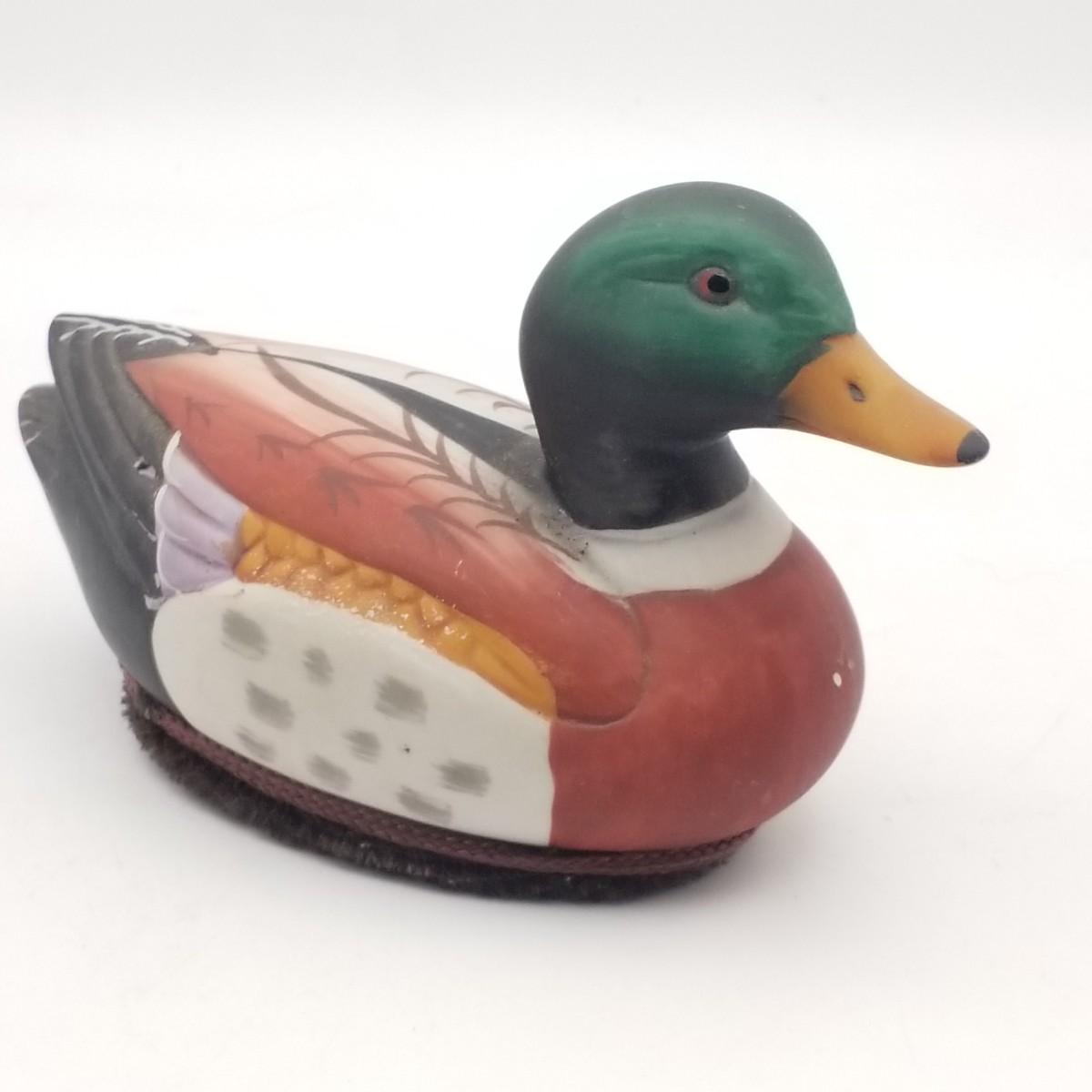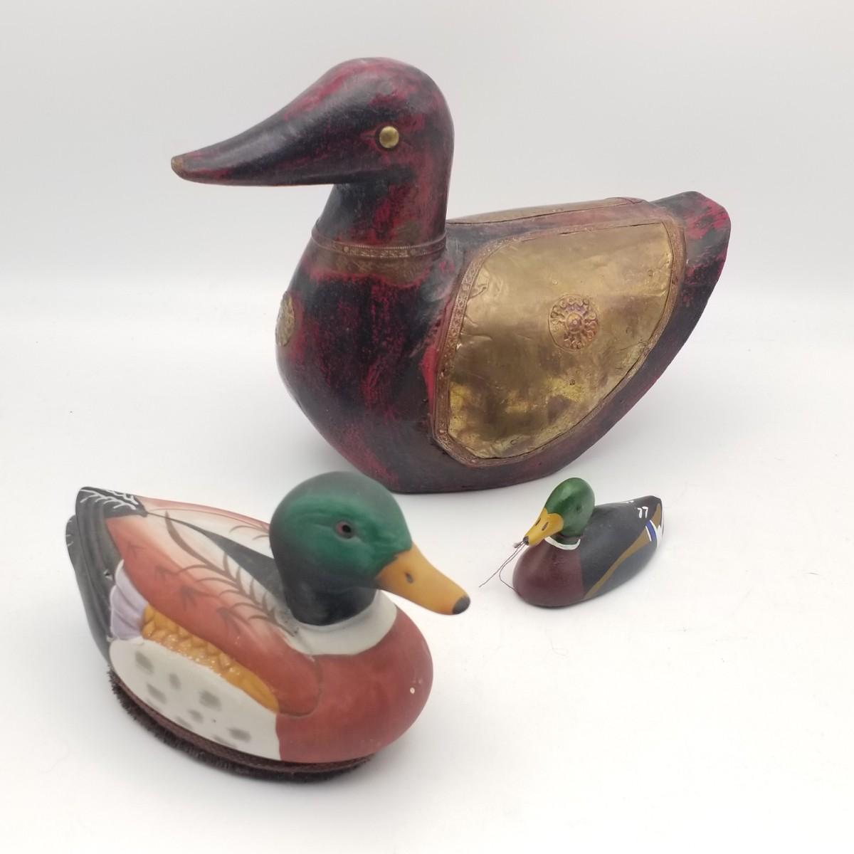 Lot of 3 Vintage Ducks / Swan Decorative Decoys, Handpainted: Handcarved Wood & Brass, Ceramic Jasco Lint Remover Brush, Cast Iron Metal Mallard Drake Made in USA