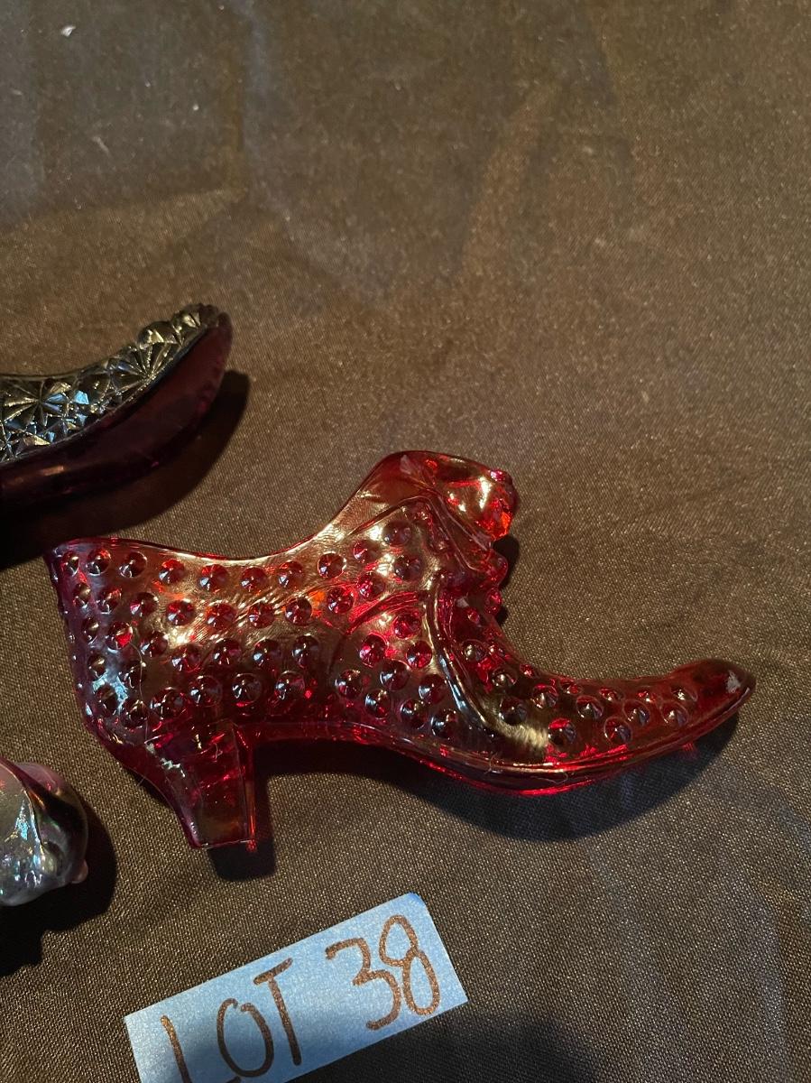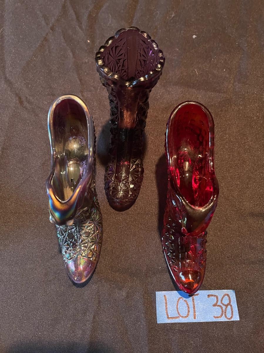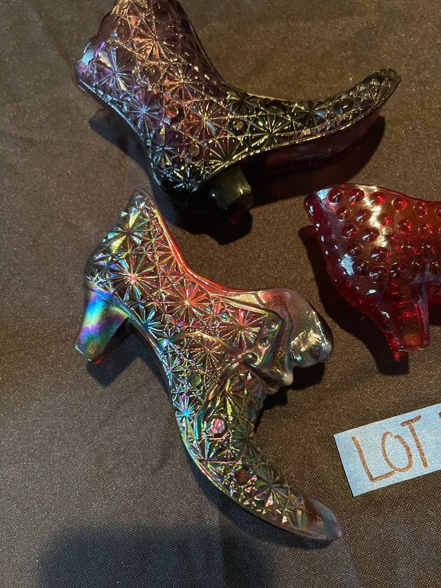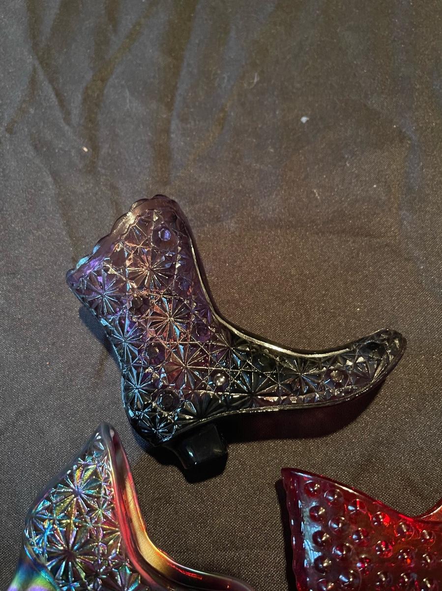 (1) Carnival glass, (1) Amethyst cut glass, (1) Ruby red heel)