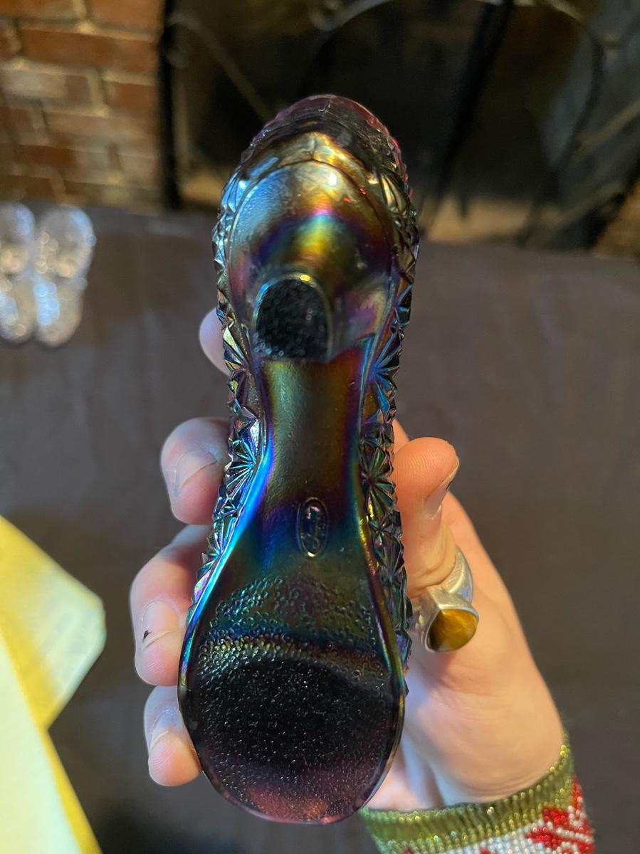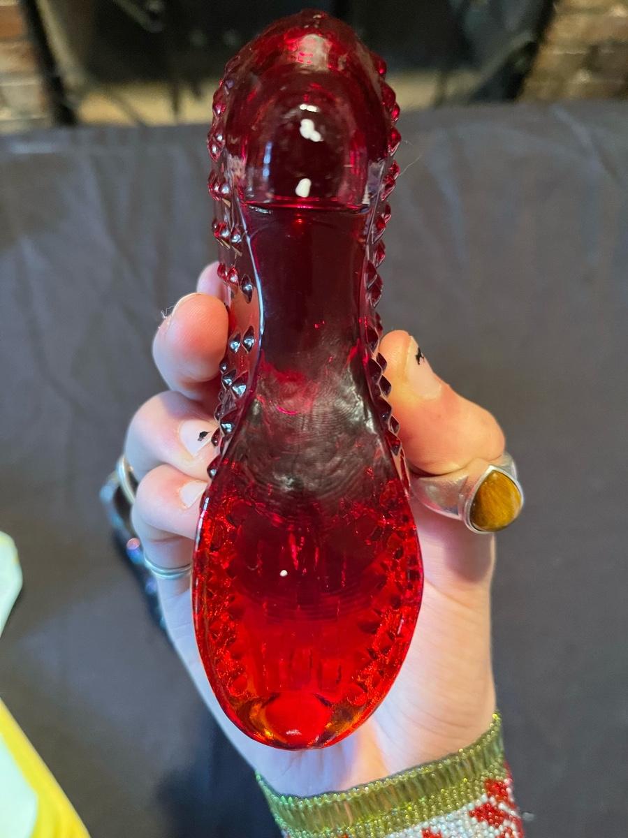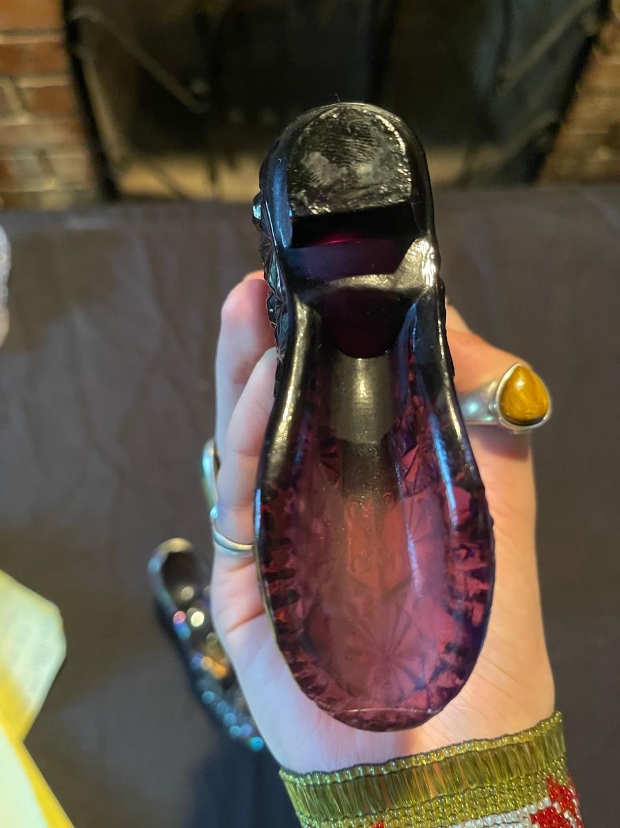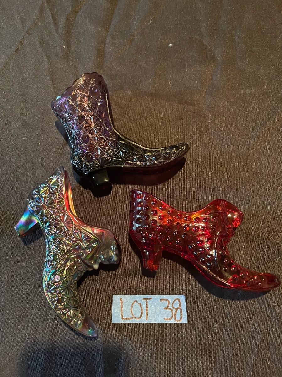 (1) Carnival glass, (1) Amethyst cut glass, (1) Ruby red heel)