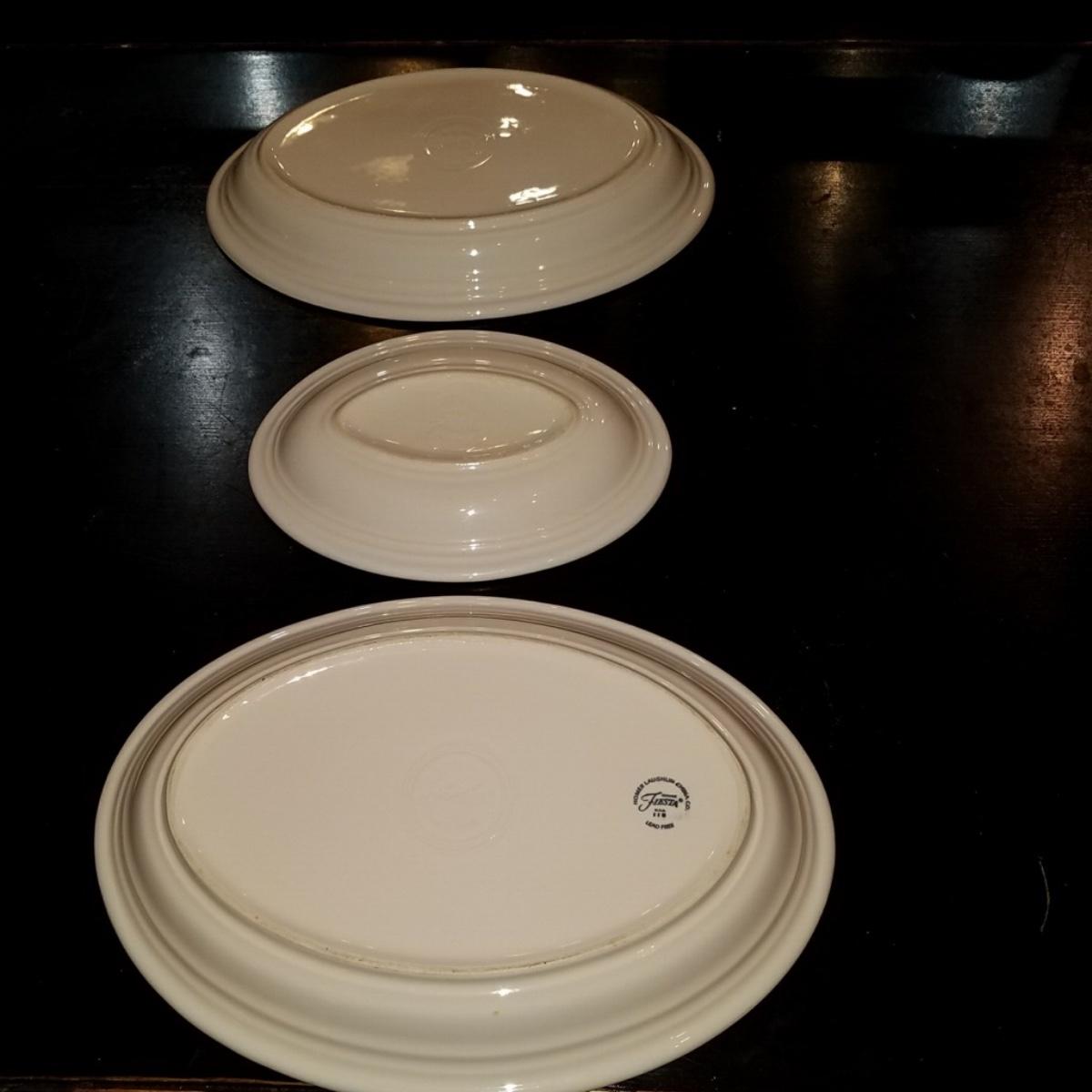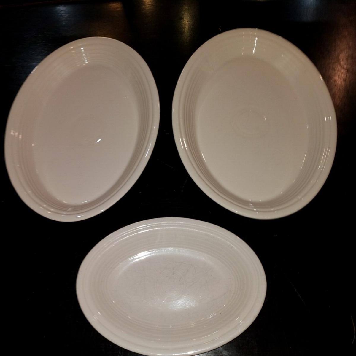 Lot of 3 vintage Fiesta Ware platters, white. 2 large, 13.5” x 9.5”, 1 small 9.5” x 7”. Small one has some scratches, otherwise all in good condition