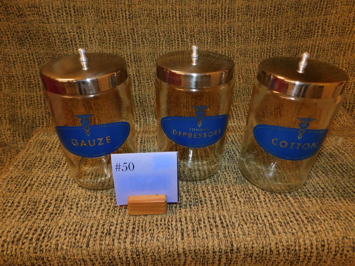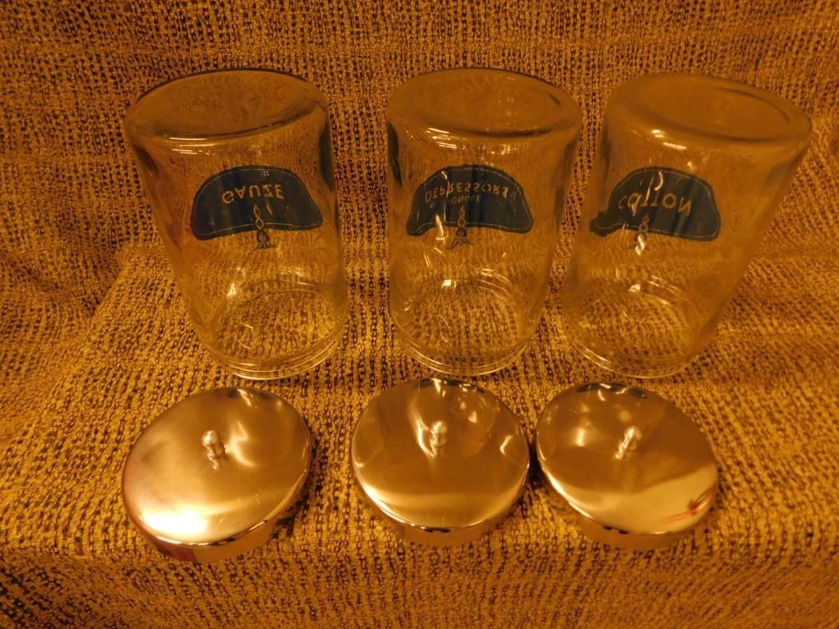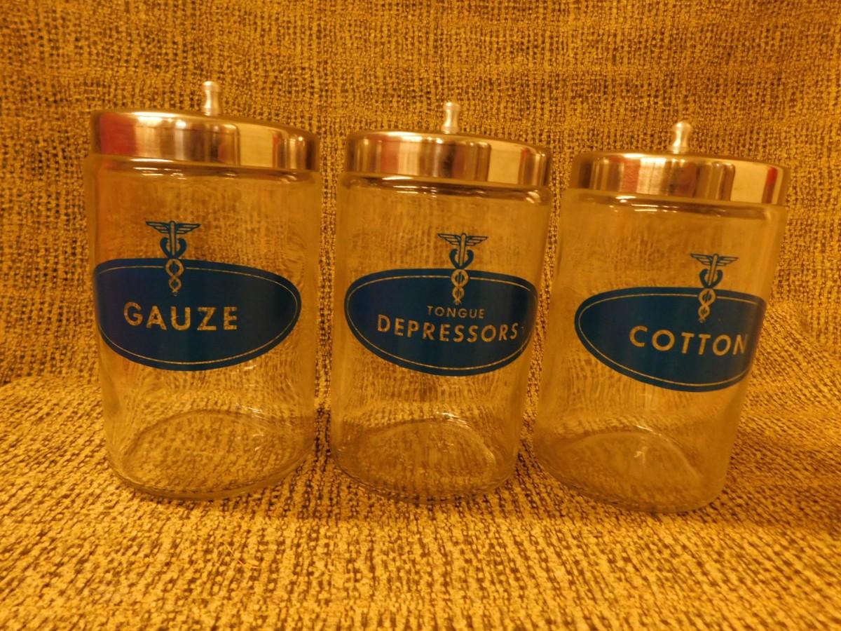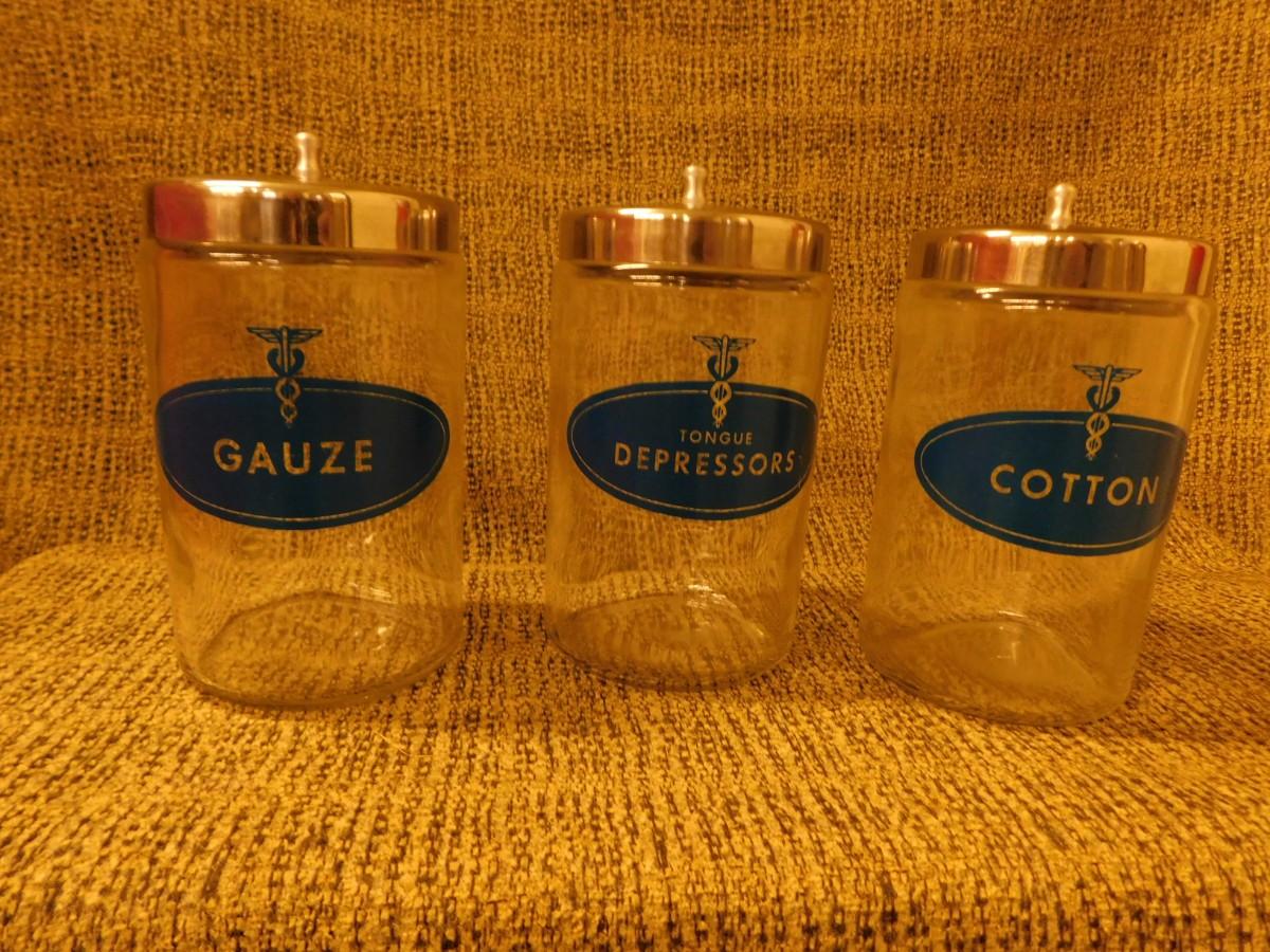 Lot of 3 Vintage Glass Apothecary Jars - Cotton, Gauze, + Tongue Depressors