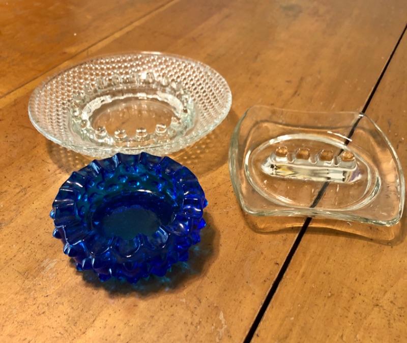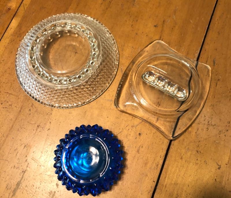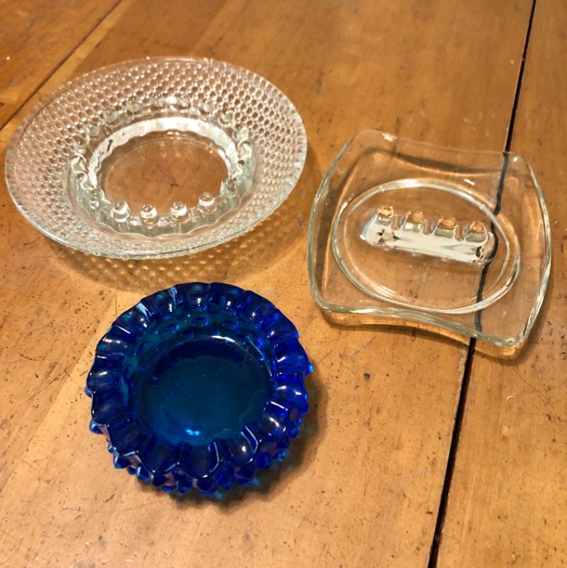 3 vintage glass ashtrays. 2 are clear, the other a wonderful blue. No chips.