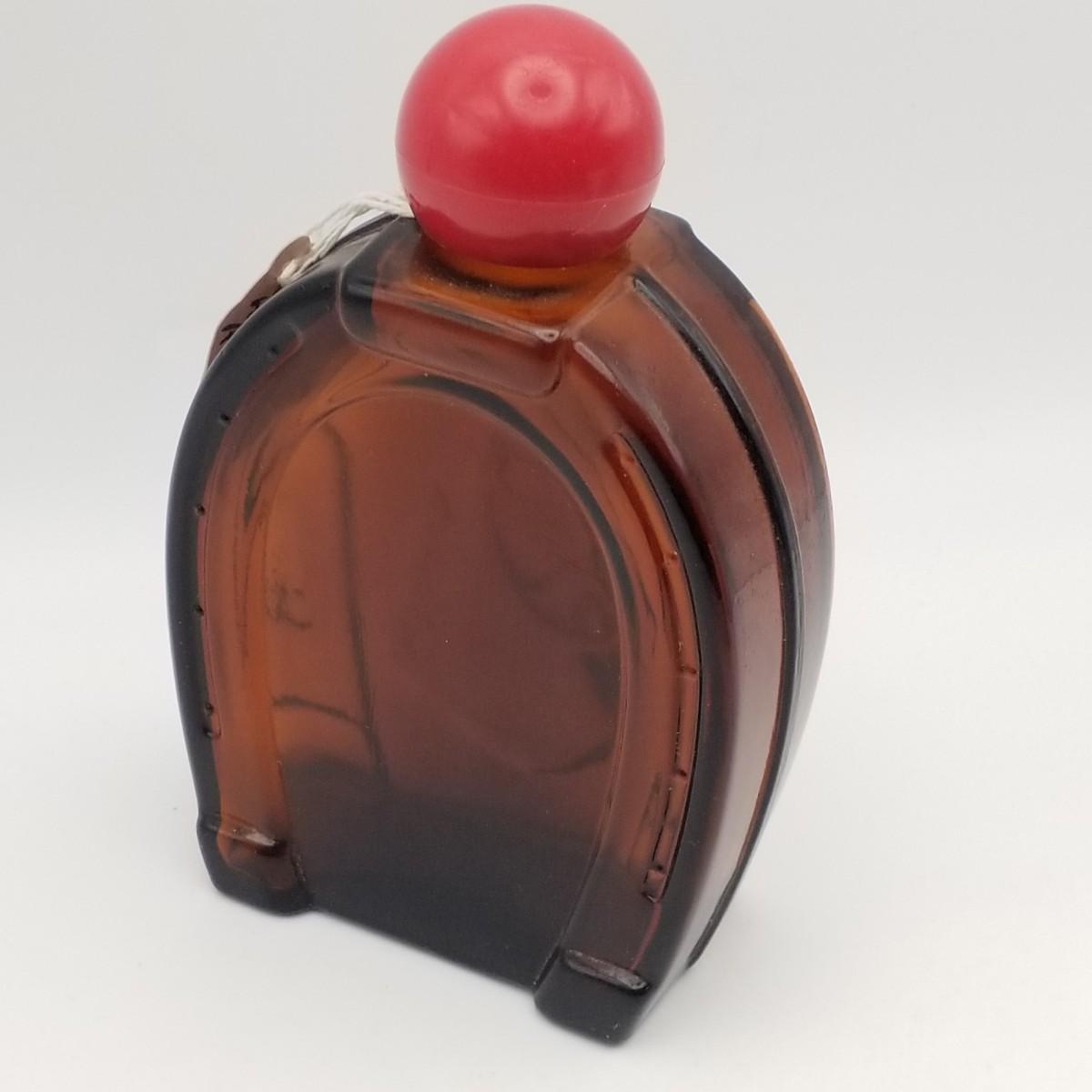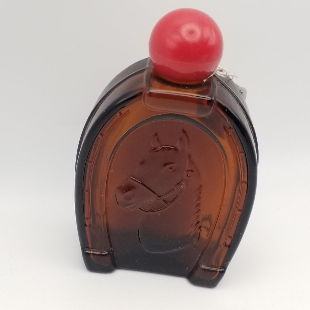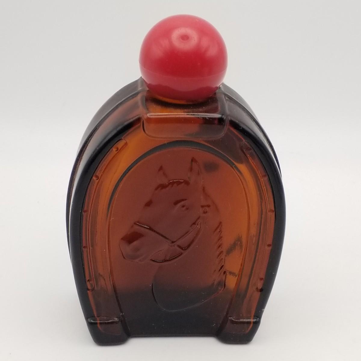 Avon "Triple Crown" After Shave 4 fl oz Bottle, Brown Glass Bottle, Red Plastic Cap / Lid. Front of bottle features Horse Head / Profile and Horseshoe Design; Back of bottle features Horseshoe Design. Measures approximately 3 wide x 5 x 1 1/2 inches.