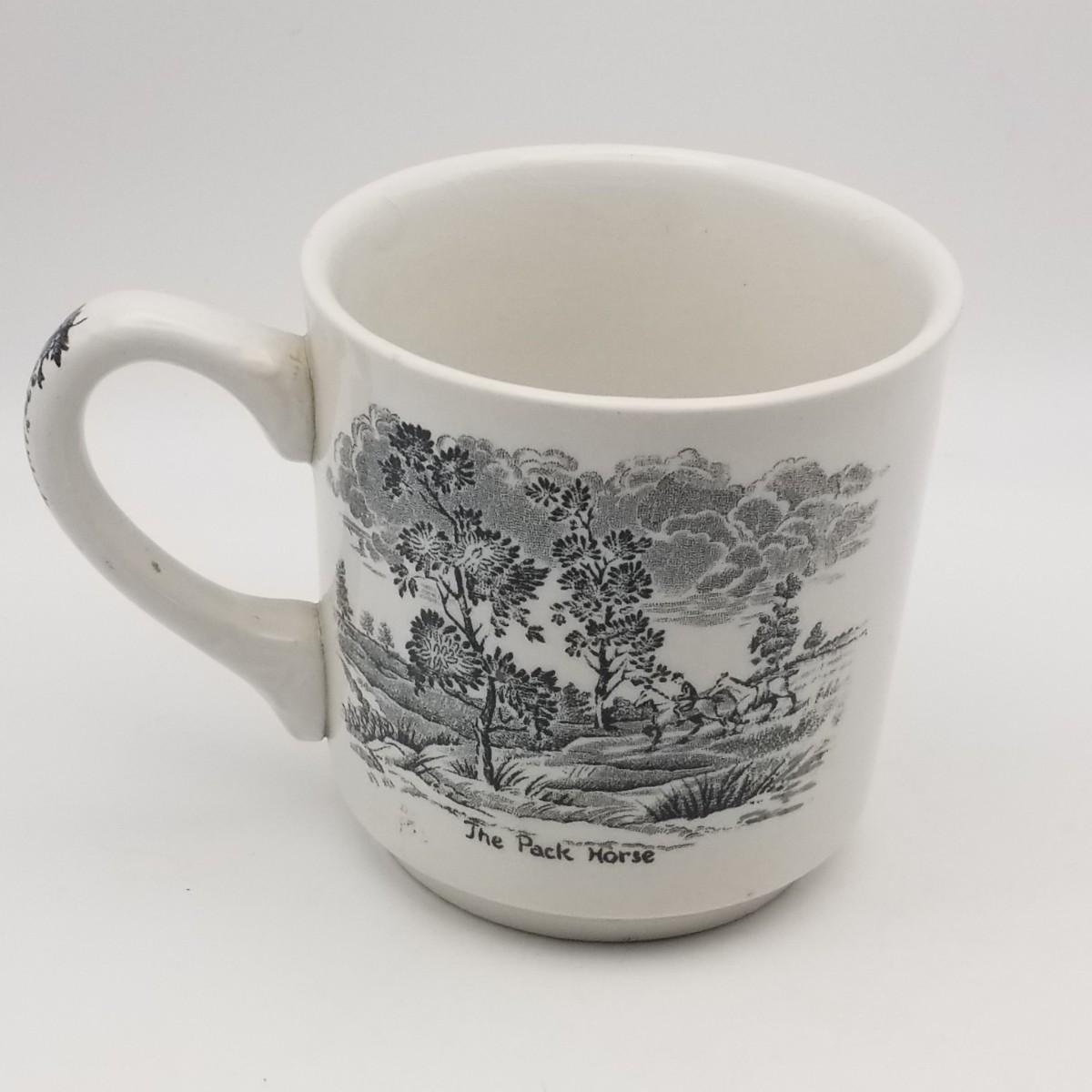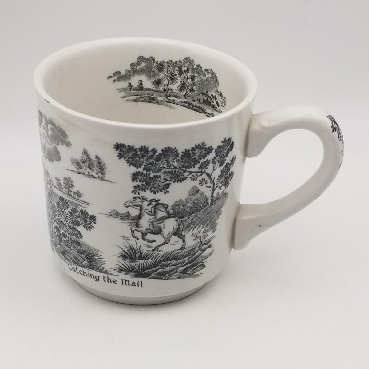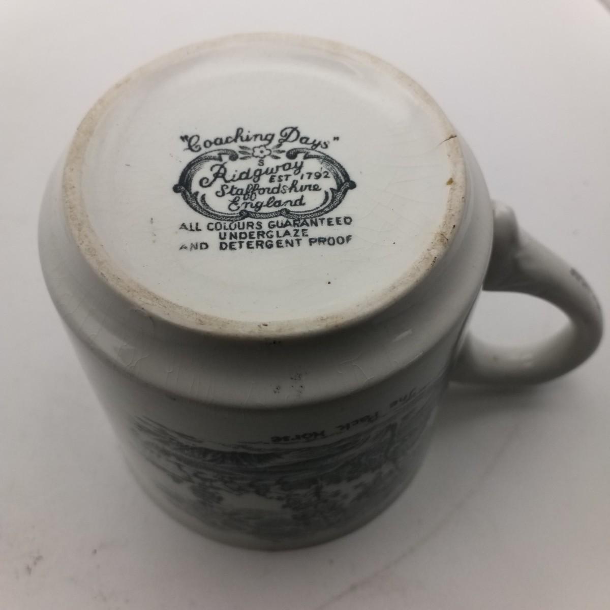White and Black "Coaching Days" Ridgeway Staffordshire Pottery England Mug Cup (Transferware / Earthenware). Some crazing on bottom of mug near maker's mark, near where handle and mug joins near the bottom of the mug, and where the glaze pooled during manufacture; otherwise interior of mug appears unaffected. Measures approximately 3 1/2 wide x 5 (with handle) x 3 1/2 inches.