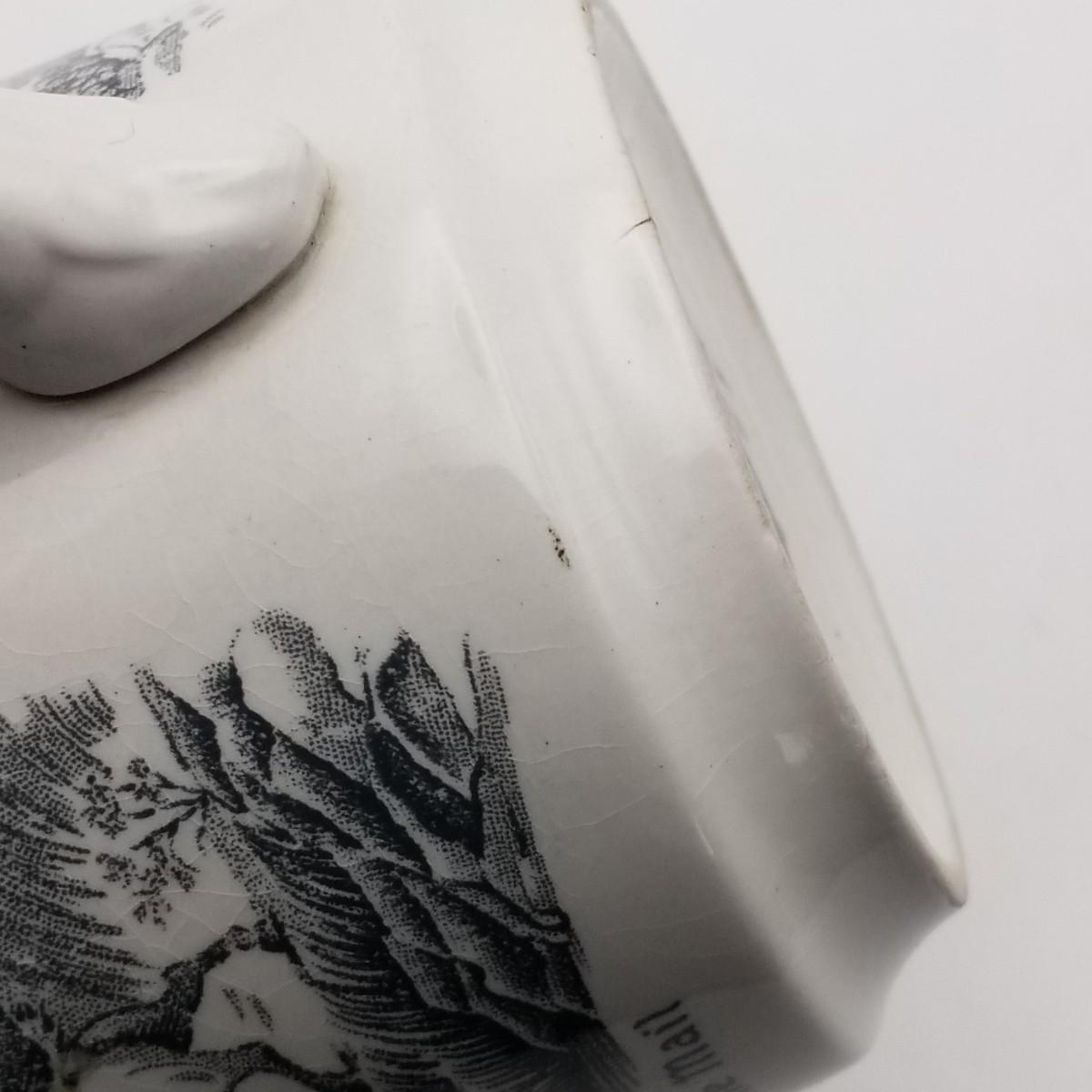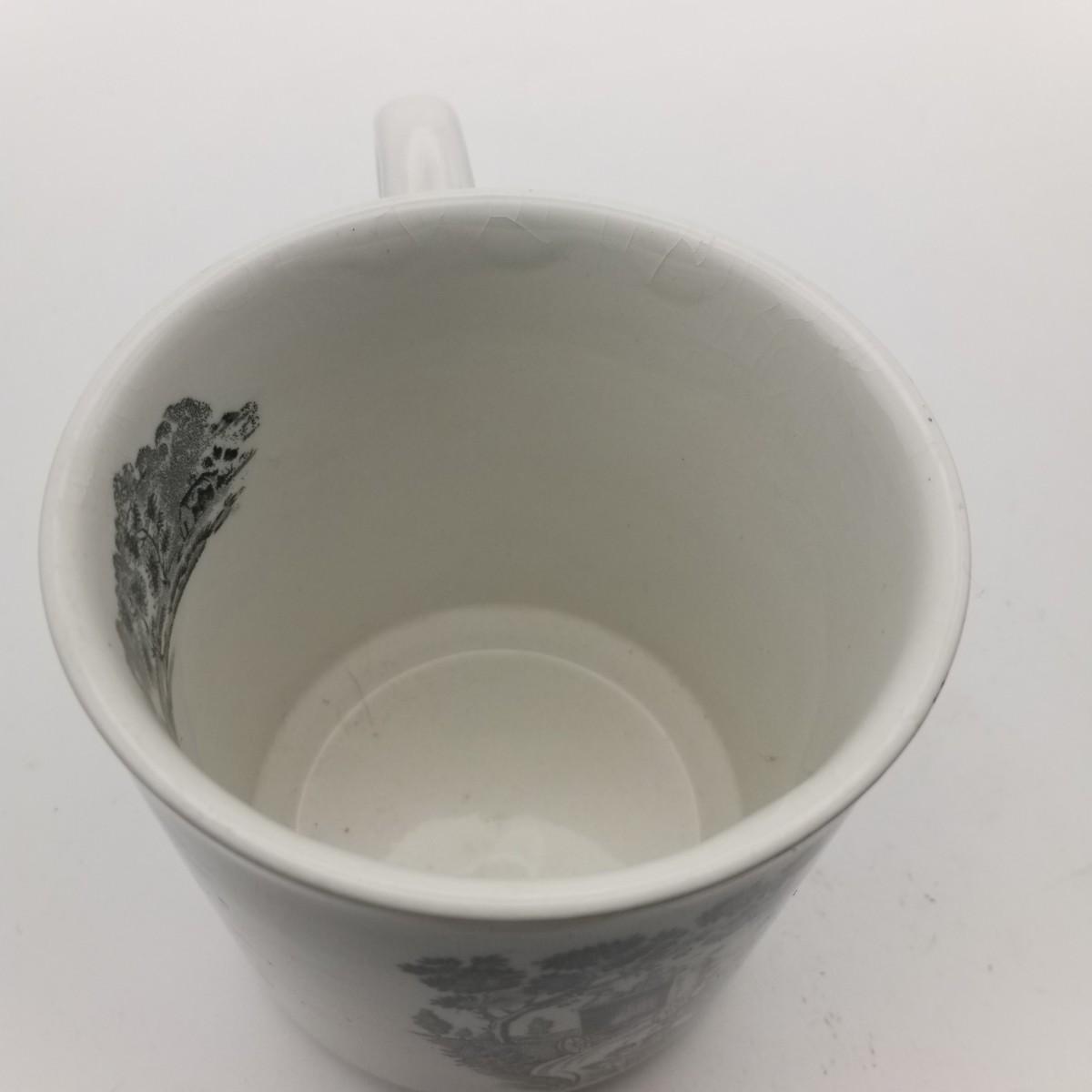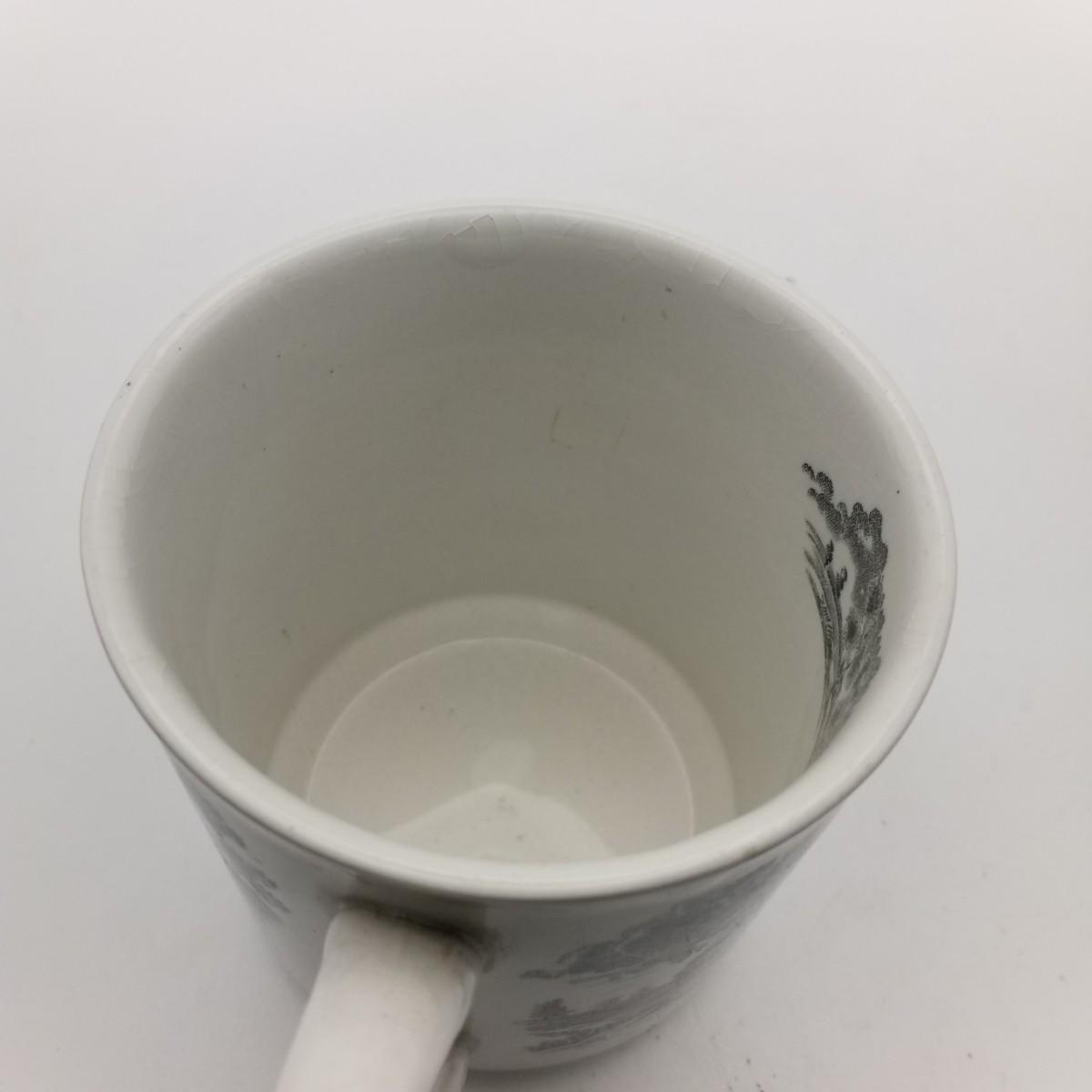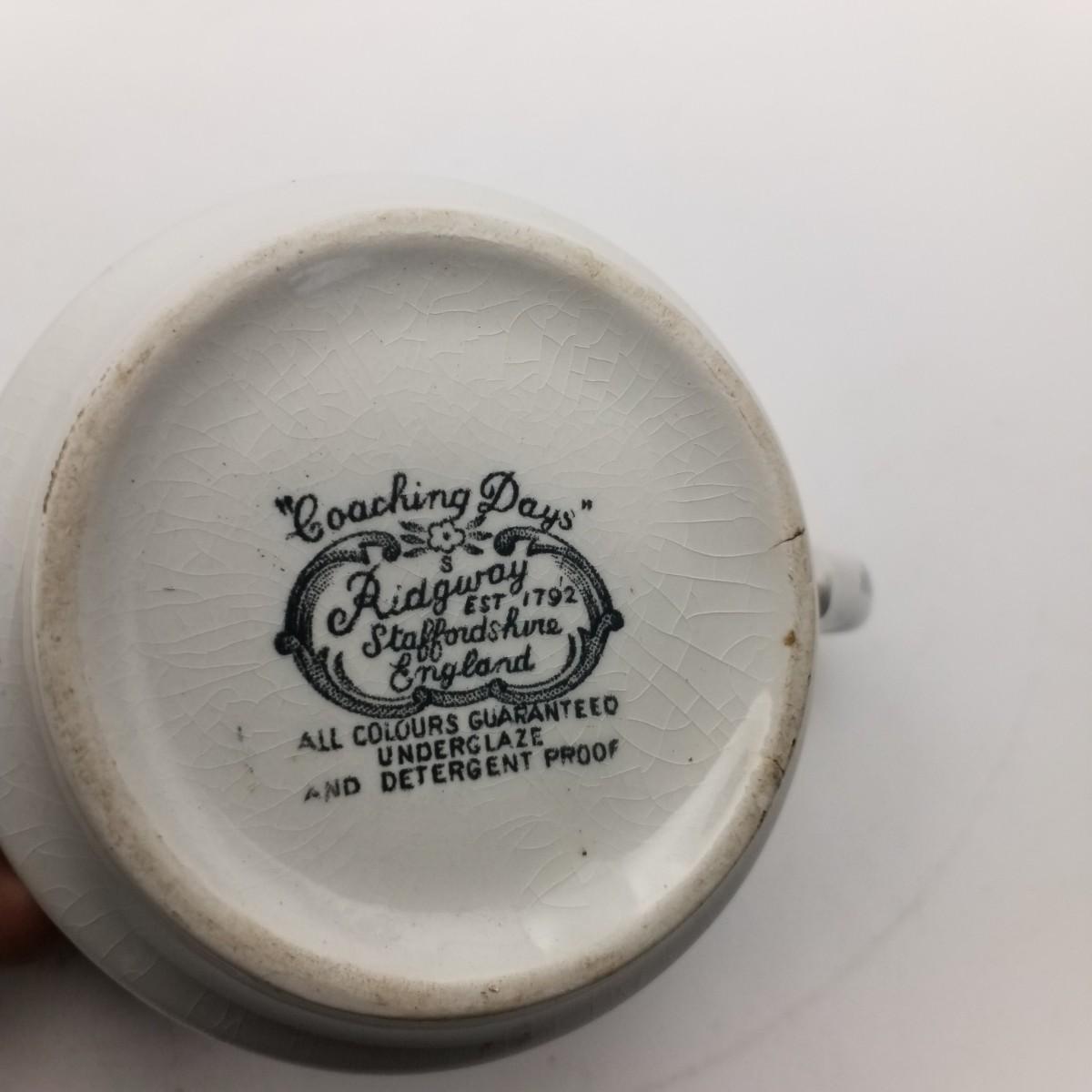 White and Black "Coaching Days" Ridgeway Staffordshire Pottery England Mug Cup (Transferware / Earthenware). Some crazing on bottom of mug near maker's mark, near where handle and mug joins near the bottom of the mug, and where the glaze pooled during manufacture; otherwise interior of mug appears unaffected. Measures approximately 3 1/2 wide x 5 (with handle) x 3 1/2 inches.