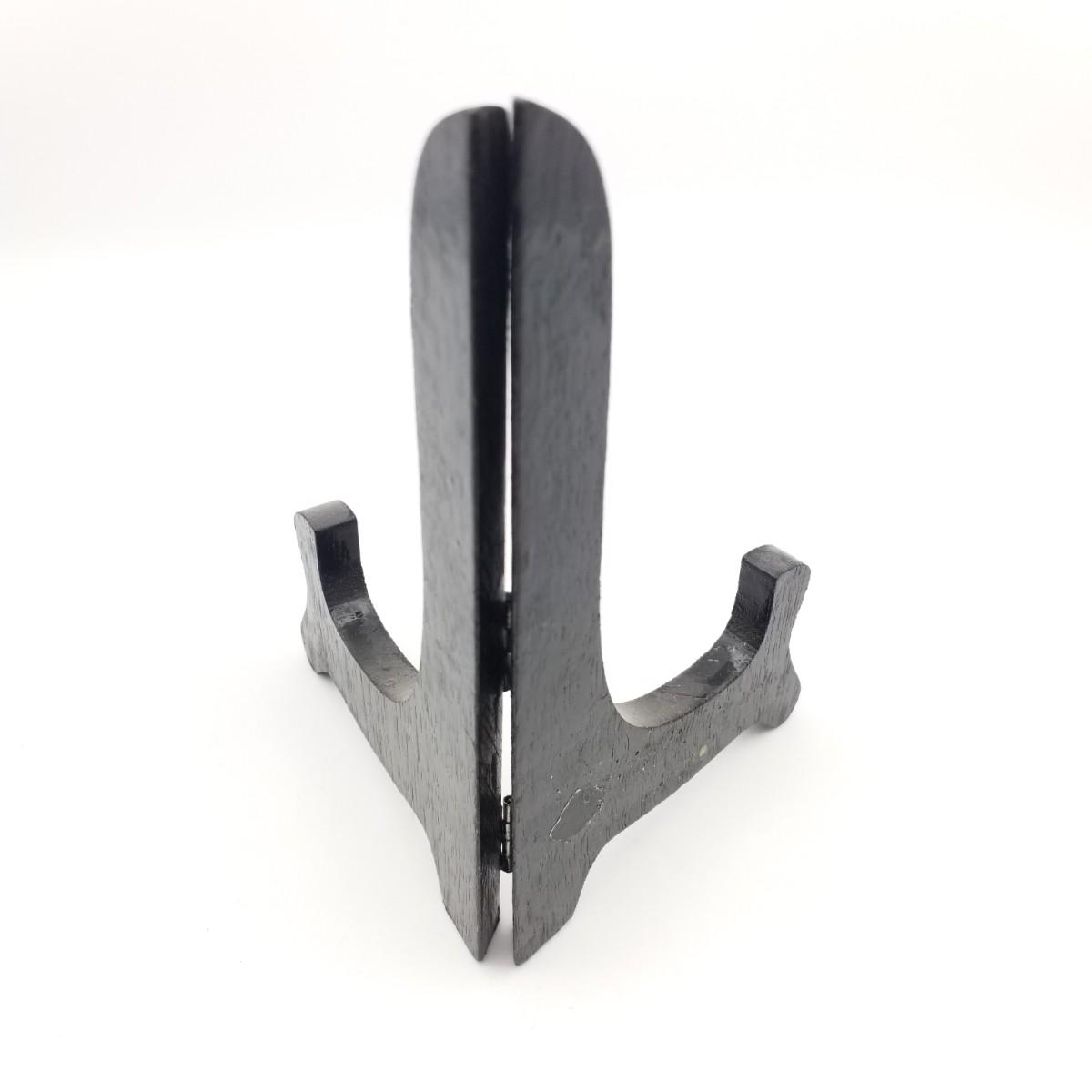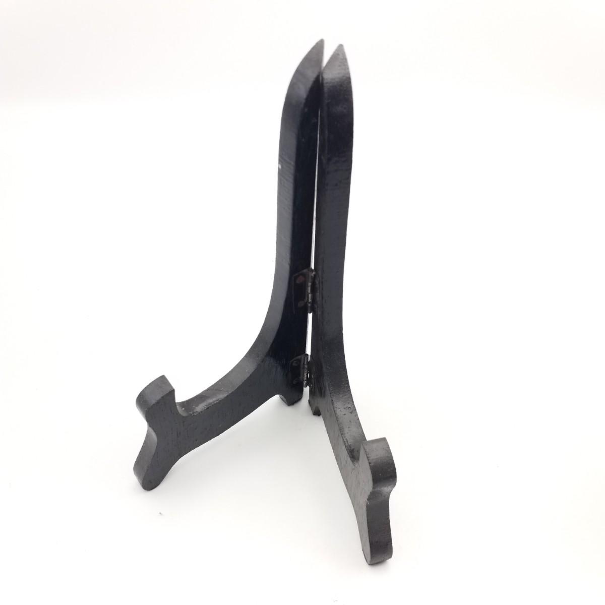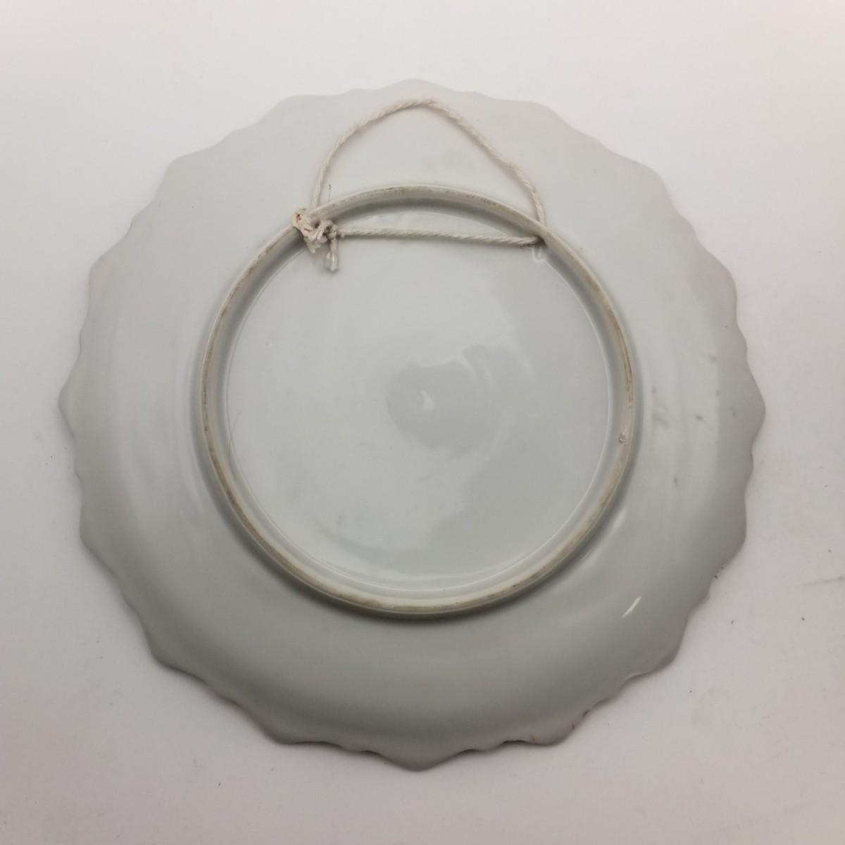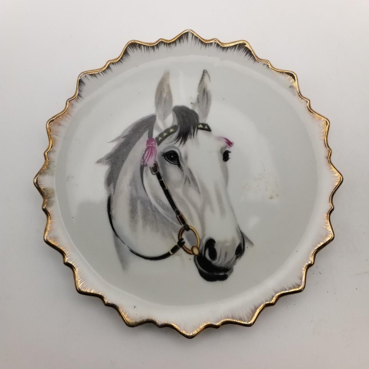 Gold Rimmed Porcelain White Black & Pink Horse Profile Head Hanging Wall Plate / Collectors Plate. Ready-to-hang plate with 2 loop holes in back rim of plate. Measures approximately 7 1/2 inches x 1 inches. Includes vintage decorative folding wood plate stand / easel (approximately 3 x 4 x inches when open). Plate has decorative "starburst" style rim edged in gold. No visible cracks or chips.