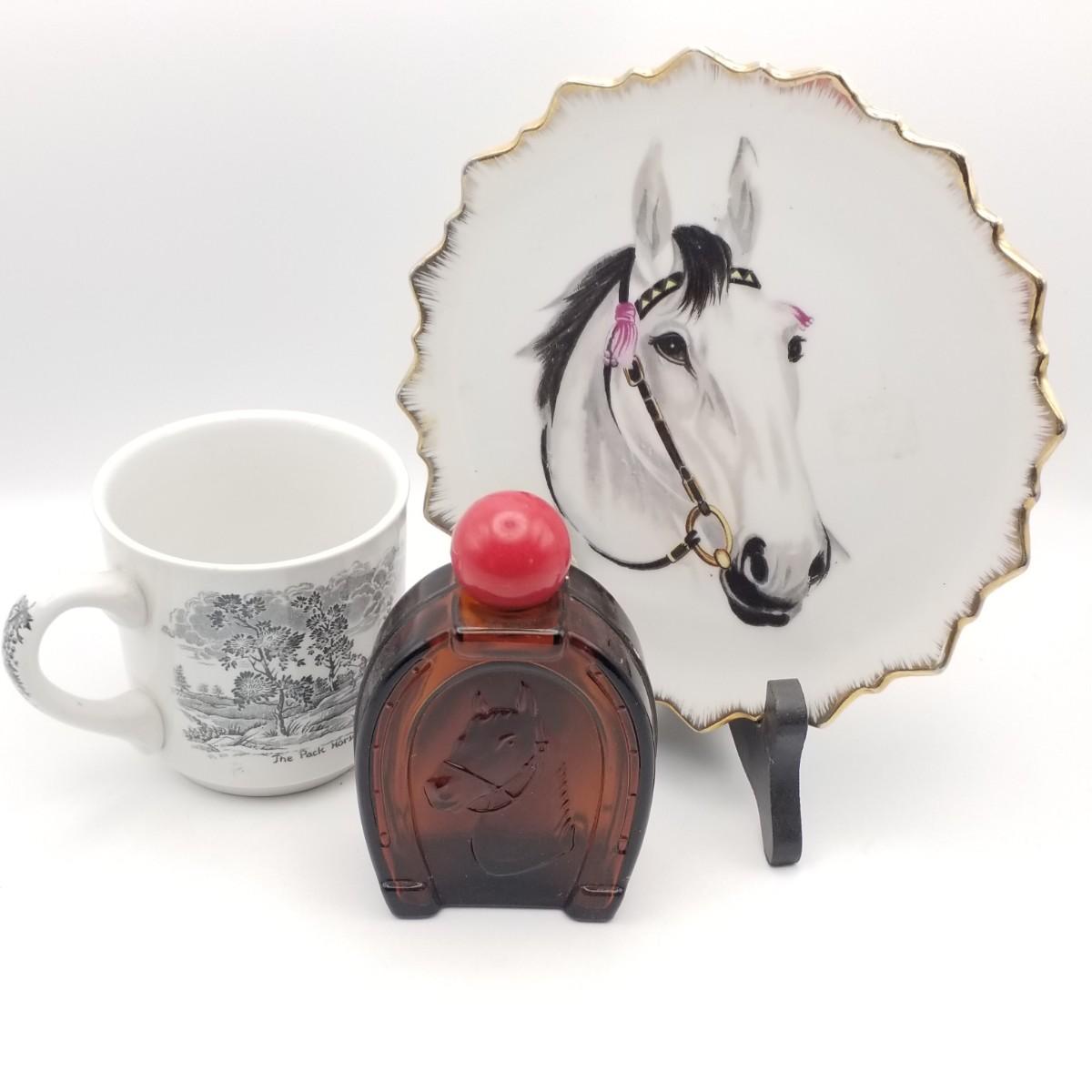 Lot of 3 Vintage Horse Collection: Gold Rim Porcelain Horse Profile Head Wall Plate Avon "Triple Crown" After Shave Bottle "Coaching Days" Ridgeway Staffordshire Pottery England Mug Cup Earthenware